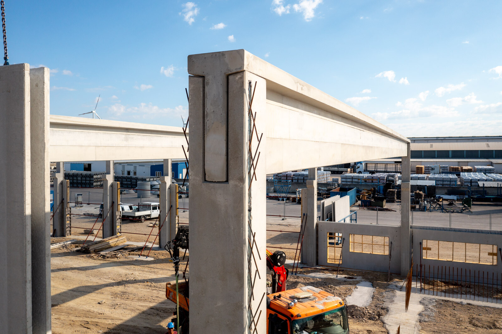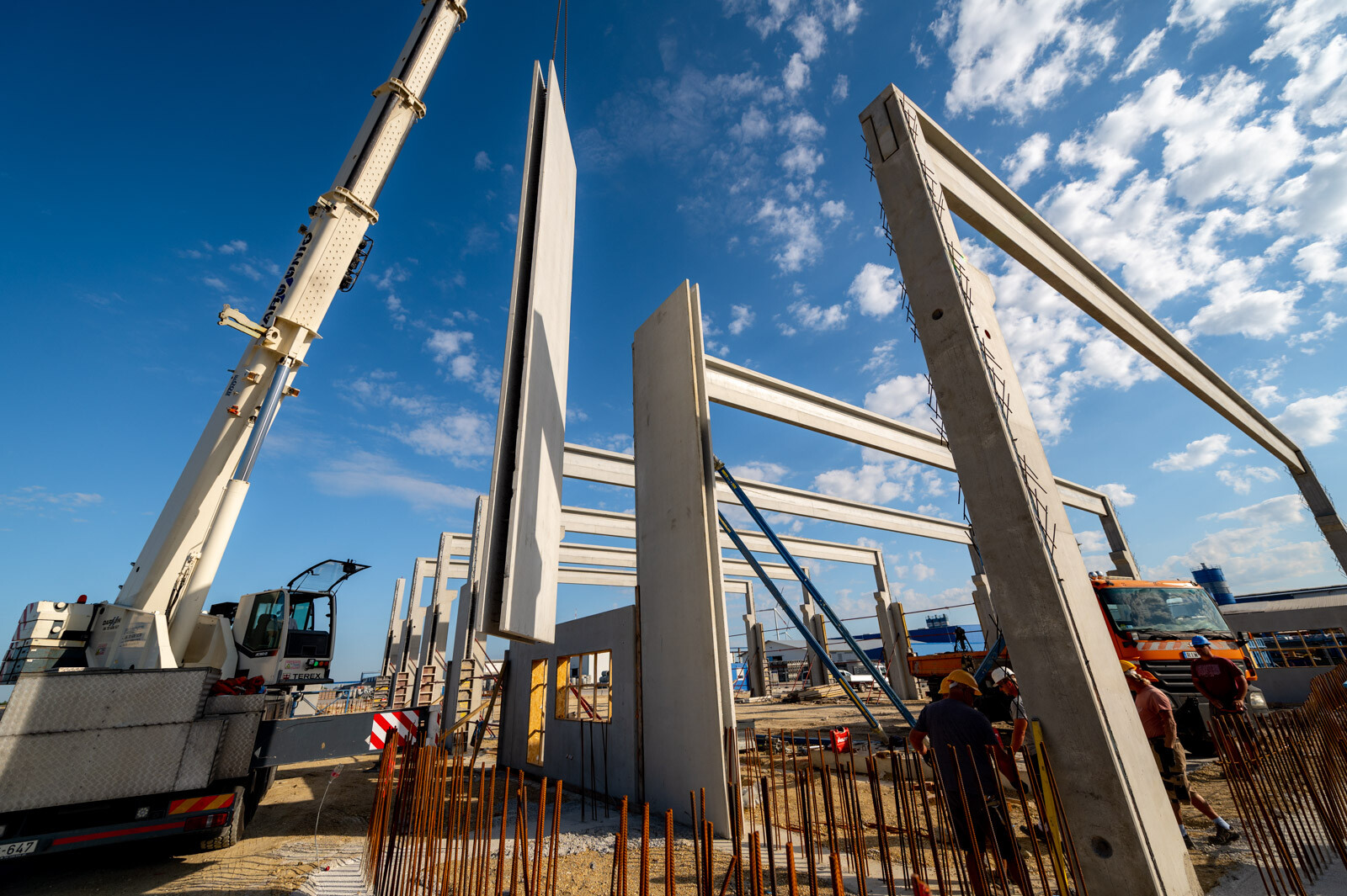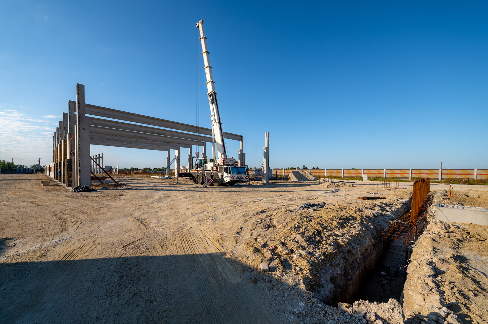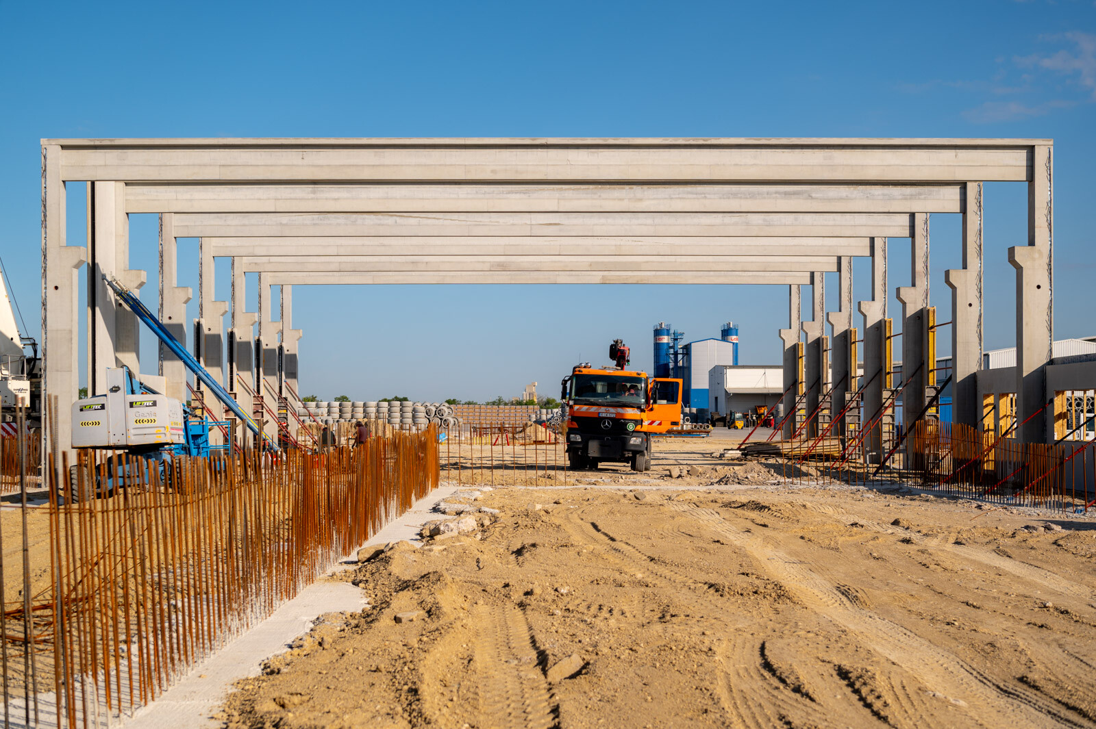 A töltőállomás építéséről Takács Gábor, az előregyártott vasbeton szerkezetek üzletágvezetője elmondta, jelenleg már épül a csarnokváz-szerkezet, ezenkívül az összes pillér és az összes feszített szelemen a helyére került, továbbá az épületet merevítő vasbeton kéregfalaink beépítése is zajlik.