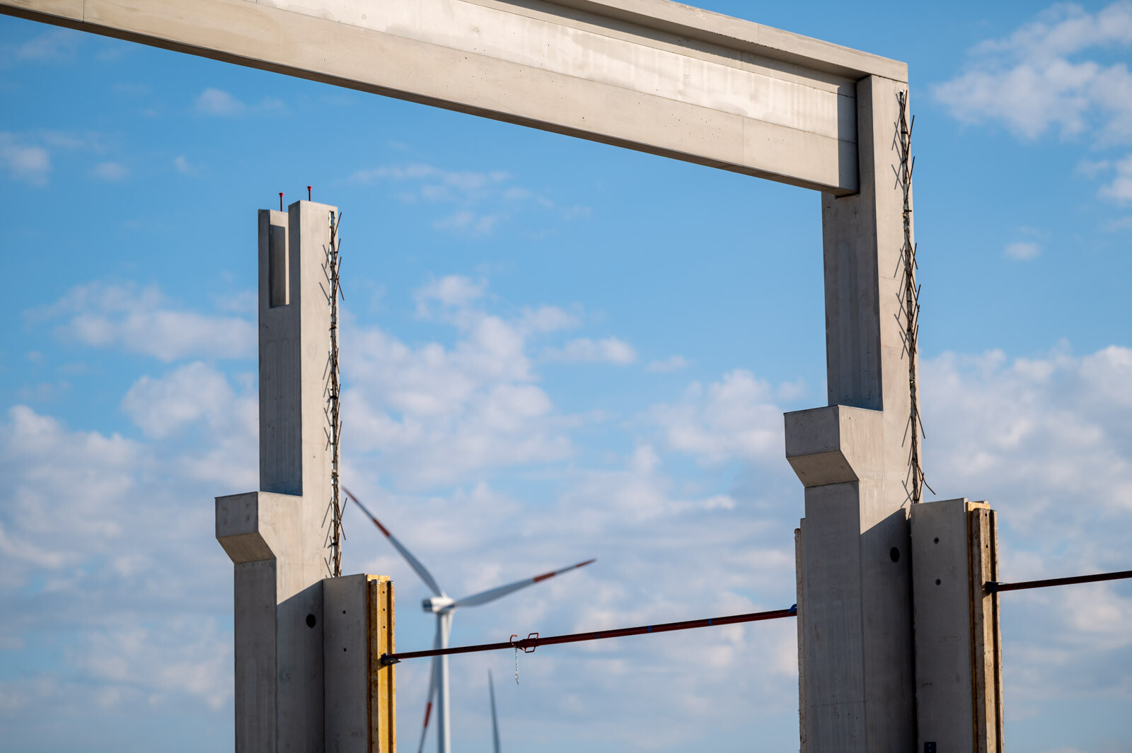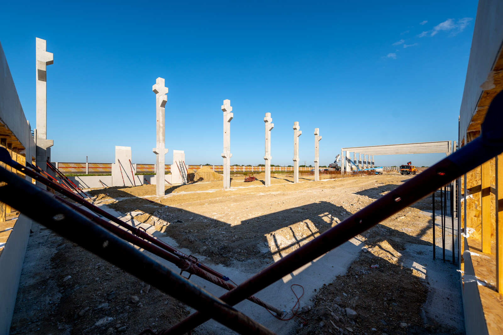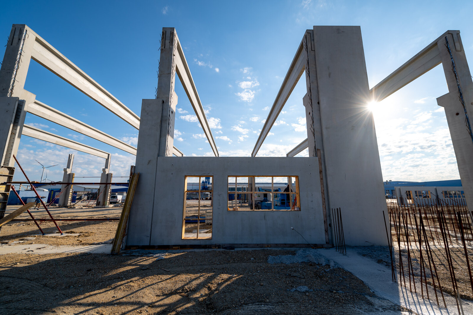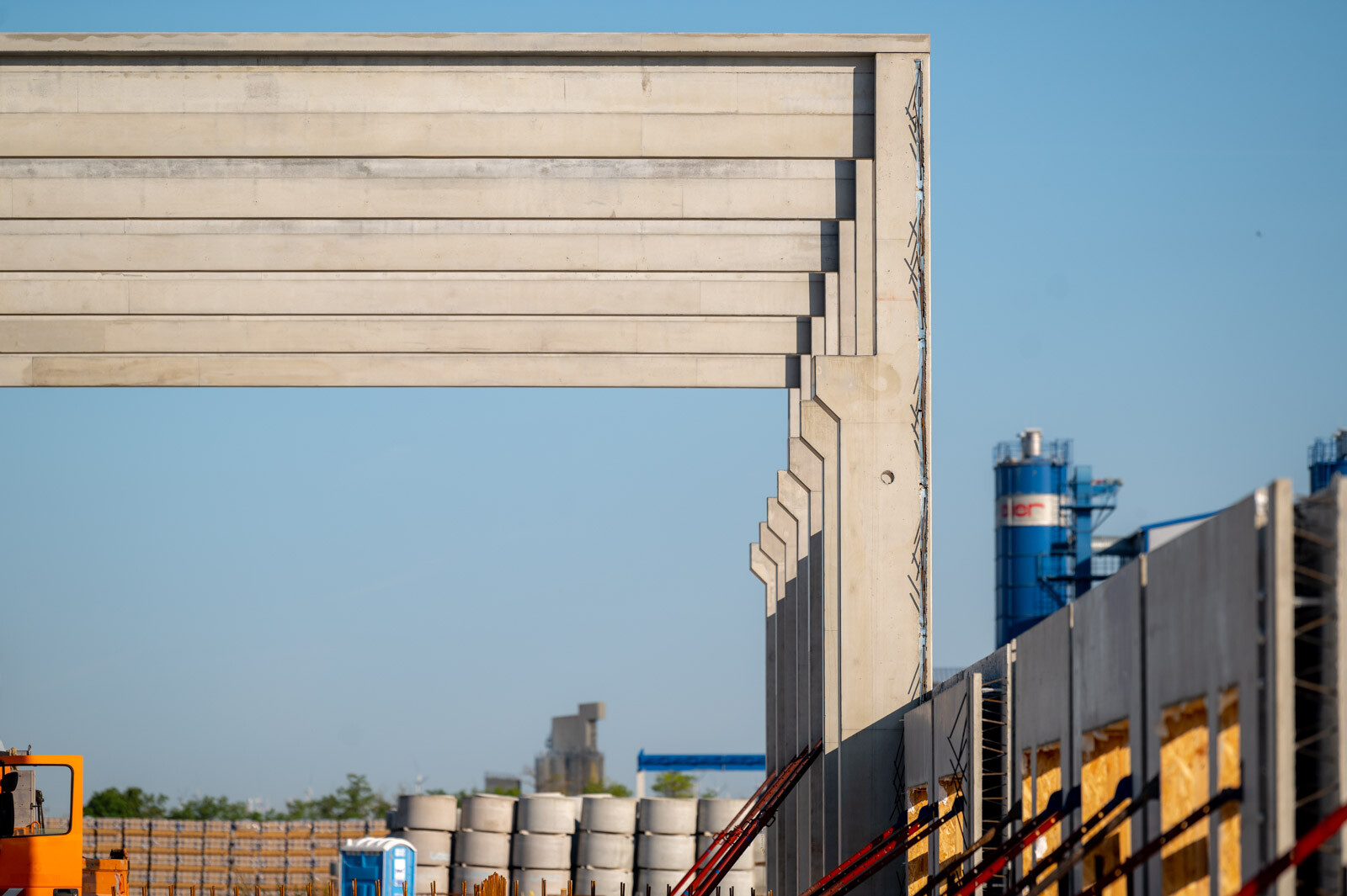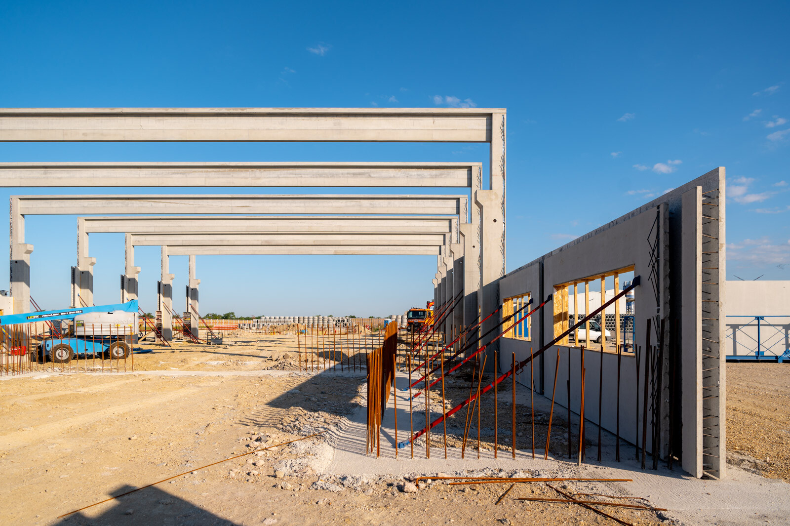 A töltőállomás építéséről Takács Gábor, az előregyártott vasbeton szerkezetek üzletágvezetője elmondta, jelenleg már épül a csarnokváz-szerkezet, ezenkívül az összes pillér és az összes feszített szelemen a helyére került, továbbá az épületet merevítő vasbeton kéregfalaink beépítése is zajlik.