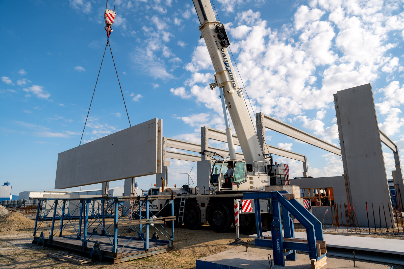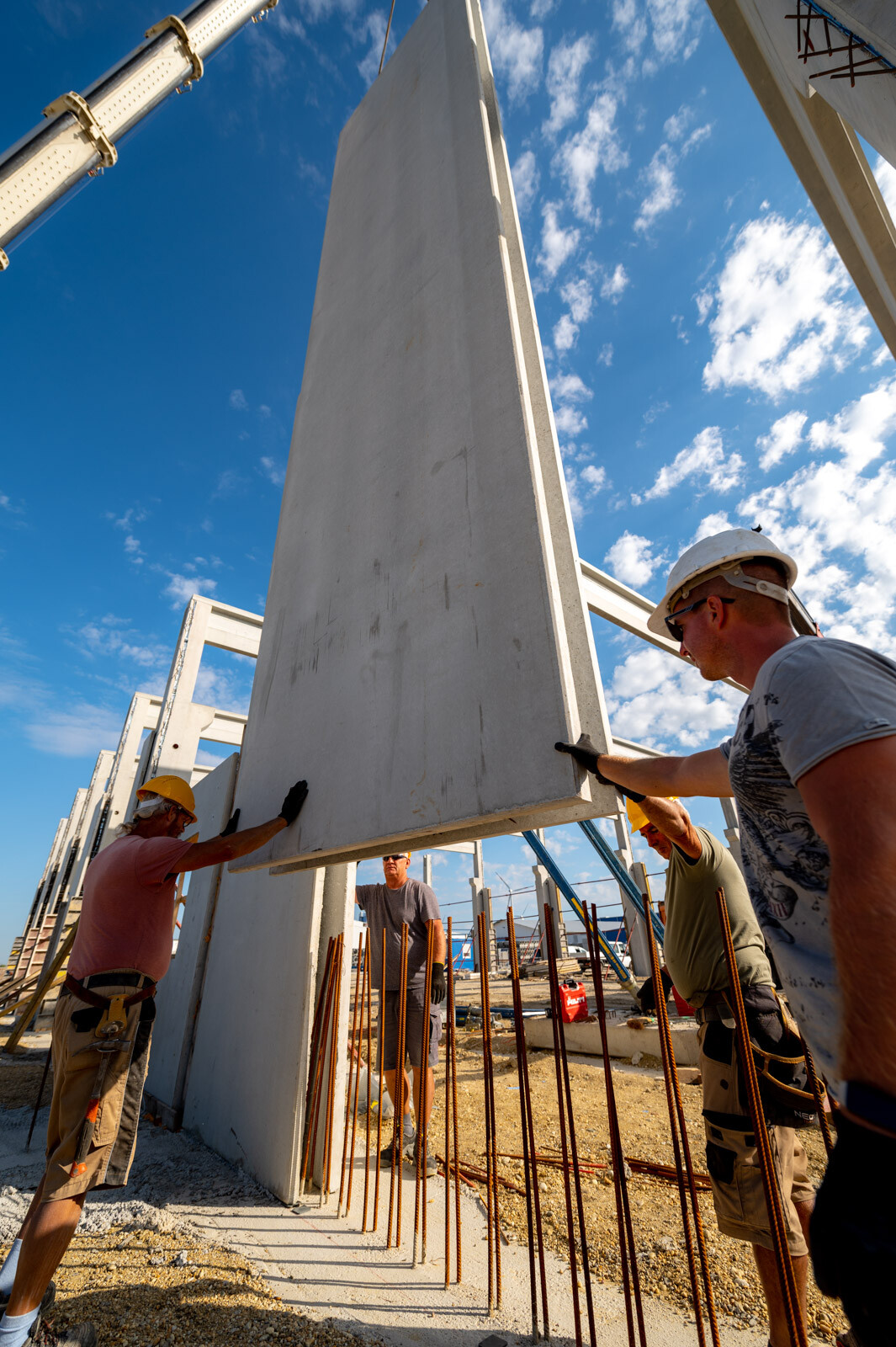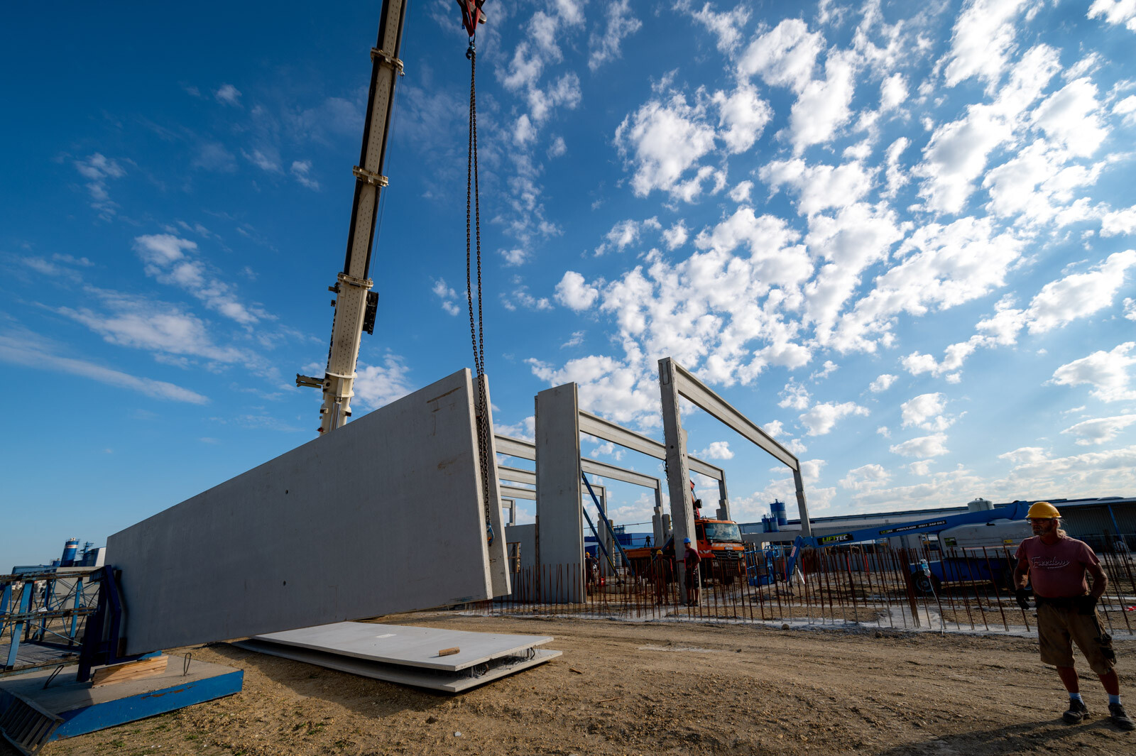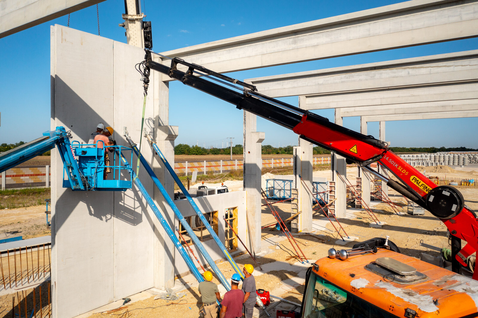 „Mivel a műhely darupályával is rendelkezni fog, indokolt volt a nagy belmagasság megvalósítása. Az épület körítő falaihoz a nagy belmagassághoz igazodva több mint 9 méter magas Leier kéregfalakat építettünk be. Ahogyan korábbi projektjeinknél, úgy most is elmondhatjuk, az itt beépített vasbeton kéregfalak akár 240 perces tűzállósági értéket is elérhetnek” – fűzte hozzá Takács Gábor.