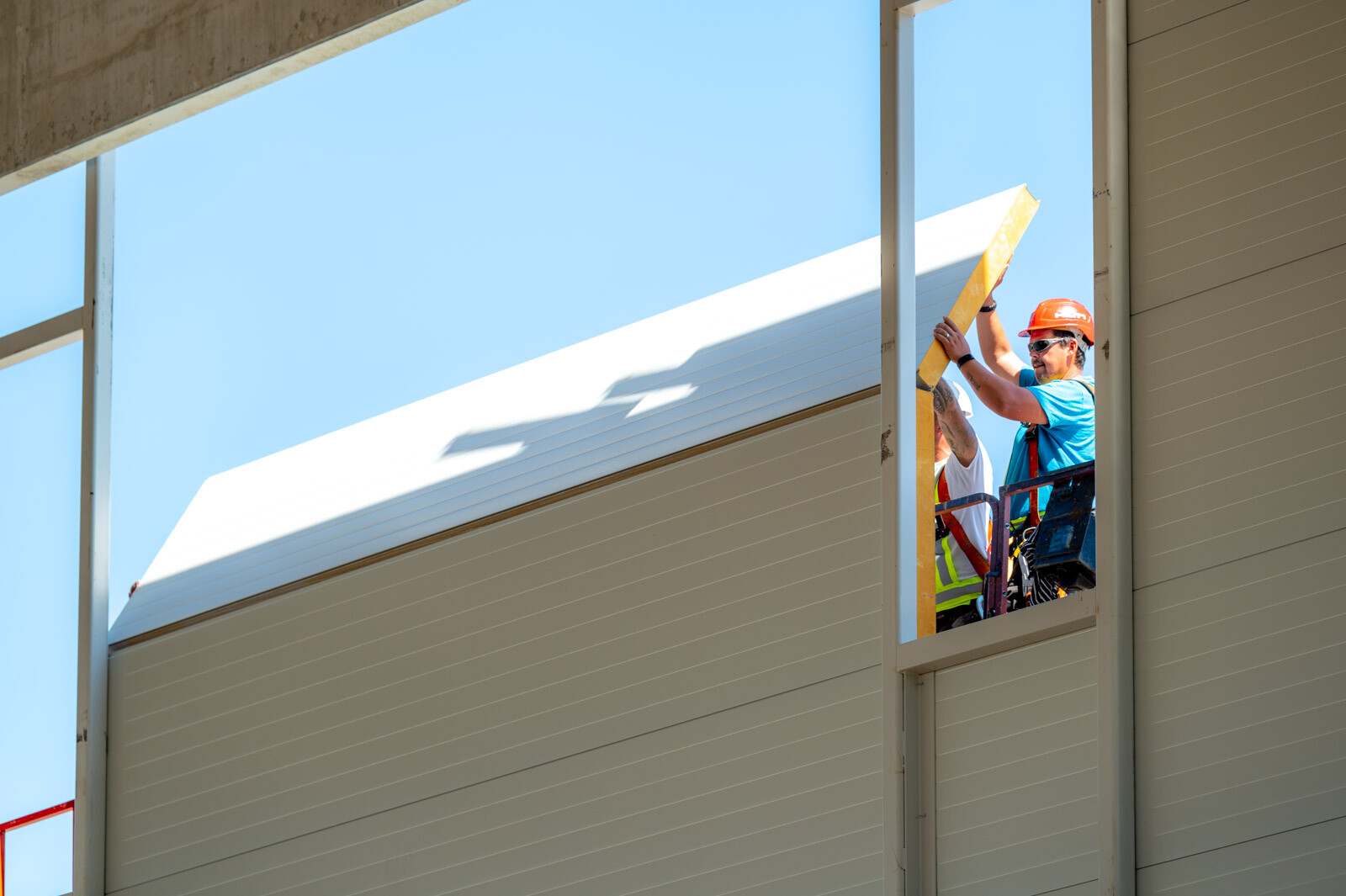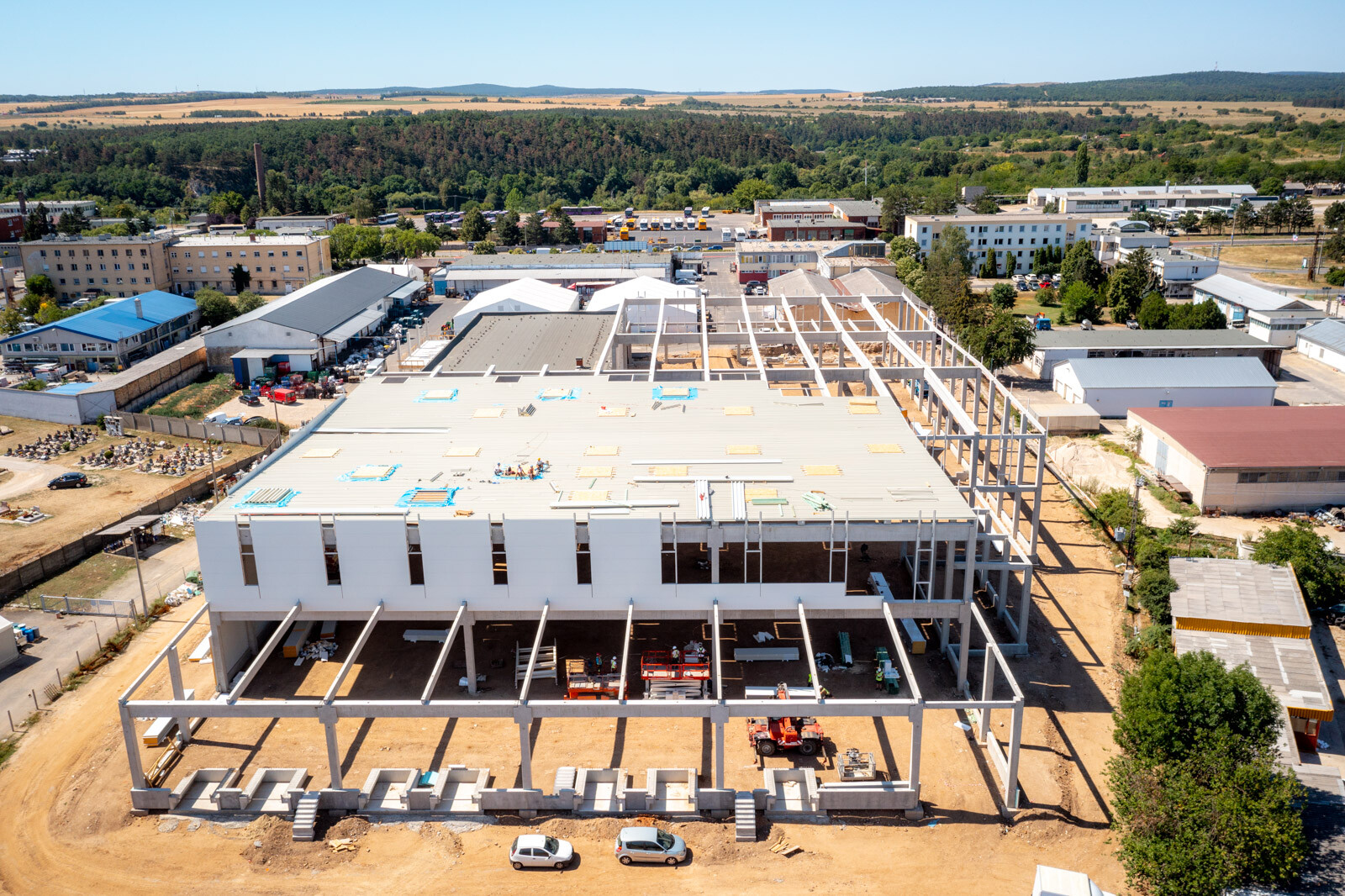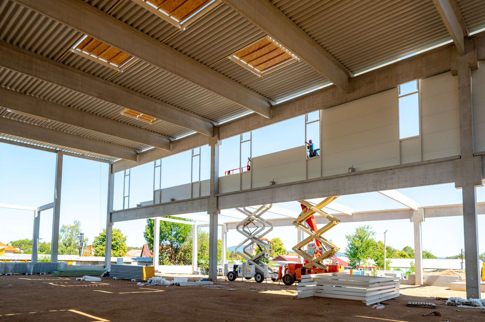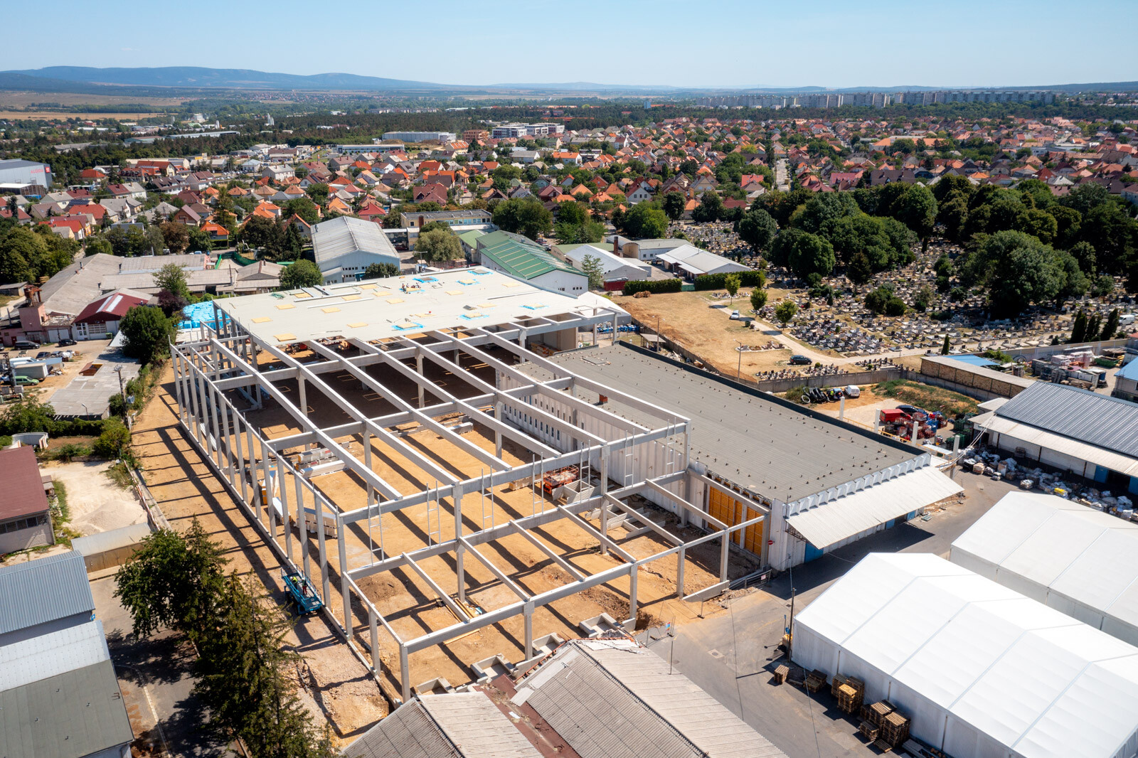 „Jelenleg a homlokzati hőszigetelt szendvicspanelek elhelyezése, a trapézlemez tetőfedés készítése, a tető hőszigetelése, a csapadékvíz elleni szigetelés, valamint a füstelvezető kupolák elhelyezése zajlik.”