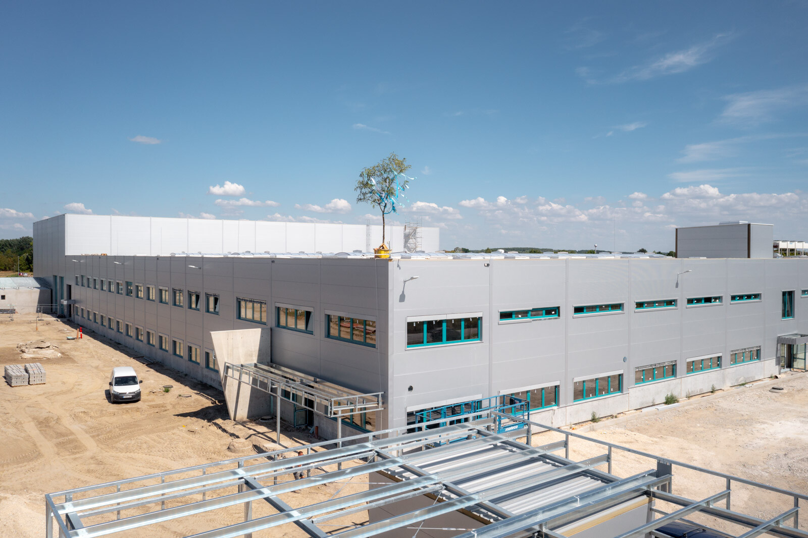A Merkbau kivitelezésében közel egy éve zajlanak a munkálatok a szenzorgyártó cég telephelyének bővítésén, amely során mostanra már elérték szerkezetkész állapotuk az üzemi és raktározási céllal létrejövő új épületrészek.
