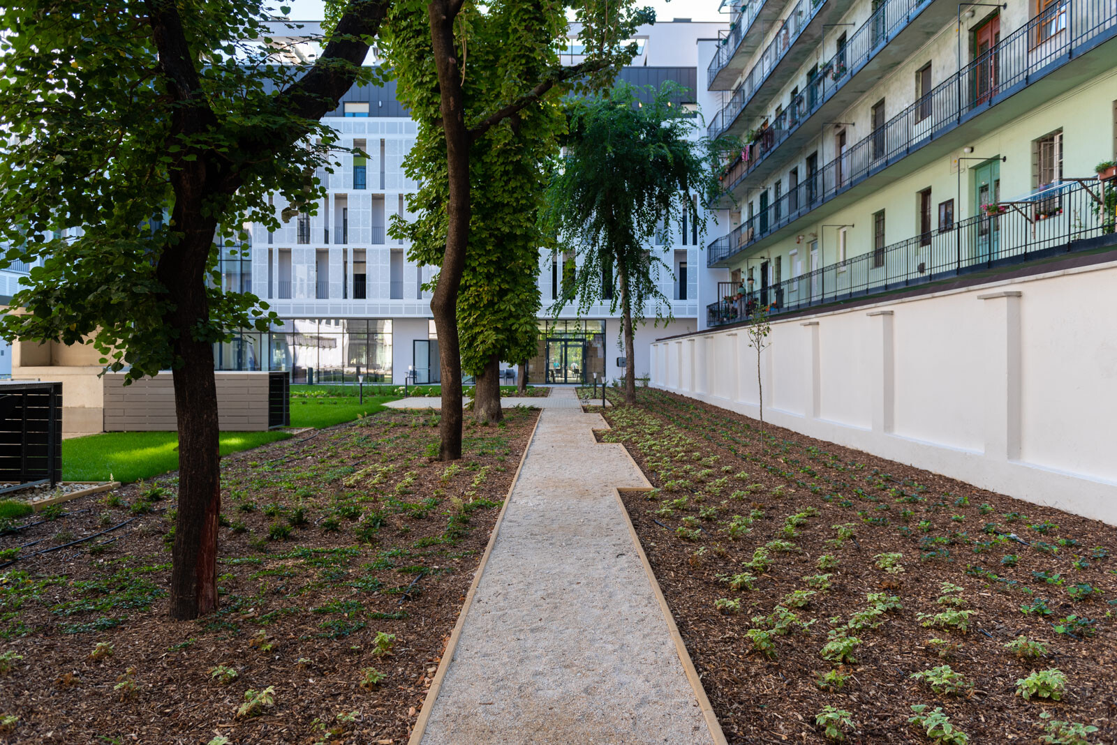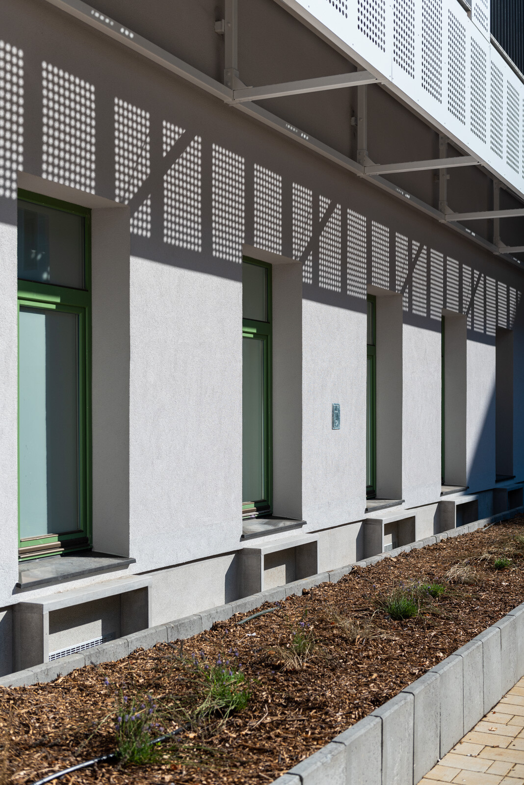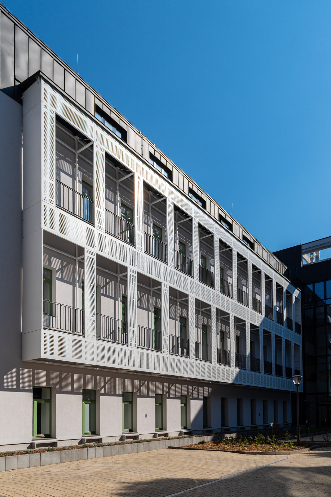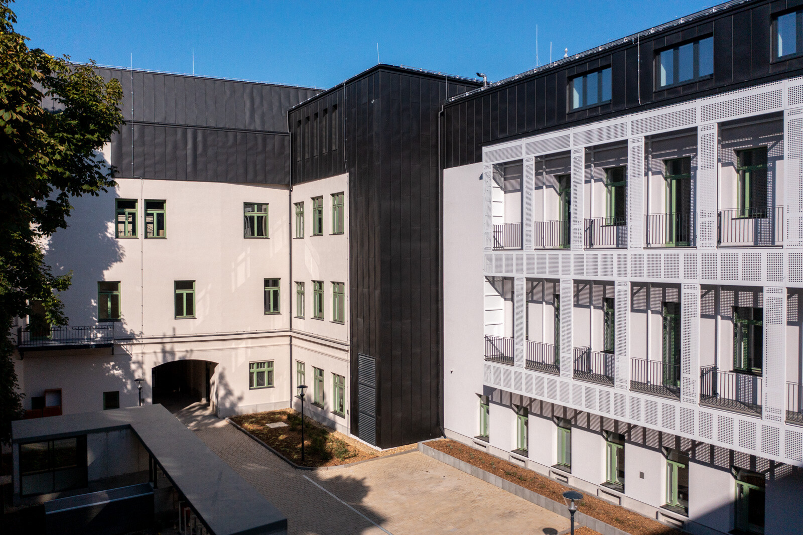 A kültéri területeket illetően létrehoztak az épületegyüttes belső részén egy 530 négyzetméter nagyságú zöldfelületet és egy 45 férőhelyes kerékpártárolót.