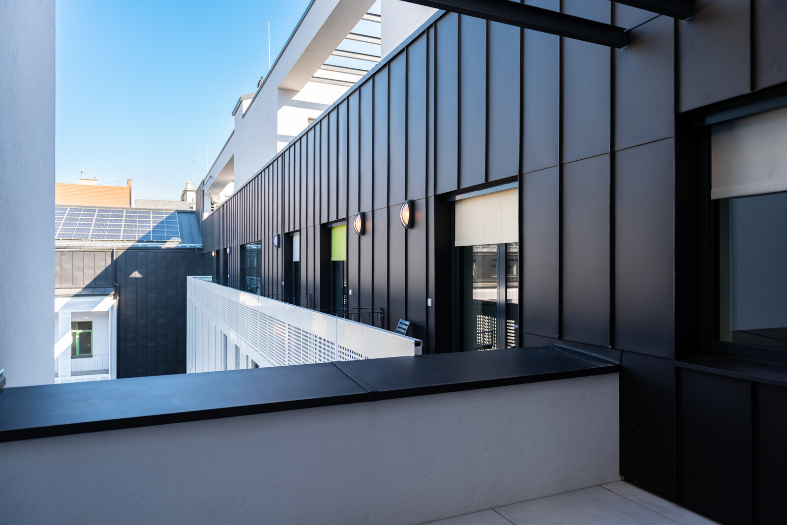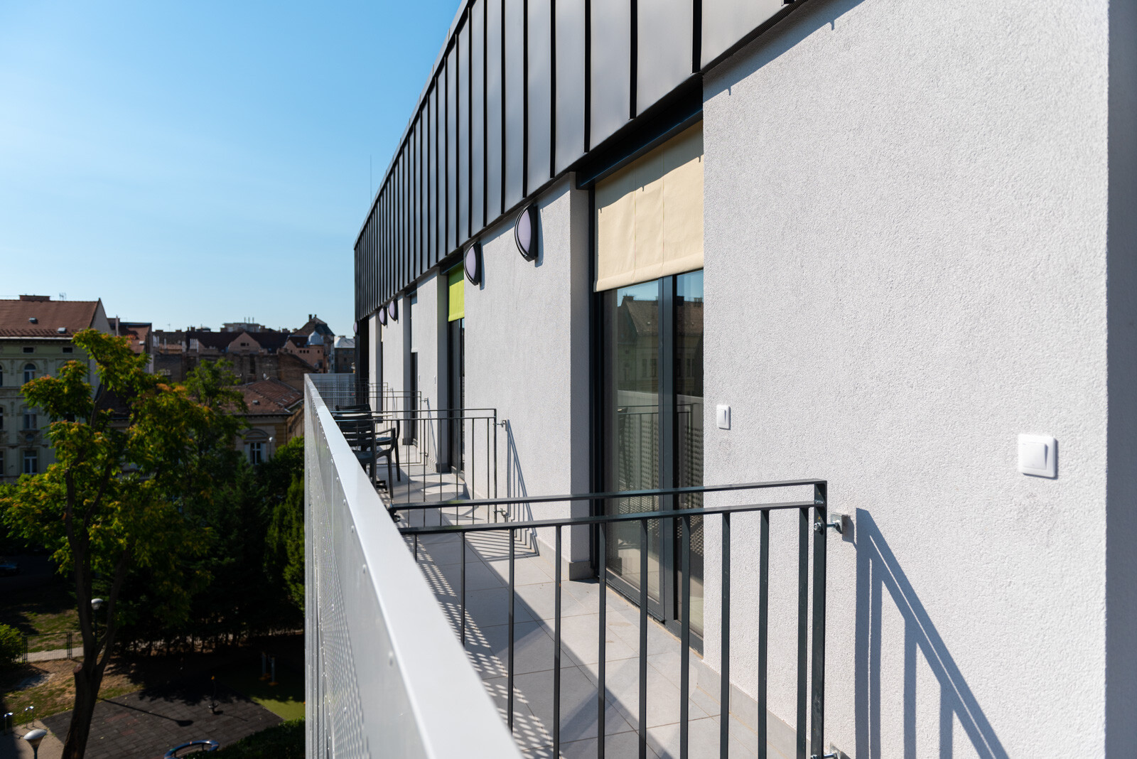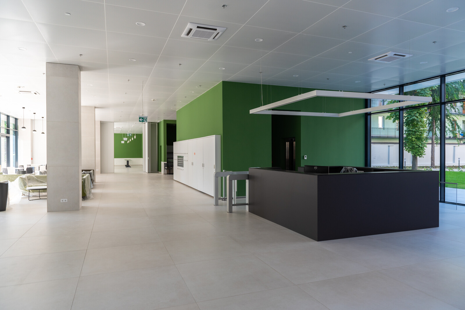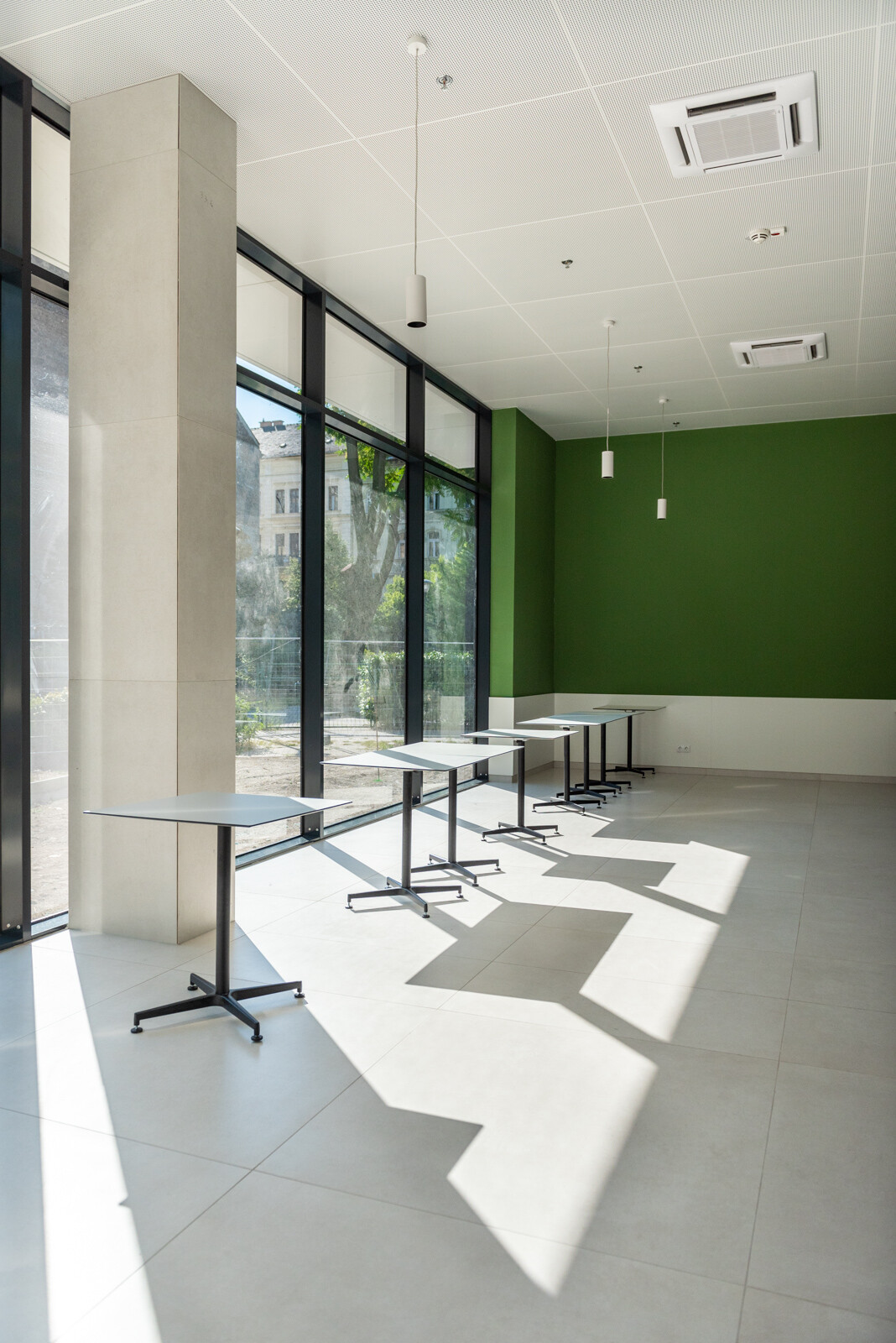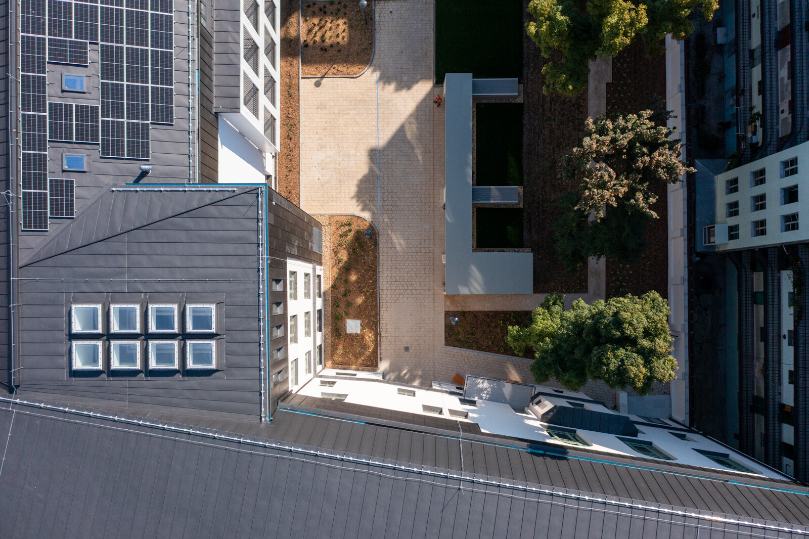 A kültéri területeket illetően létrehoztak az épületegyüttes belső részén egy 530 négyzetméter nagyságú zöldfelületet és egy 45 férőhelyes kerékpártárolót.