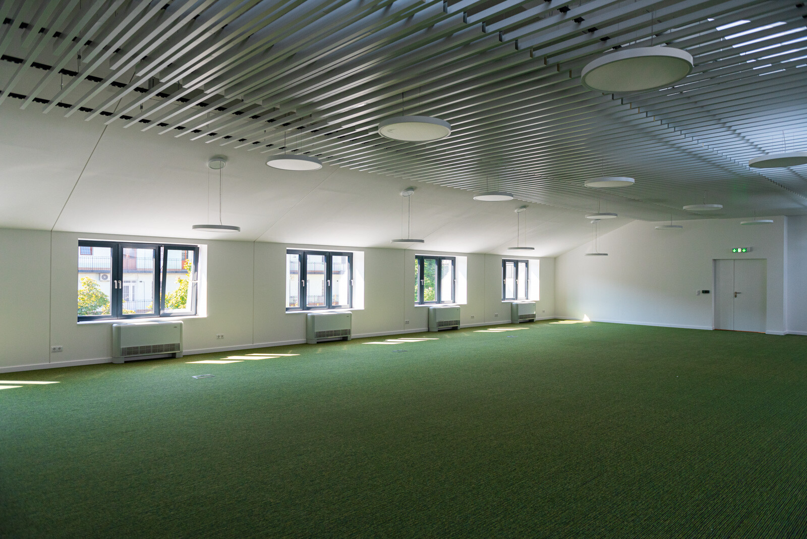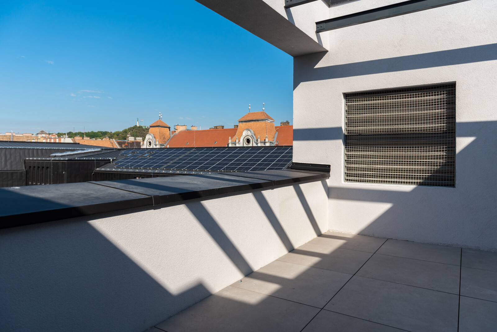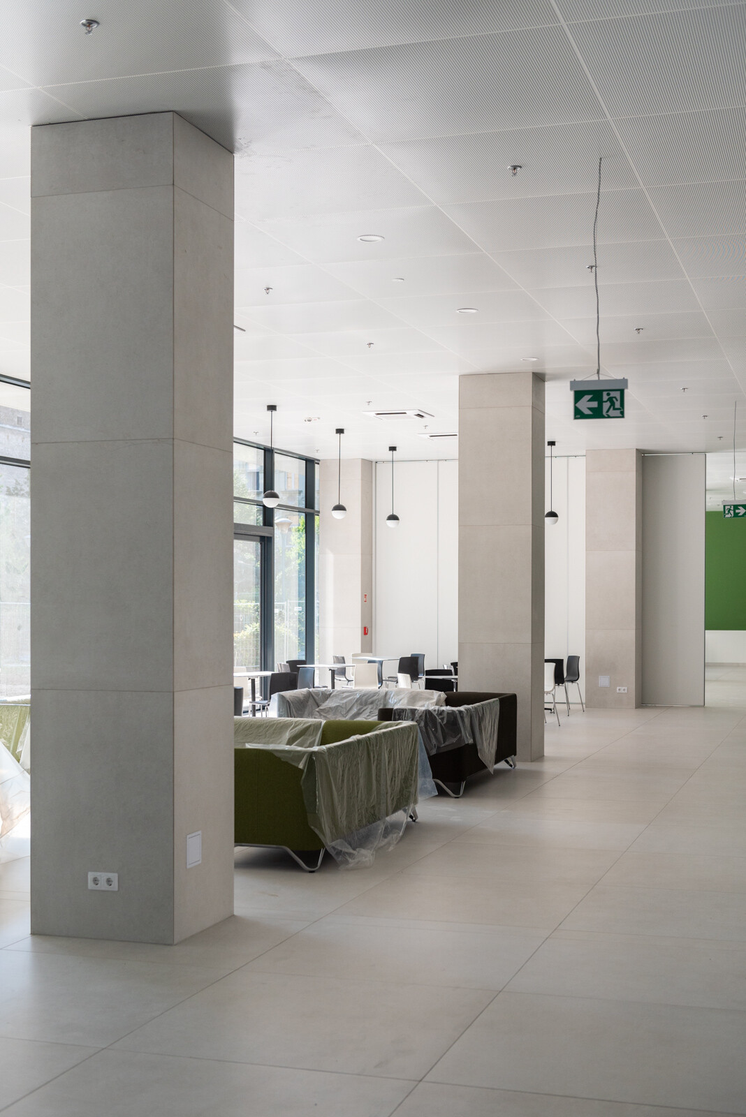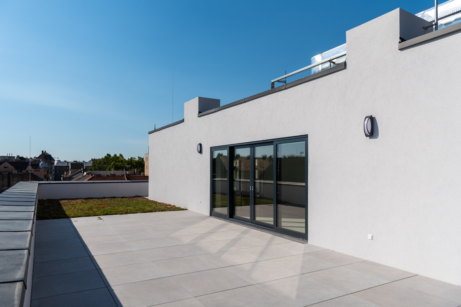 A kültéri területeket illetően létrehoztak az épületegyüttes belső részén egy 530 négyzetméter nagyságú zöldfelületet és egy 45 férőhelyes kerékpártárolót.