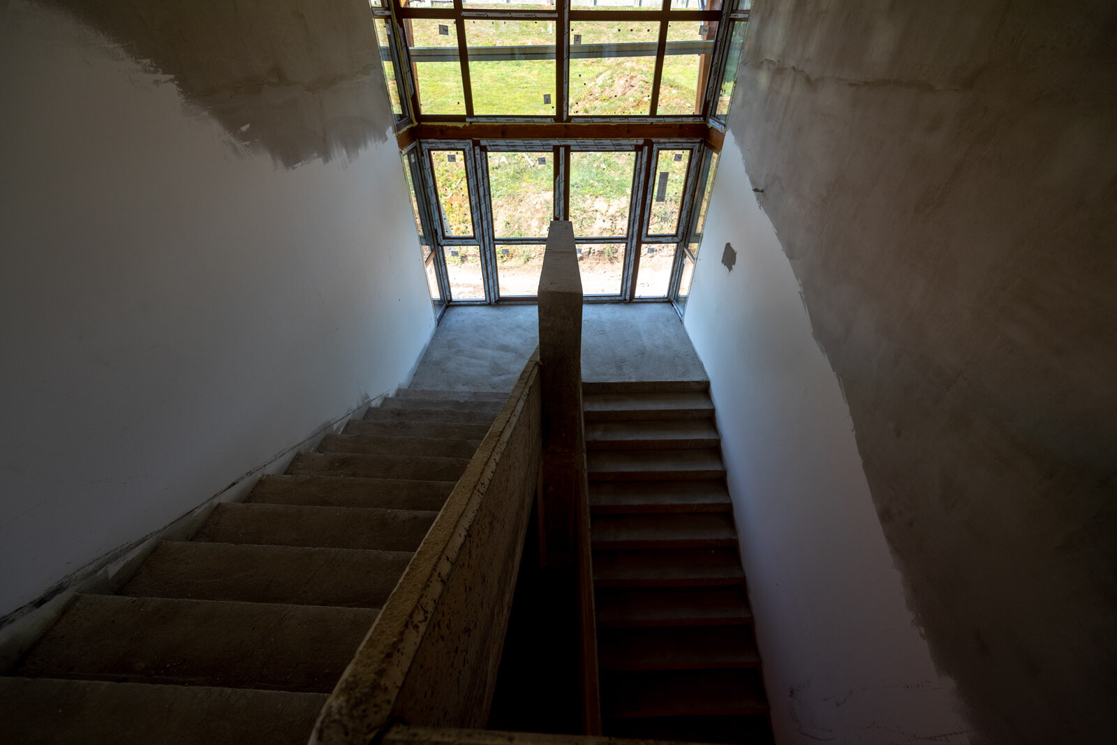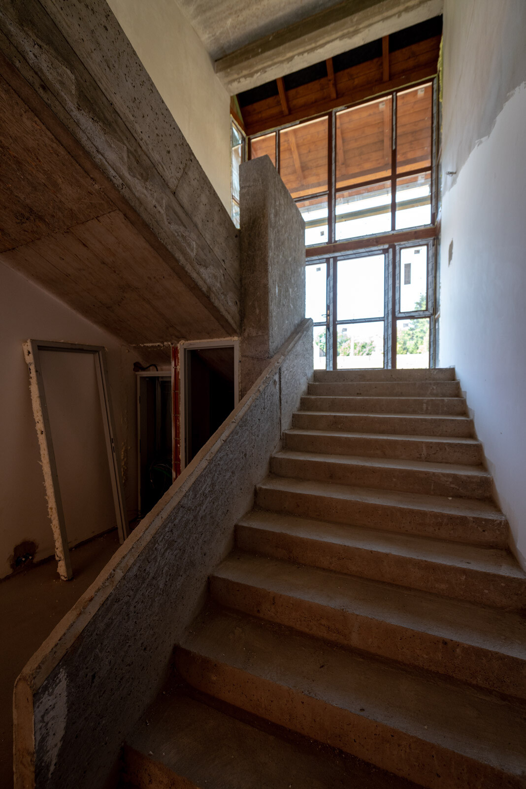 A kétszintes épület alsó szintjén található a bejárat, amely a tereplejtés miatt a közúttól körülbelül 4-5 méterrel lejjebb lévő terepszinthez csatlakozik.