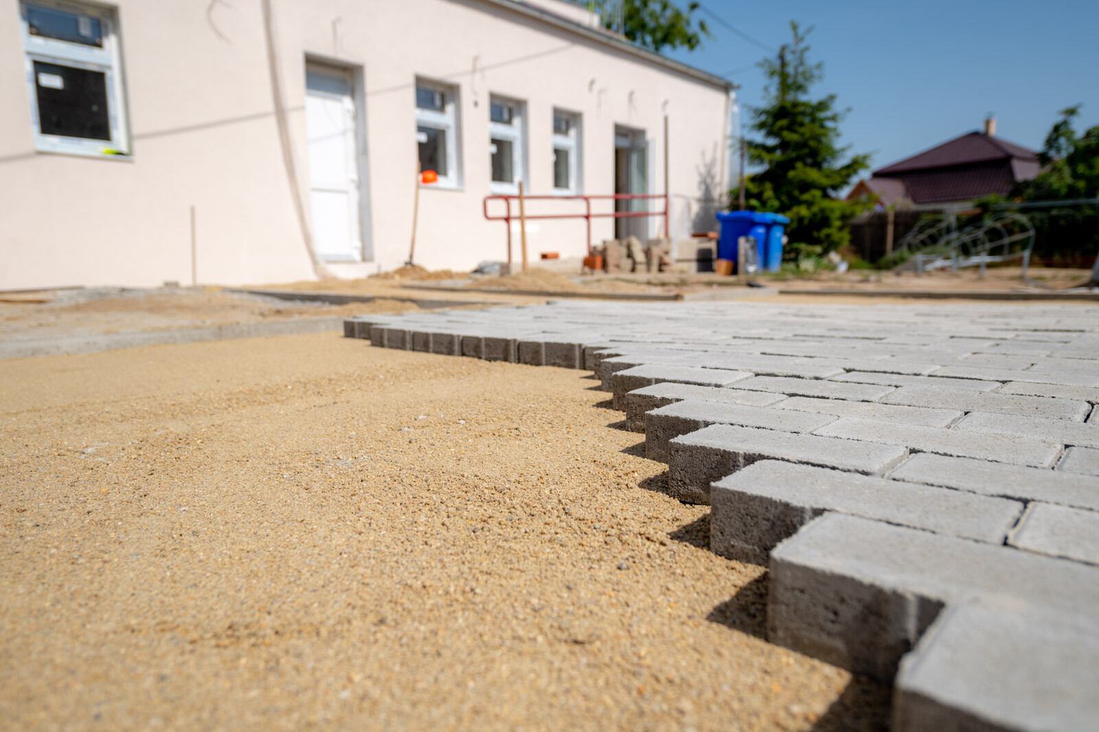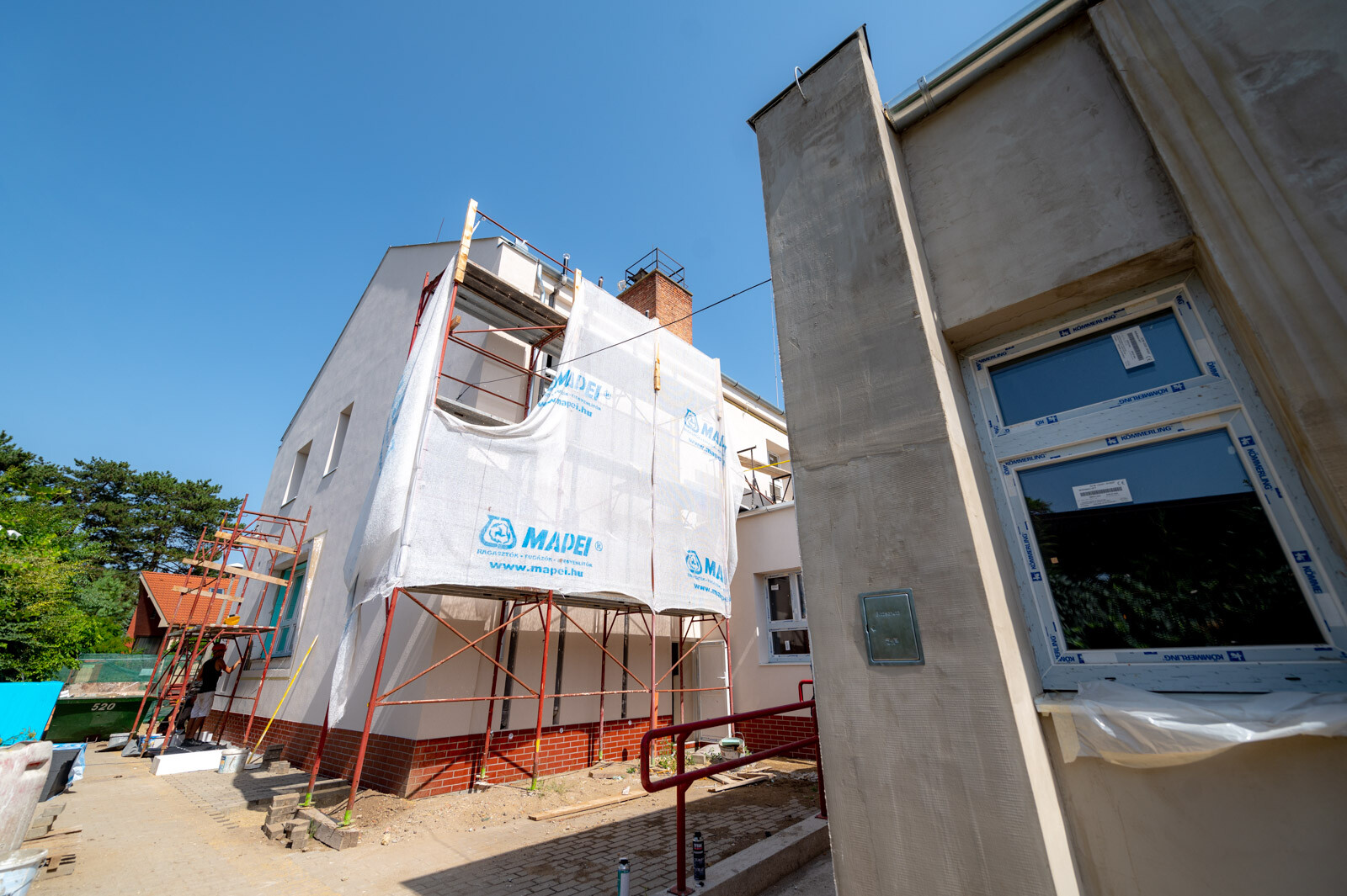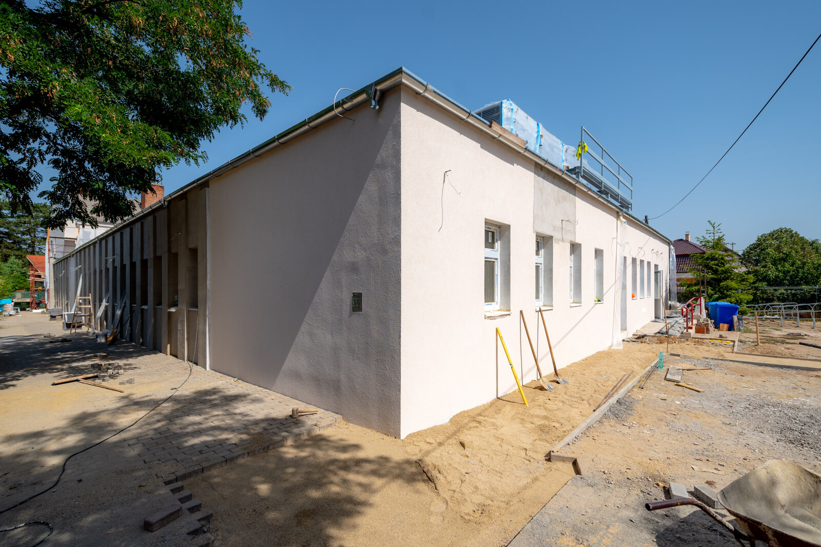 A "B" beruházási elem felével elkészültek, itt még hátravan a napelem rendszer kialakítása, a gépészeti munkarész (belső csövezési munkák), az elektromos befejező munkálatok, a homlokzati színvakolat készítése, a bejáratok előtti lépcső és a rámpák burkolása, az új előtetők készítése, a lakatos szerkezetek elhelyezése, valamint az udvaron, a teraszra felvezető rámpa készítése.