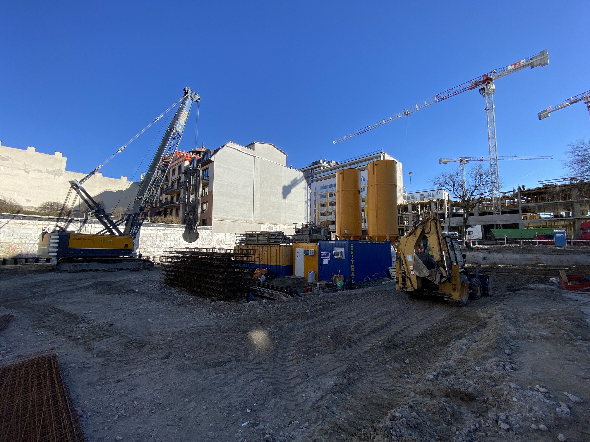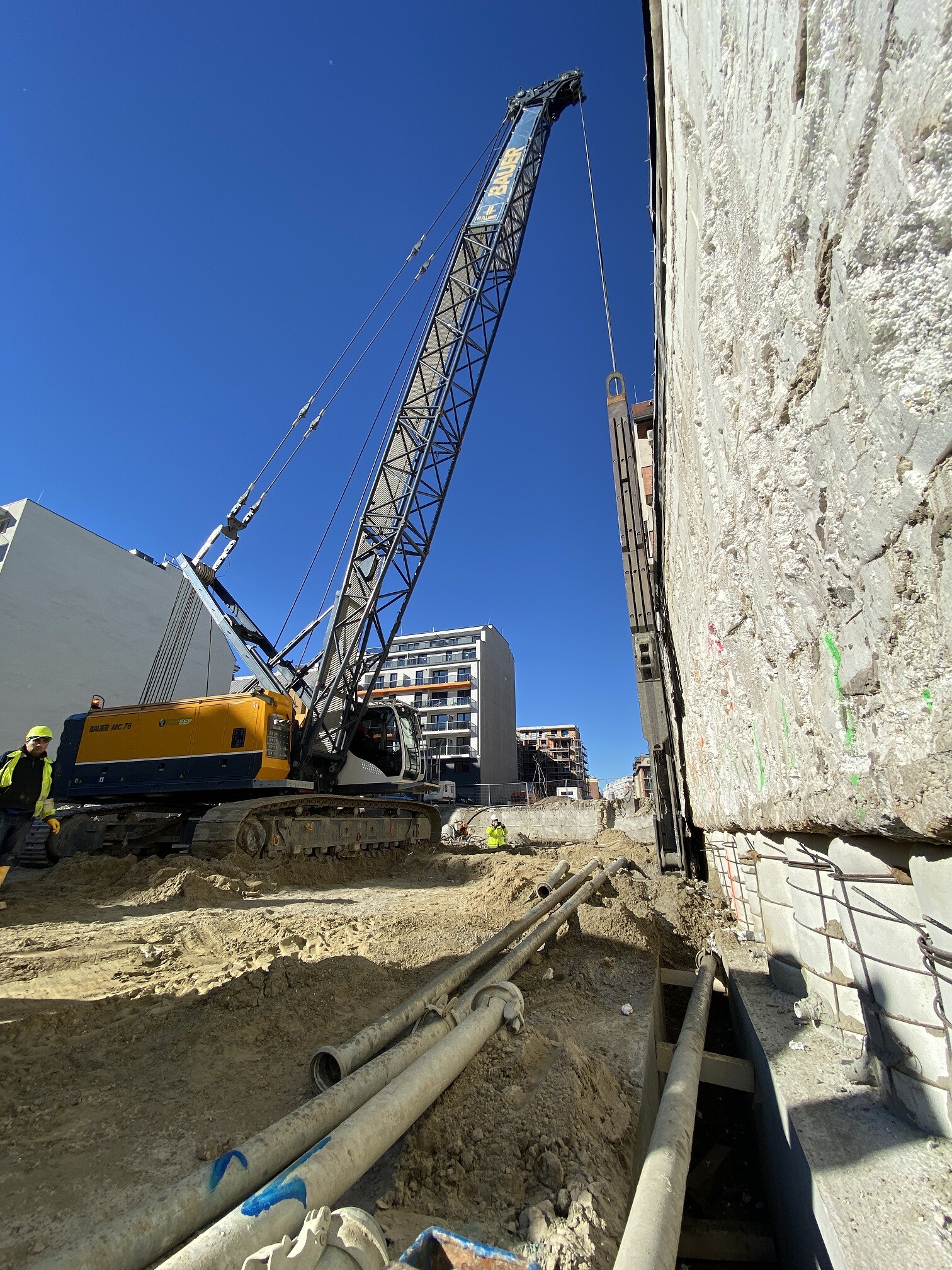 A helyszín adottságai azonban nem csak magasfokú organizálást, hanem különleges megoldásokat is megköveteltek. A projektvezető az itt megvalósult feladatokat illetően projekt egyik specifikus technológiai eljárását emelte ki. Mivel nem csak a réselés, hanem a cölöpözés egy részét is közvetlenül a meglévő épületek mellett kellett elvégezni, a munkafolyamatok részeként ezen a helyen egy olyan egyedi műszaki megoldást is alkalmaztak, amelyet a BAUER a saját fejlesztésű technológiájaként tarthat számon.