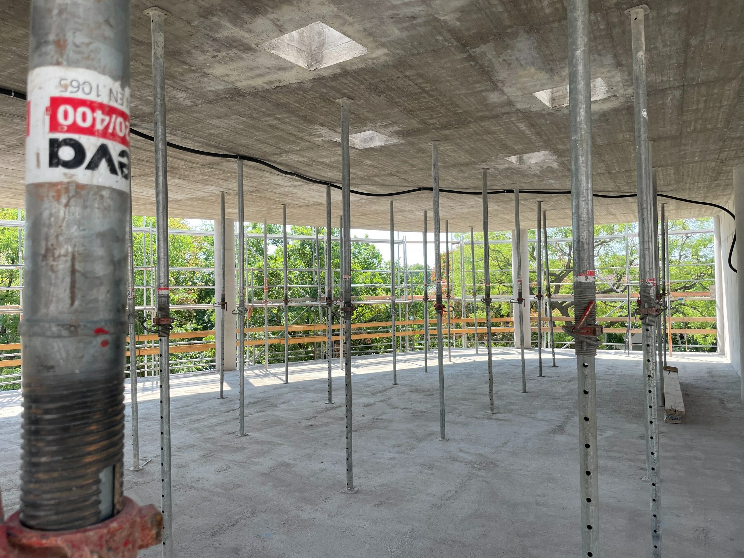 Az impozáns épület 40 centiméter átmérőjű körpilléreinek zsaluzásához a MEVA acélköpenyes, 120 kN/m2 teherbírású CIRCO körpillérzsaluzatát használták.