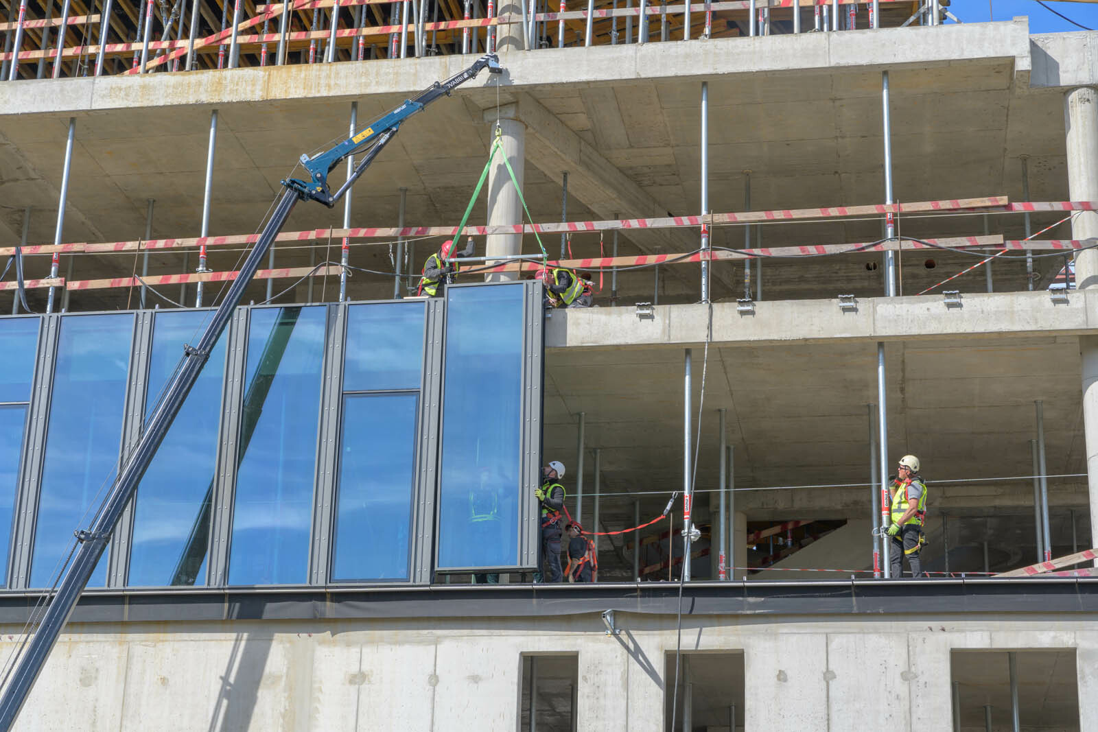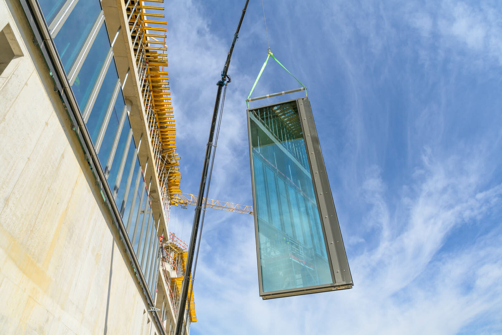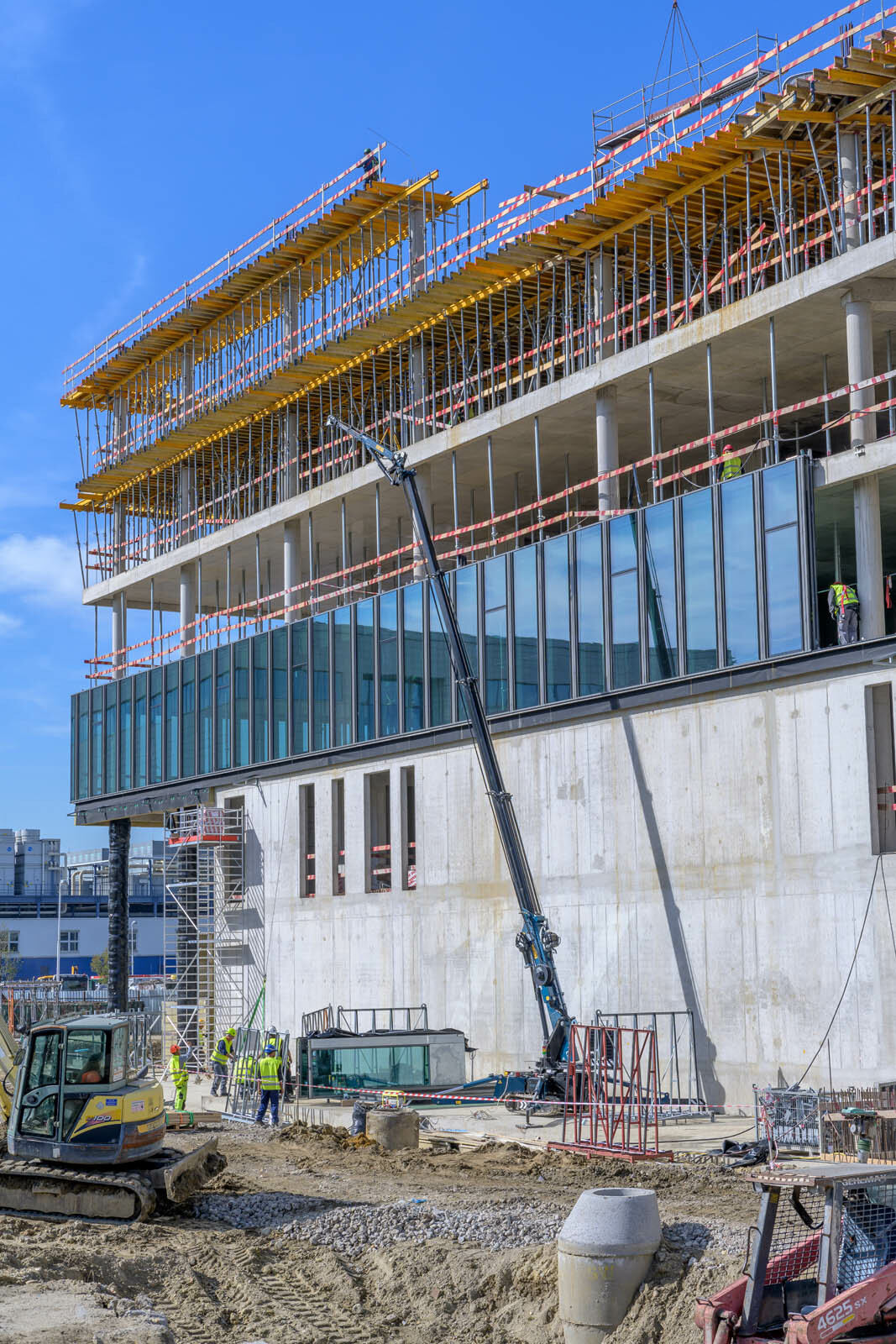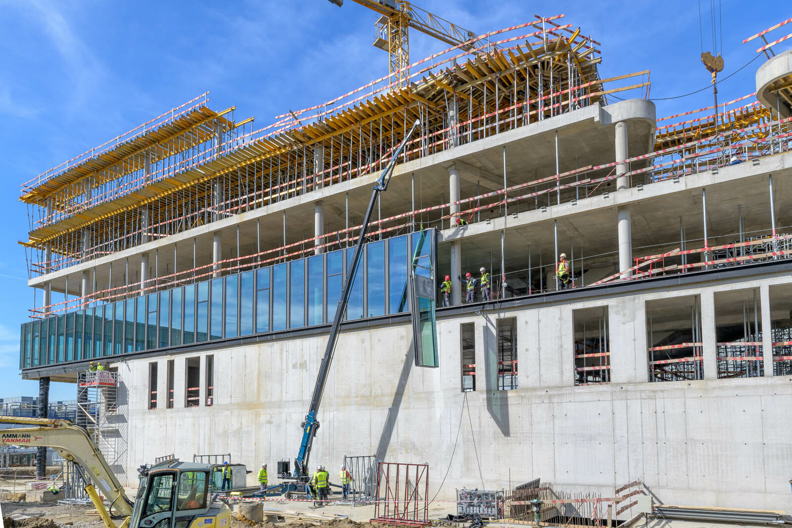 A továbbiakban a szigetelési és a lejtésképzési munkák, acélgerenda szerelések, illetve a homlokzati szerkezet beépítése következik. Mindezek mellett összehangoltan folytatódik az elemes üveghomlokzat paneljeinek beemelése, valamint az üvegpengés falak üvegtábláinak beépítése is.
