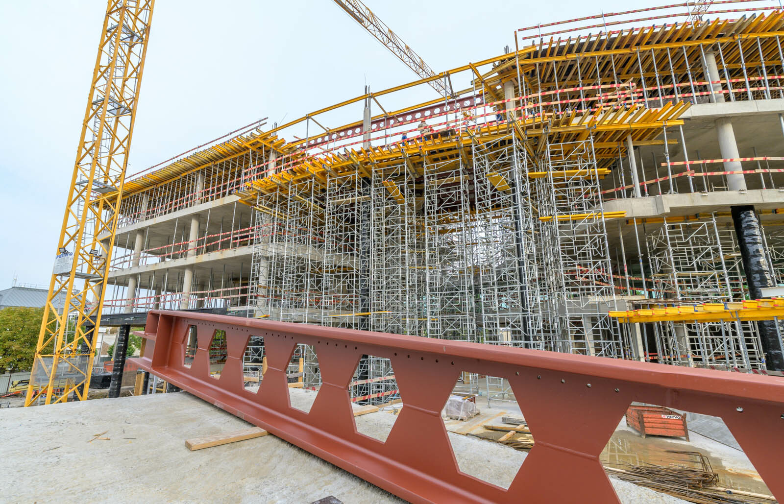 Elkészültek a vízzáró bélésfalak, a pinceszinti vasbeton falak, a pillérek és a pince feletti födém. Ezután a vasbeton falak készültek el, illetve a pörgetett eljárással készült előregyártott vasbeton pilléreket helyezték el. Ebből a legmagasabb több mint 15 méter magas. A monolit pillérek és födémek, továbbá a konferenciaterem zárófödémje is betonozásra került. A külső közműveket érintő munkálatok is a feladat részét képezik, ami 3-5 méteres mélységben dúcolással készül. Megkezdődött a mélygarázs rámpa földmunkája is, a helyi víztelenítéssel párhuzamosan.