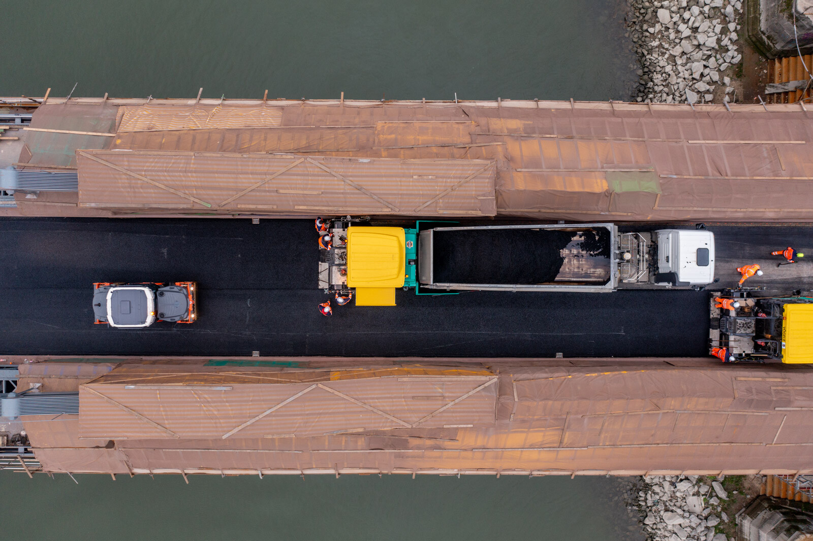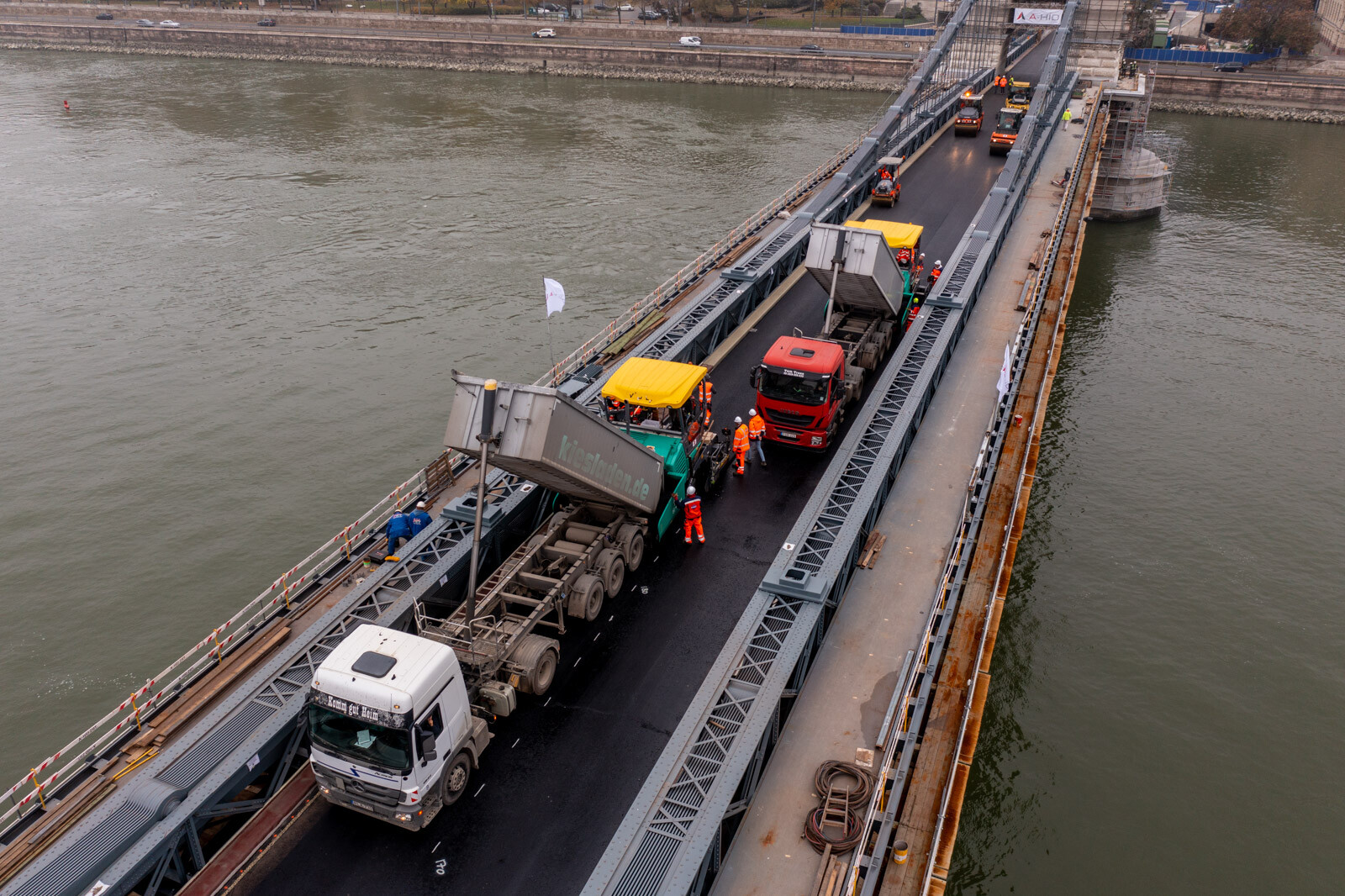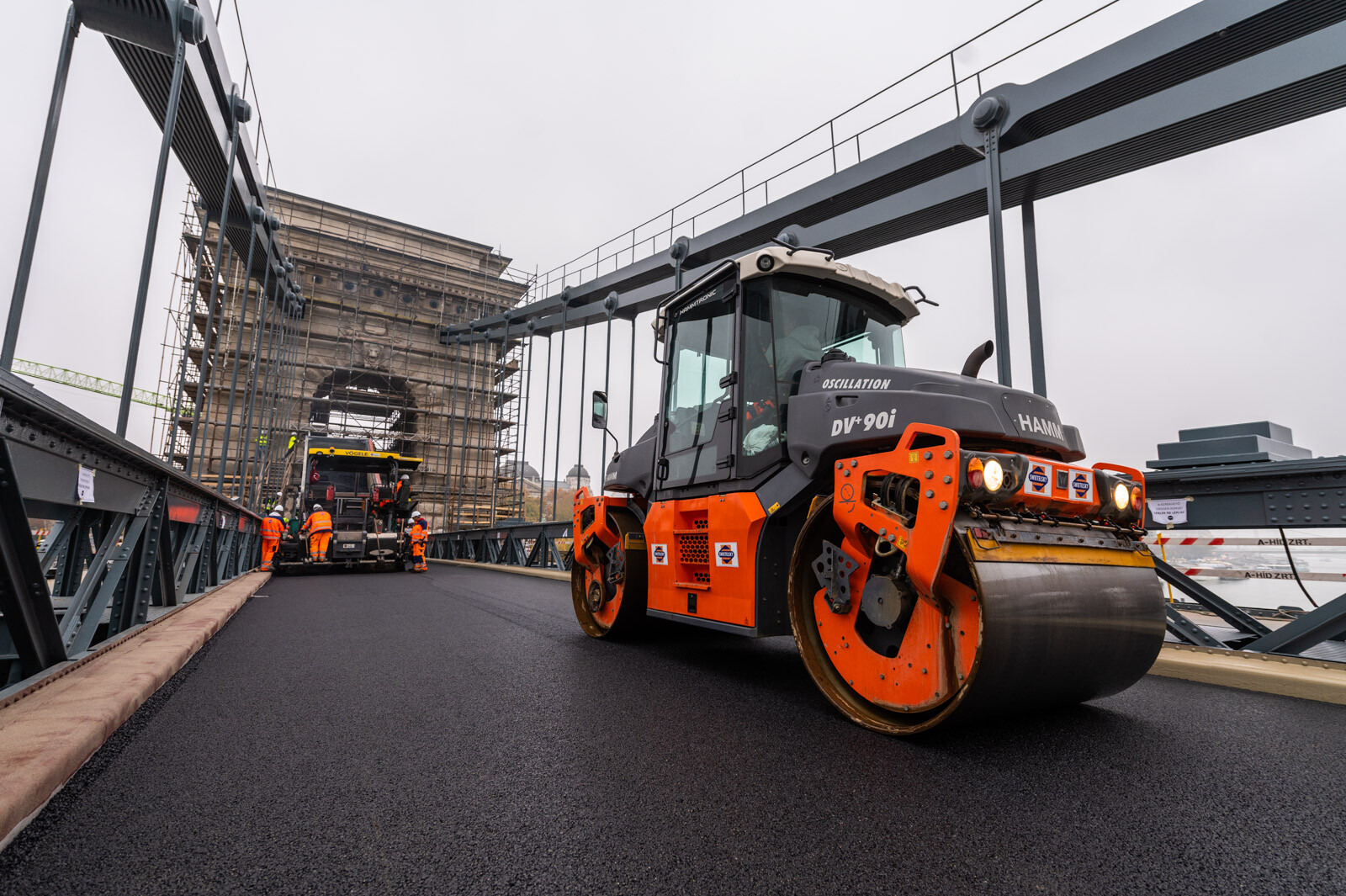 A BKK tájékoztatása szerint egyetlen nap alatt felkerült a hídfők közötti, mintegy 2400 négyzetméternyi területű útpályára a legfelső, úgynevezett kopóréteget jelentő hengerelt aszfalt. Ezután kerül sor a széleket borító öntött aszfaltcsíkok, valamint a szegélyek bevonatrendszerének kialakítására, továbbá az útburkolati jelek felfestésére.