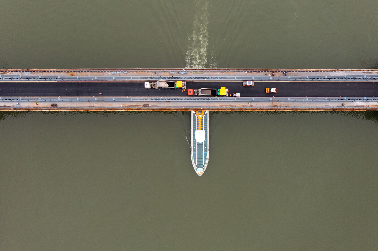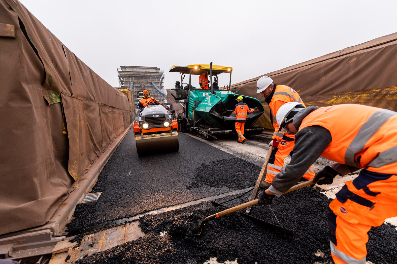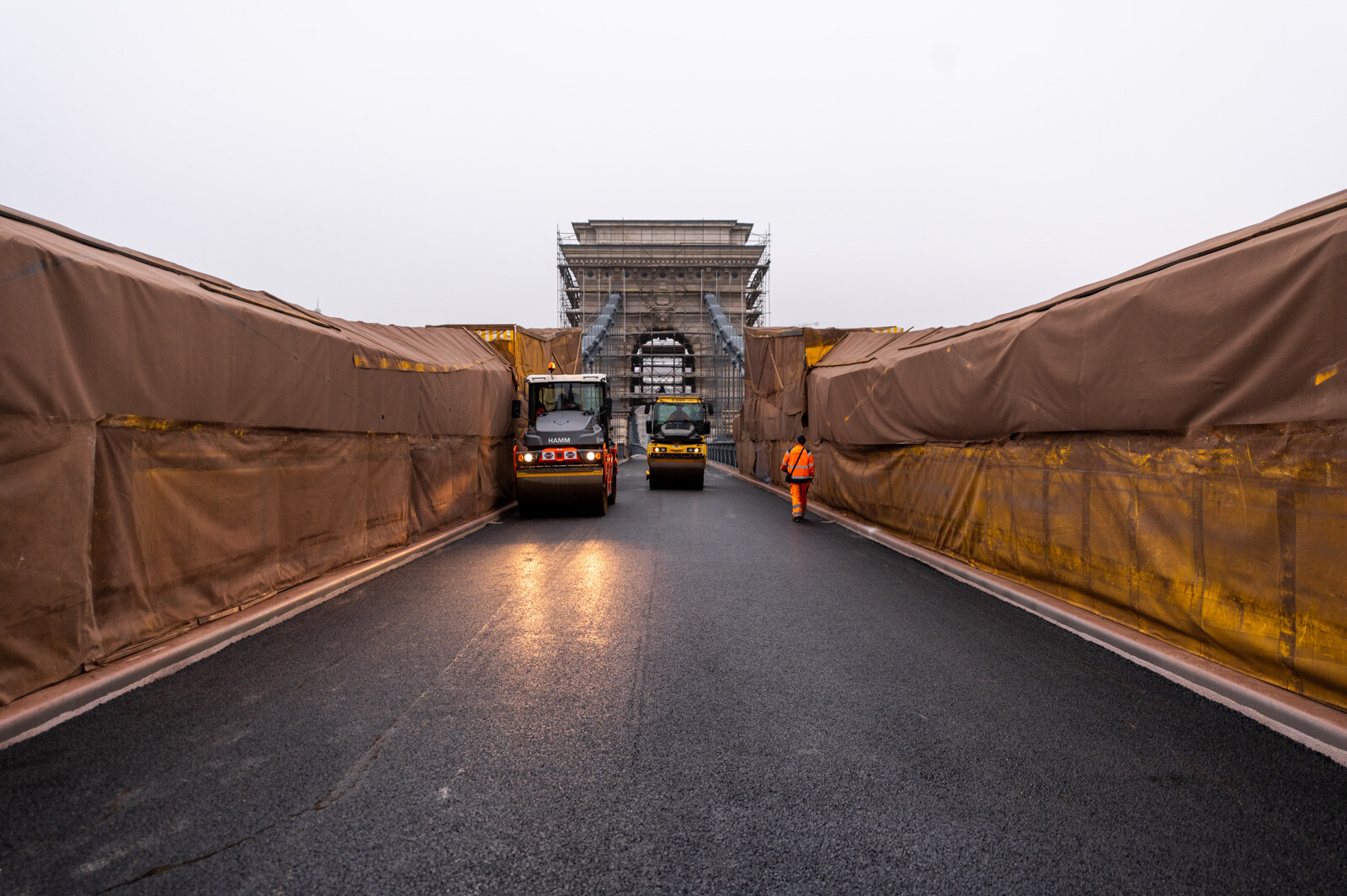 A BKK tájékoztatása szerint egyetlen nap alatt felkerült a hídfők közötti, mintegy 2400 négyzetméternyi területű útpályára a legfelső, úgynevezett kopóréteget jelentő hengerelt aszfalt. Ezután kerül sor a széleket borító öntött aszfaltcsíkok, valamint a szegélyek bevonatrendszerének kialakítására, továbbá az útburkolati jelek felfestésére.