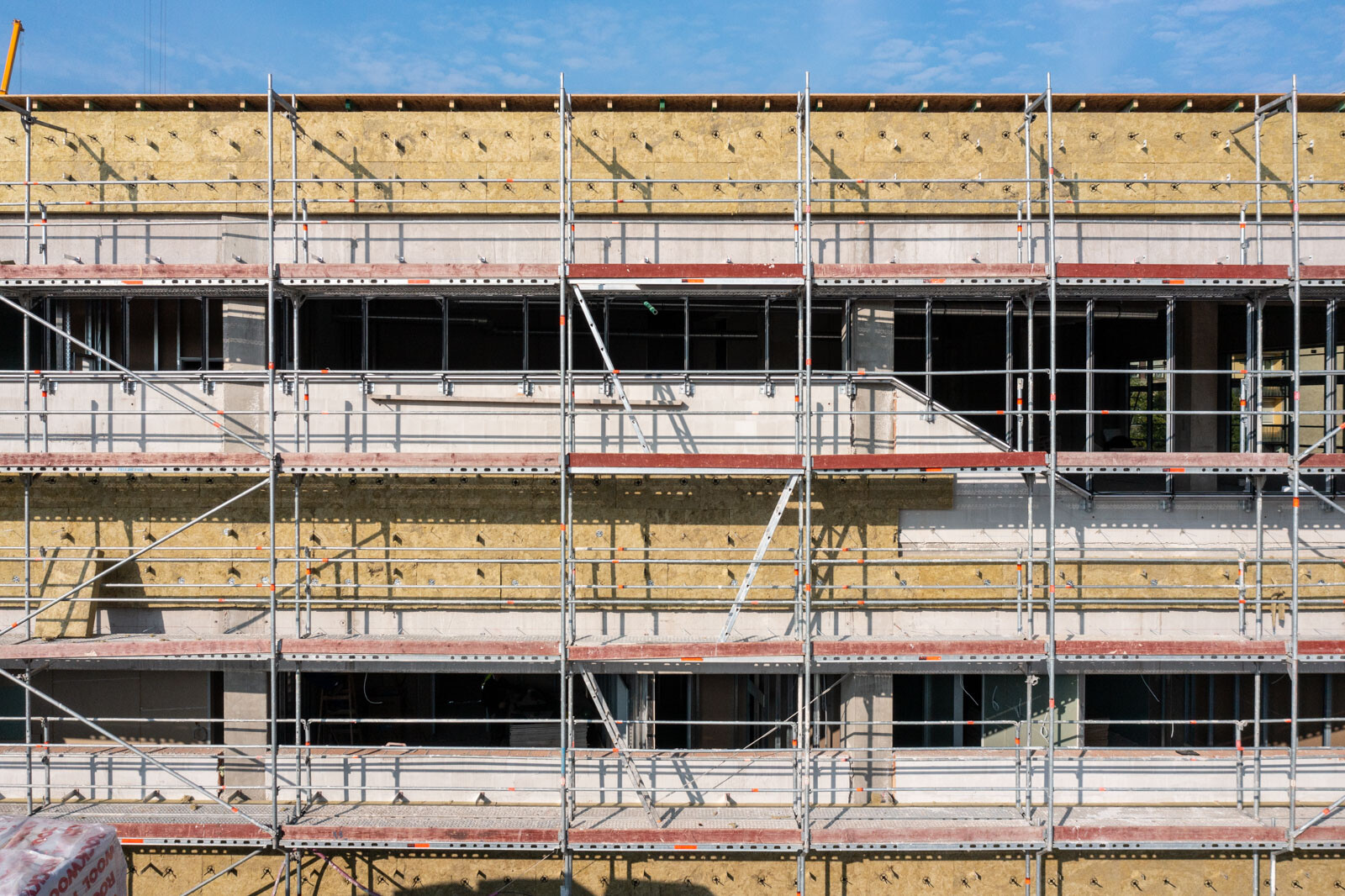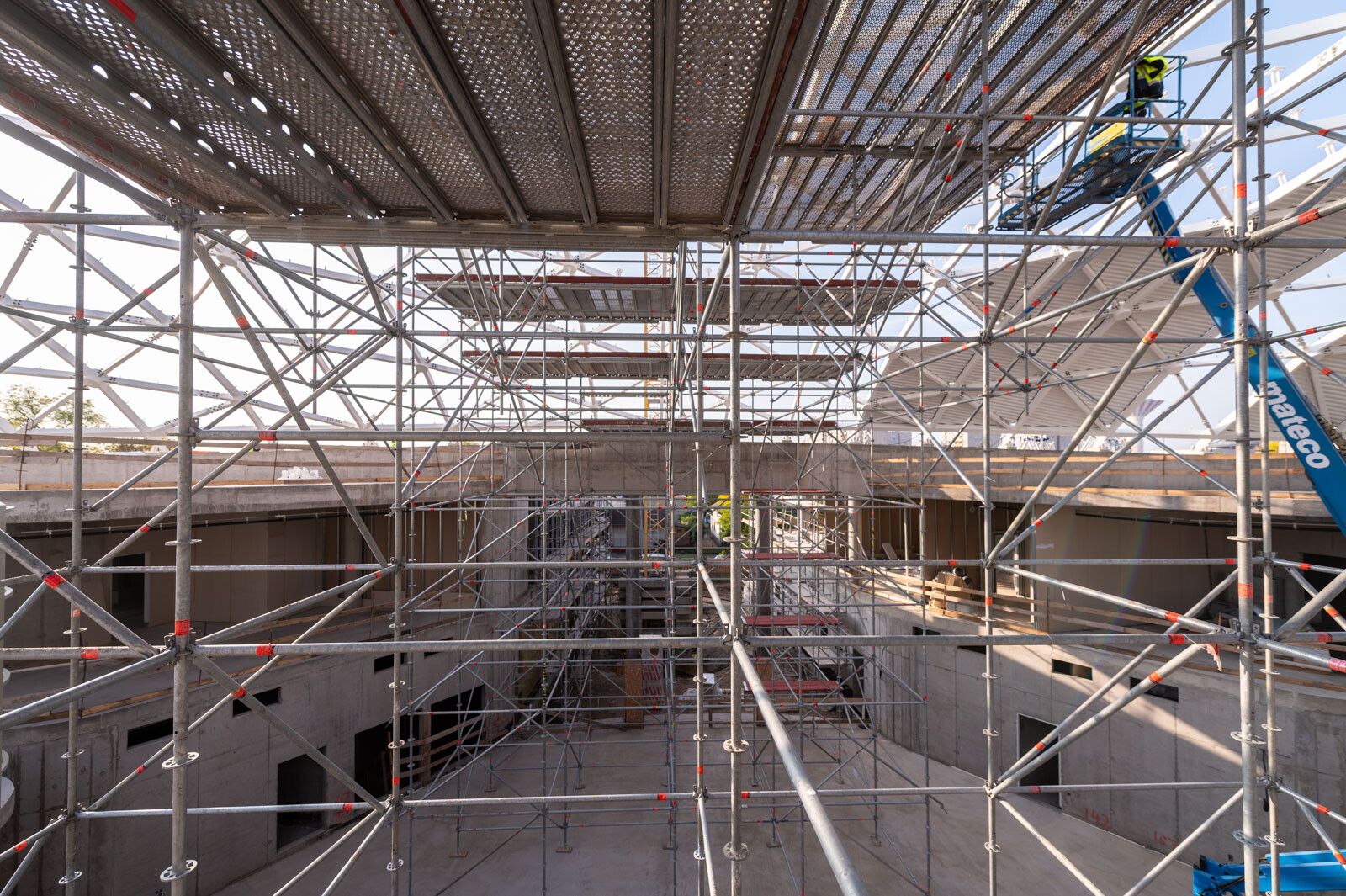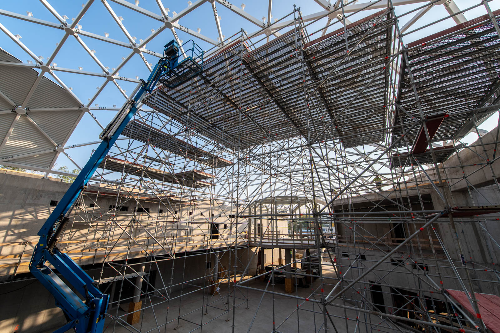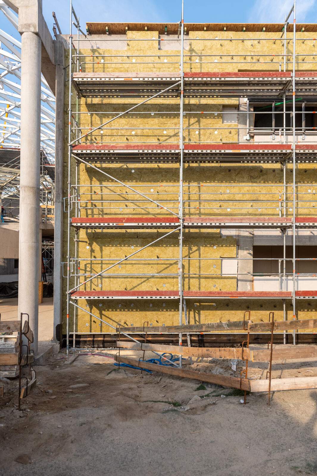 A speciális acélszerkezet üvegborításában nyújt segítséget a közel 10 méter magas Allround térállványzat, amely a tetőszerkezeti munkákhoz készült az épülő belső részben. Emellett a meglévő iskolaépület komplett homlokzati munkáinak elvégzésére Layher homlokzati állványt alkalmaztak az épület teljes frontján.