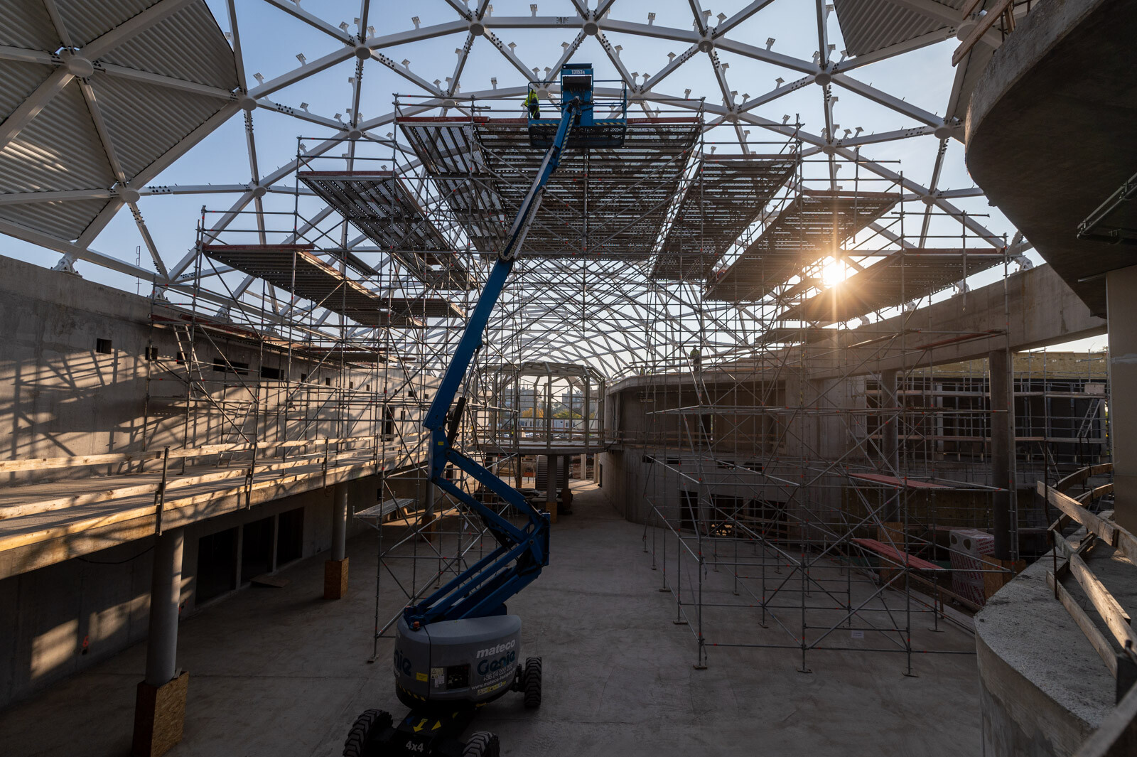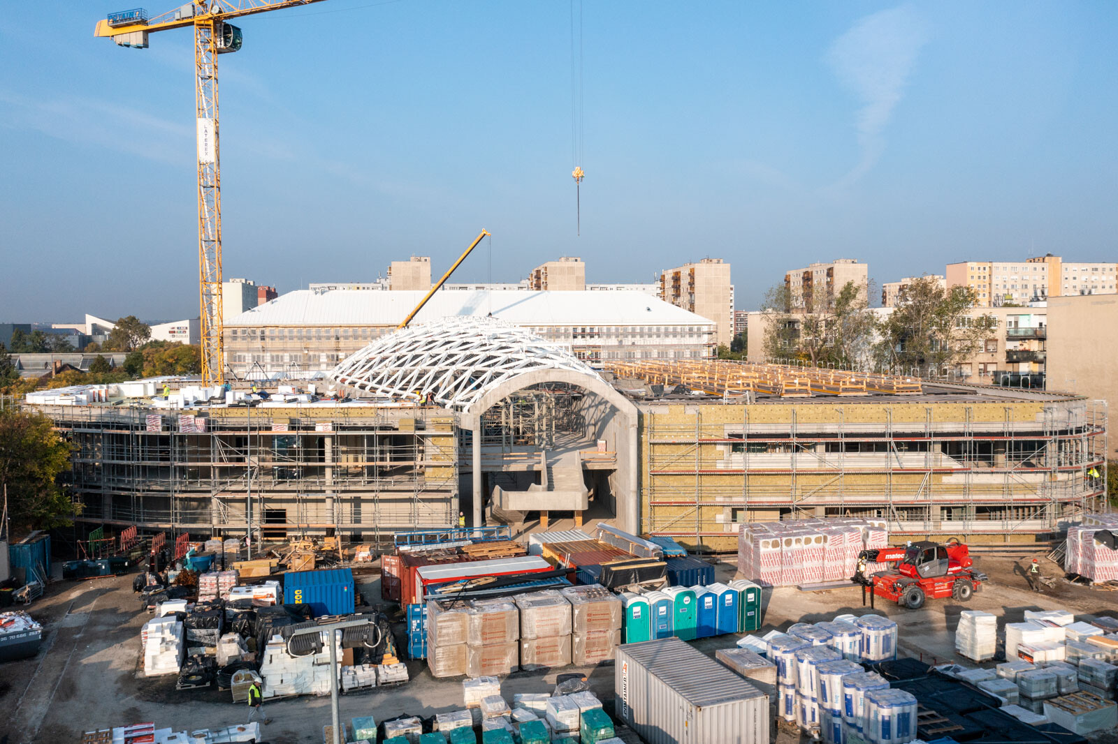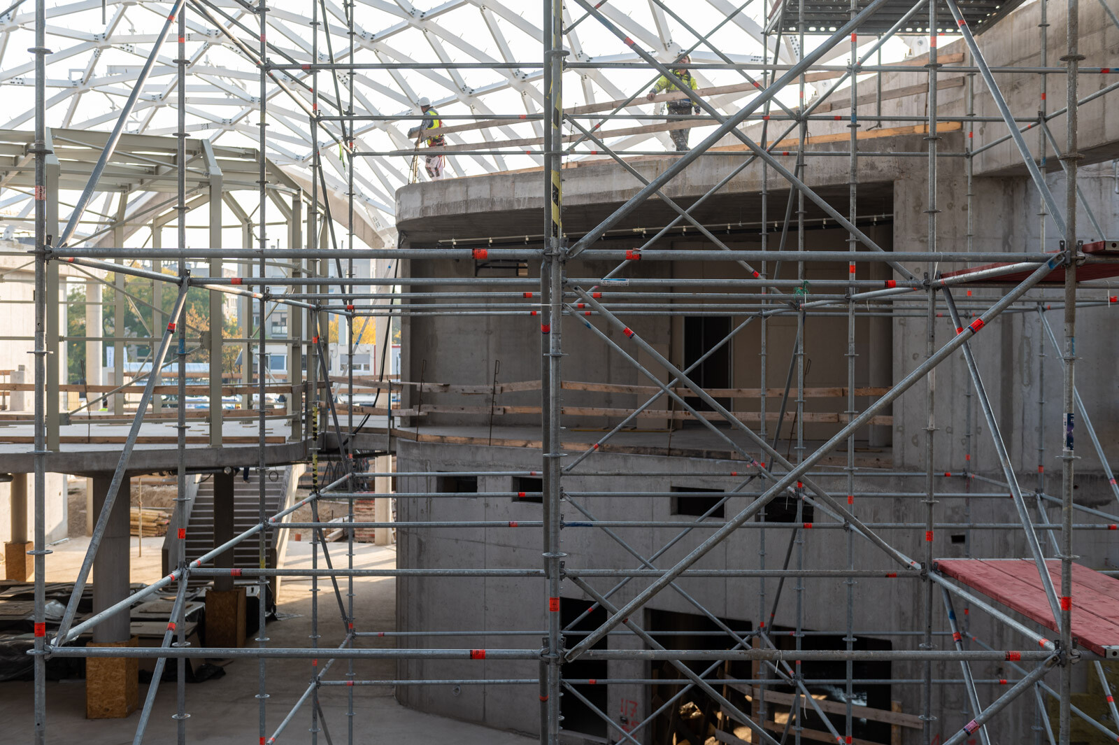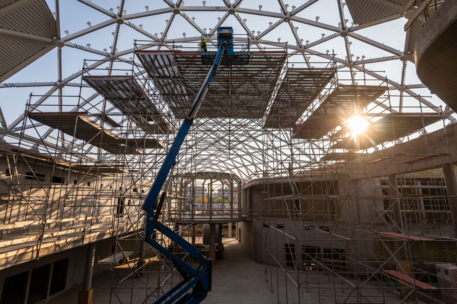 A speciális acélszerkezet üvegborításában nyújt segítséget a közel 10 méter magas Allround térállványzat, amely a tetőszerkezeti munkákhoz készült az épülő belső részben. Emellett a meglévő iskolaépület komplett homlokzati munkáinak elvégzésére Layher homlokzati állványt alkalmaztak az épület teljes frontján.