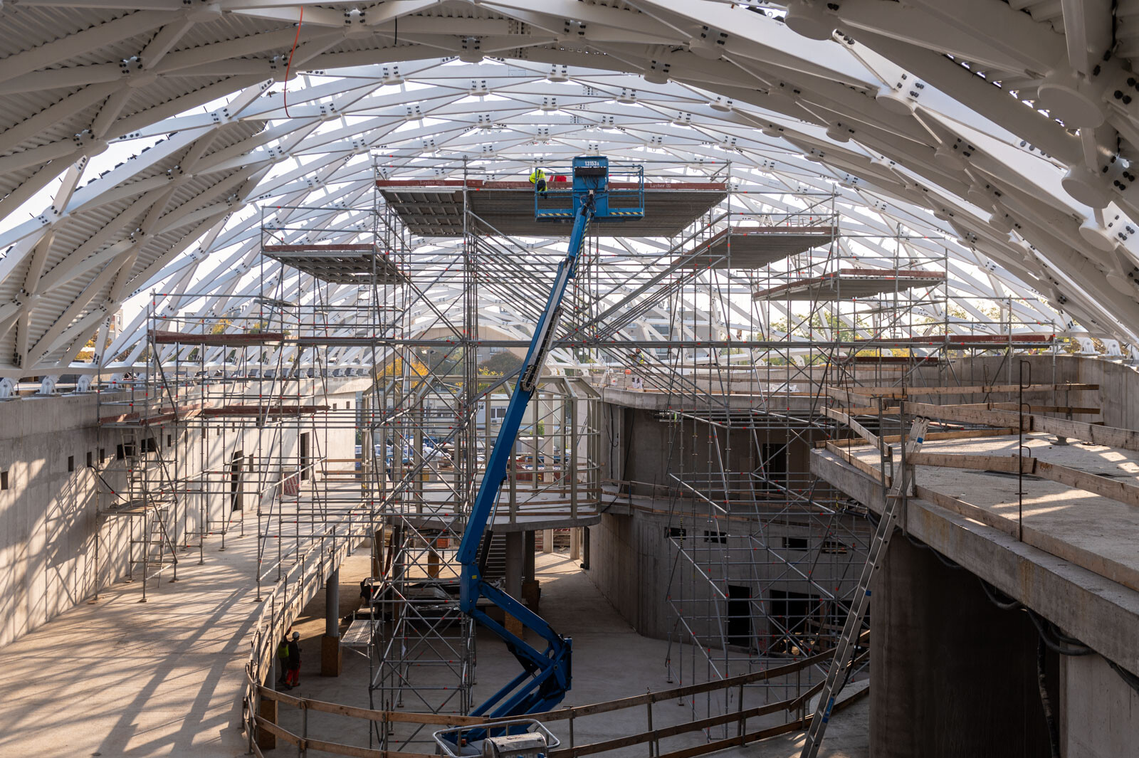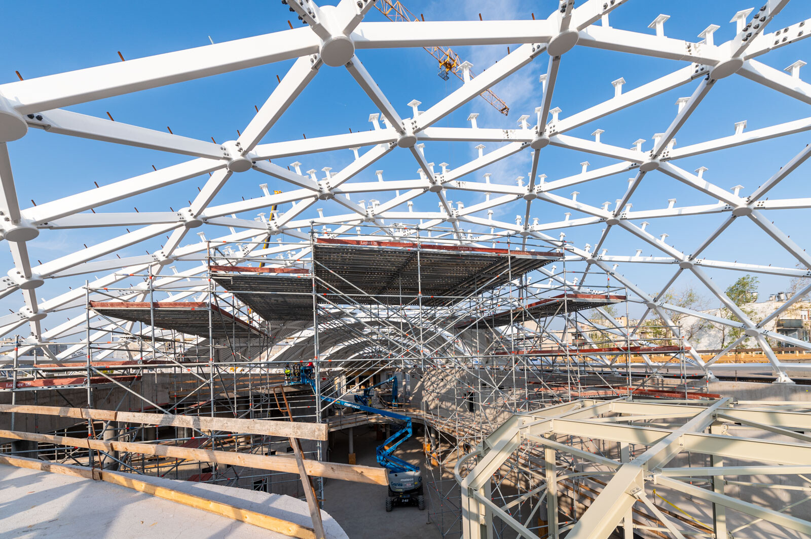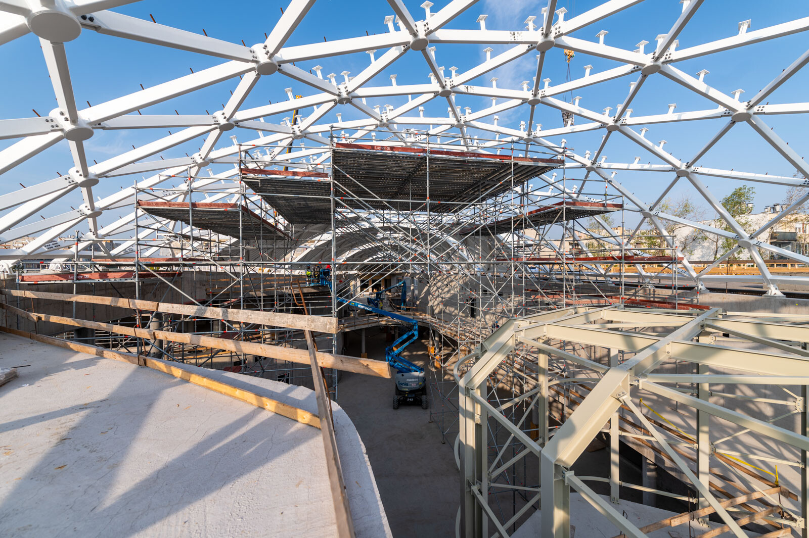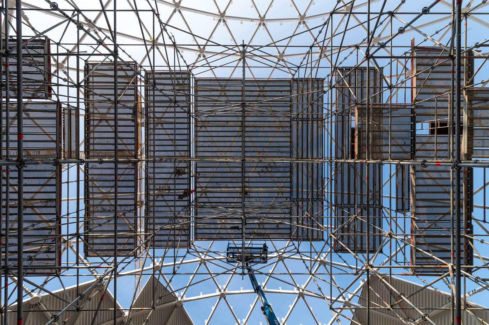 A moduláris Layher Allround állványrendszer elemeiből egy lépcsős kialakítású térállvány épült, alkalmazkodva a tetőszerkezet különleges geometriájához. Ennek a rugalmas állványrendszernek a segítségével szinte bármilyen, helyszíni adottságokhoz igazodó állvány kiépíthető ráadásul rugalmasan és gyorsan.