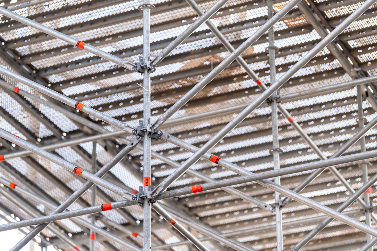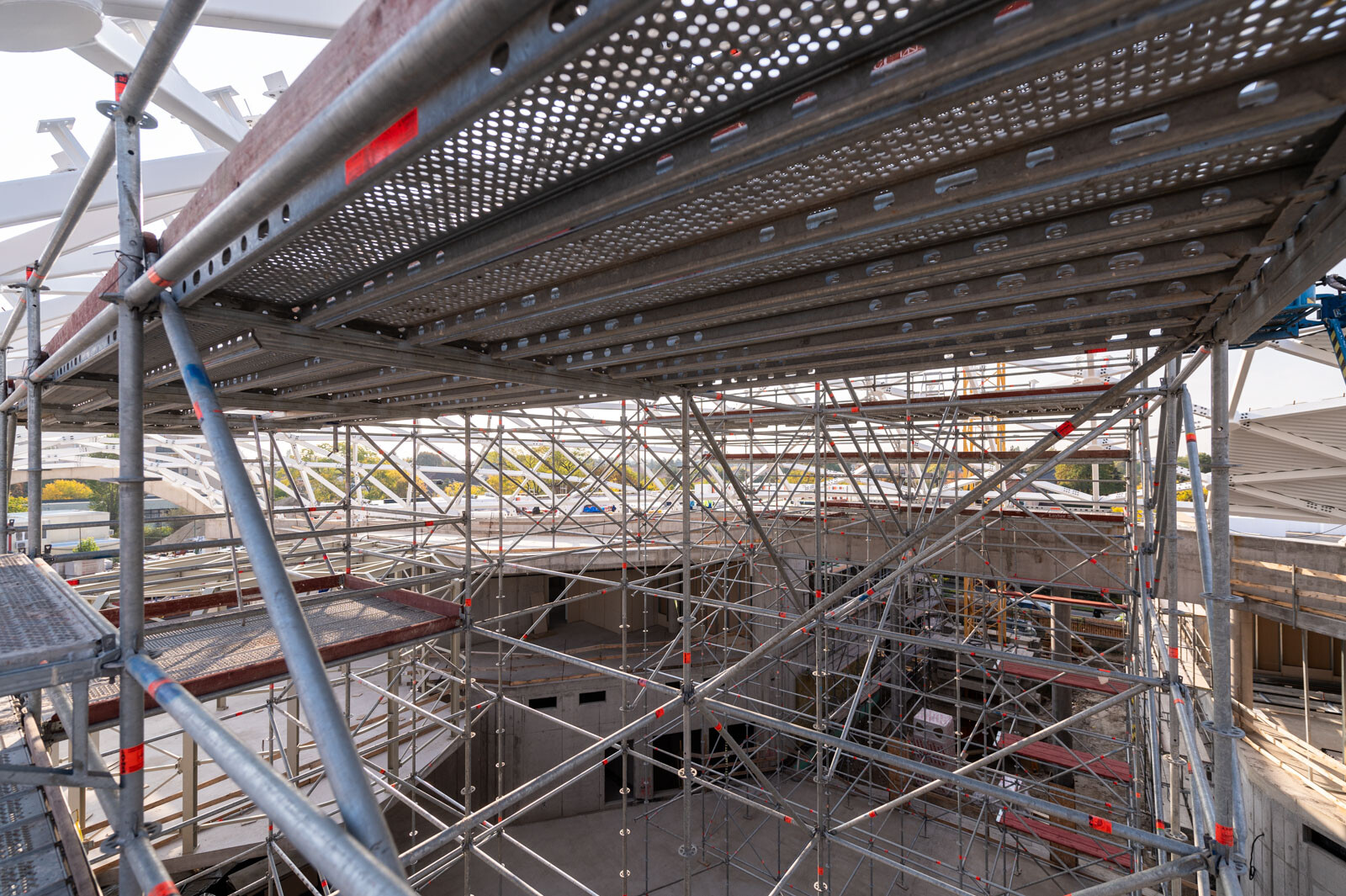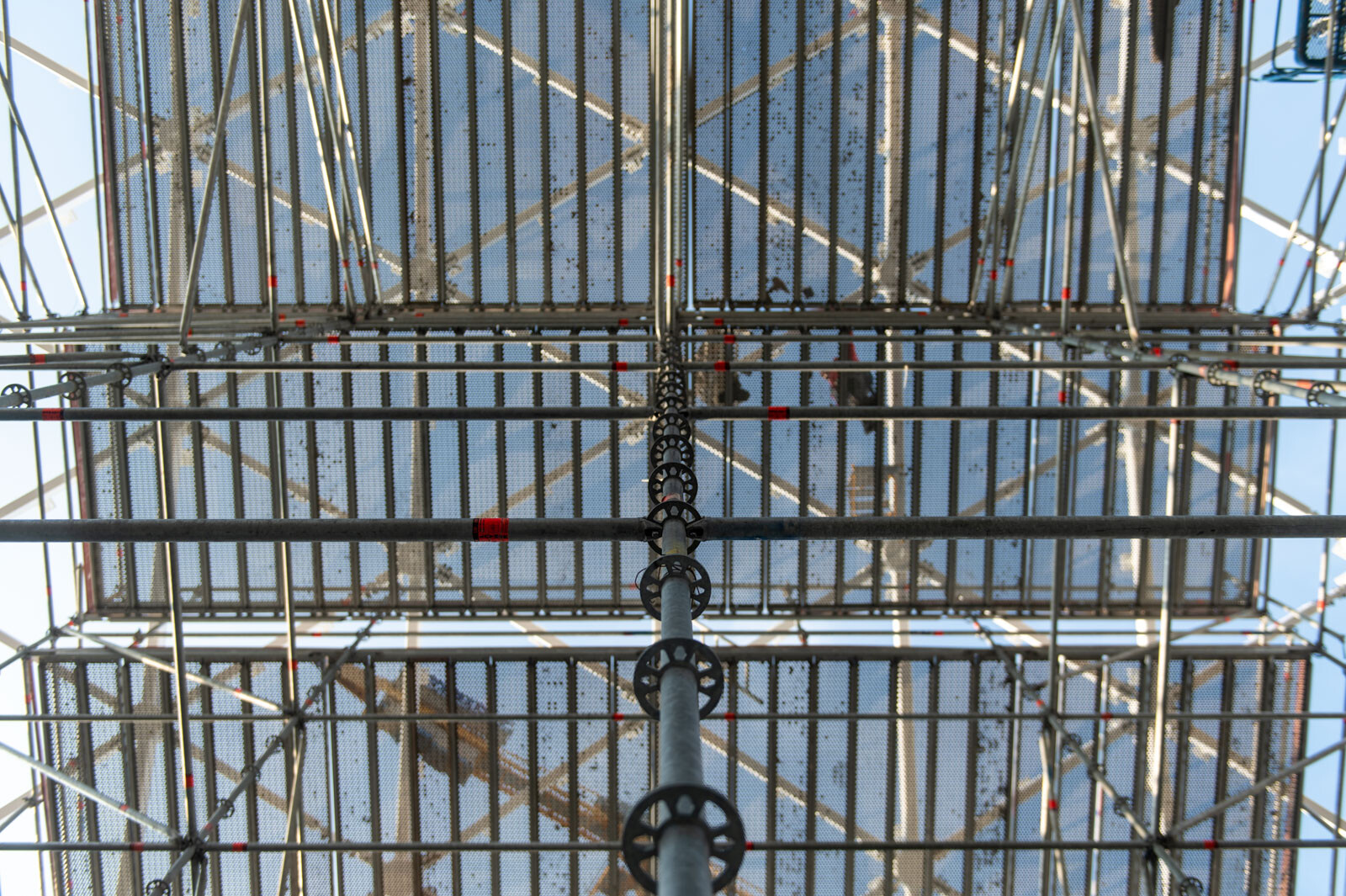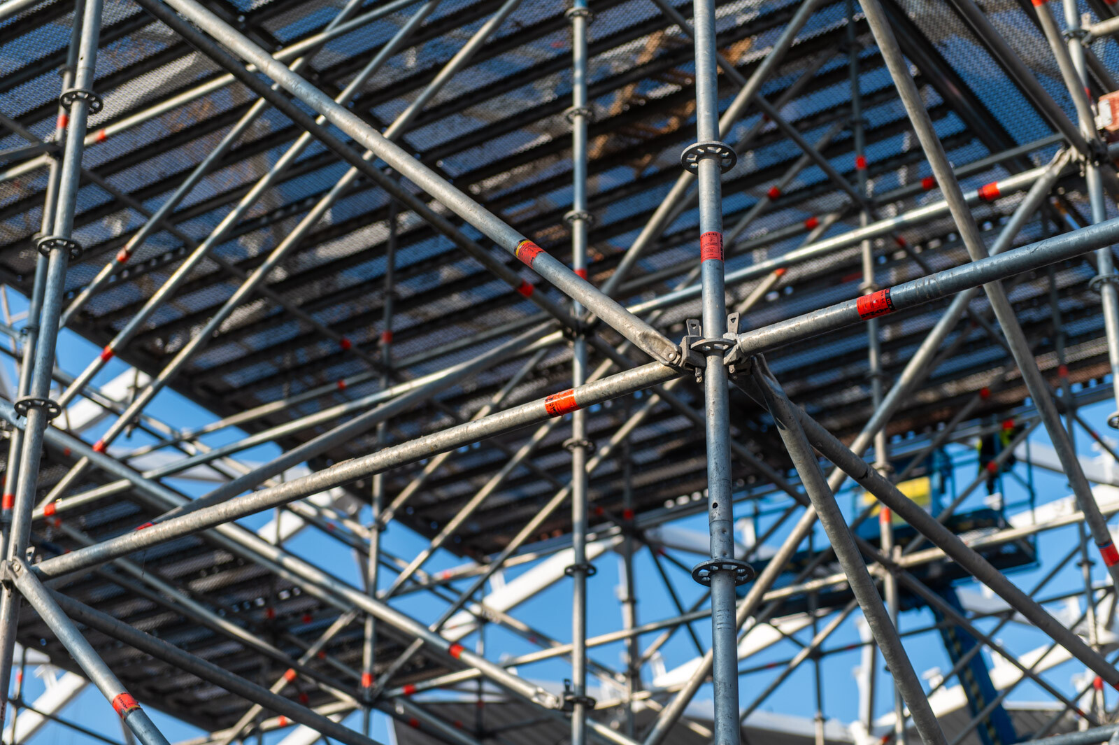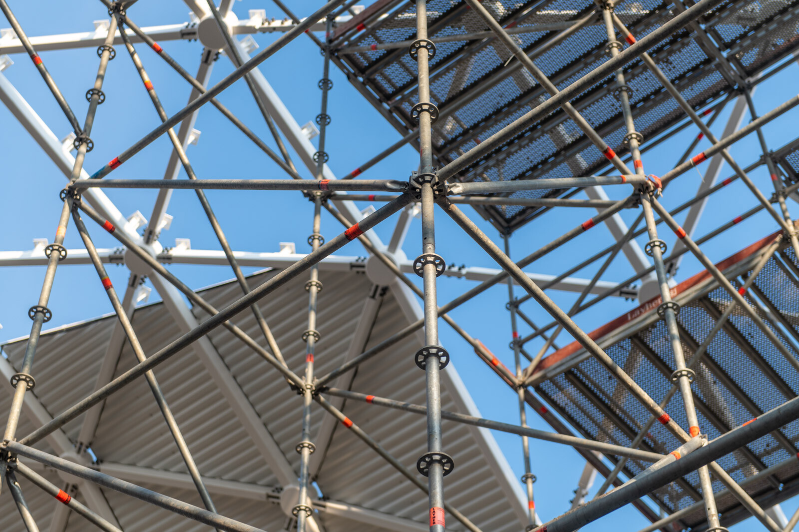 A még nagyobb biztonság és teherbírás érdekében acél járólapokat alkalmaztak, valamint az állványzatra való feljutást létrás feljárók biztosítják. A szakemberek átlós merevítőket használtak az áthidalások kialakításához, mellyel elkerülhető a rácsos tartók használata.