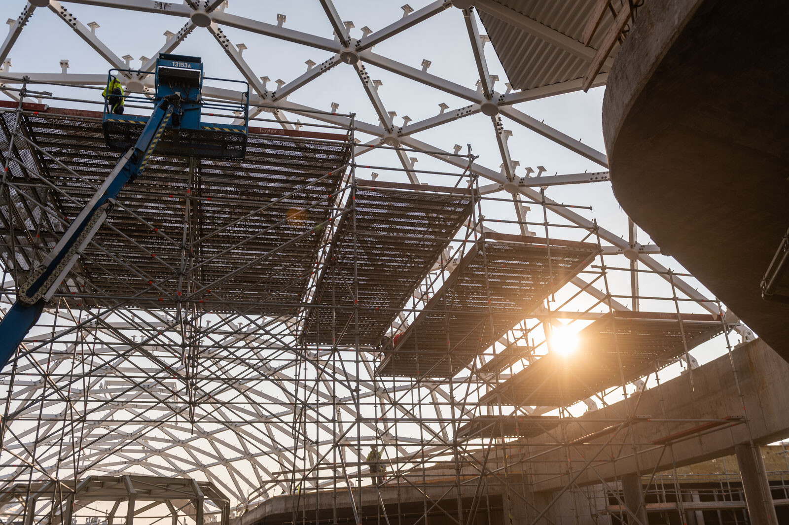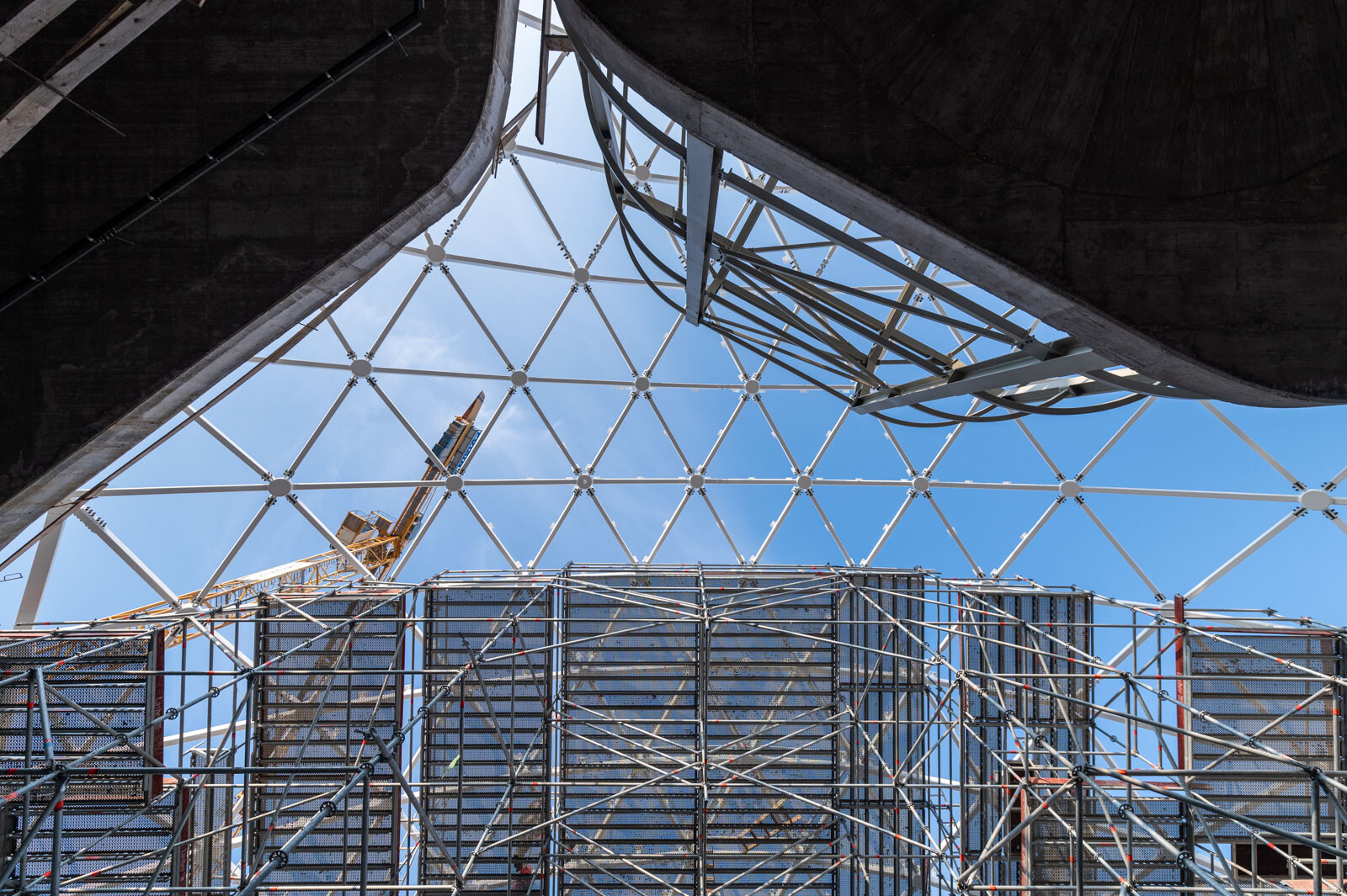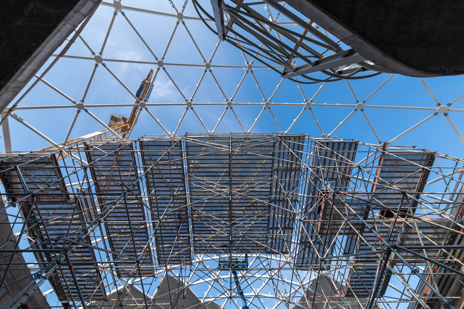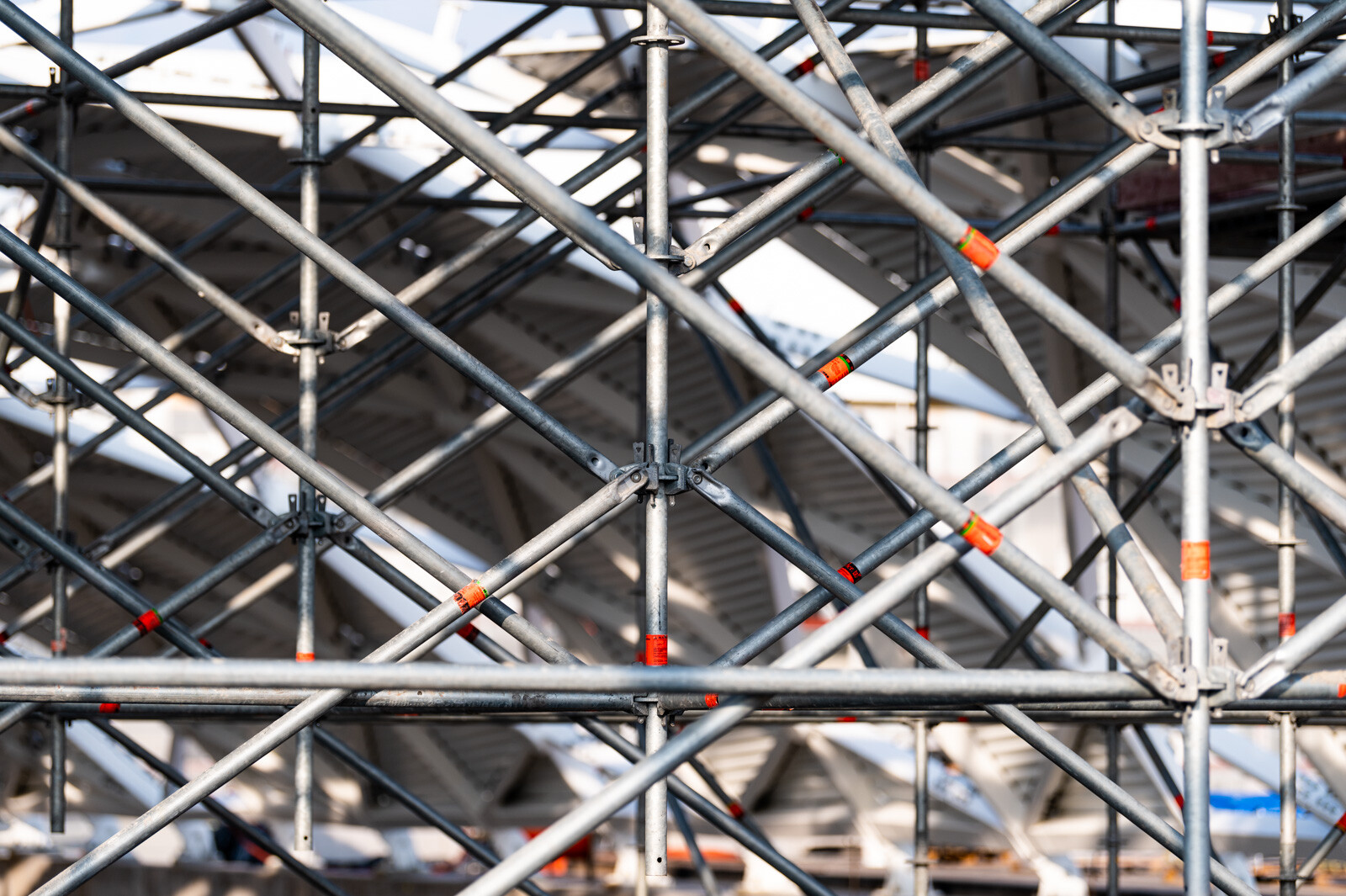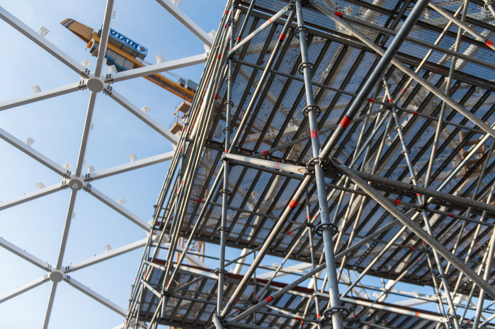 A még nagyobb biztonság és teherbírás érdekében acél járólapokat alkalmaztak, valamint az állványzatra való feljutást létrás feljárók biztosítják. A szakemberek átlós merevítőket használtak az áthidalások kialakításához, mellyel elkerülhető a rácsos tartók használata.