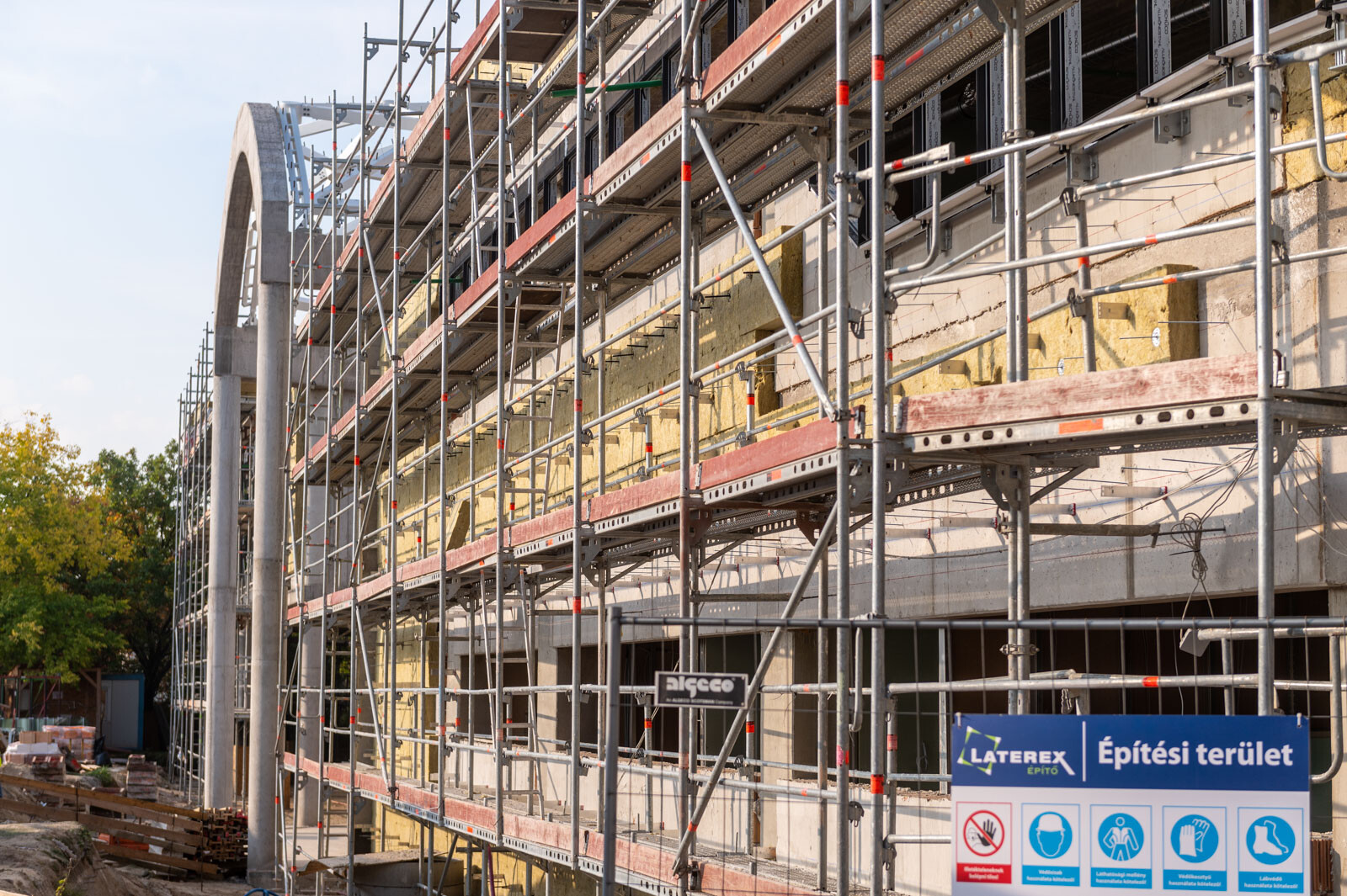 A térállvány mellett a Layher Blitz homlokzati állványrendszer elemeiből homlokzati munkaállványt építettek a szakemberek a szigetelő és egyéb homlokzati munkák elvégzésére. Ez az állványrendszer kiváló megoldás mindennemű homlokzati munka elvégzéséhez, hiszen amellett, hogy