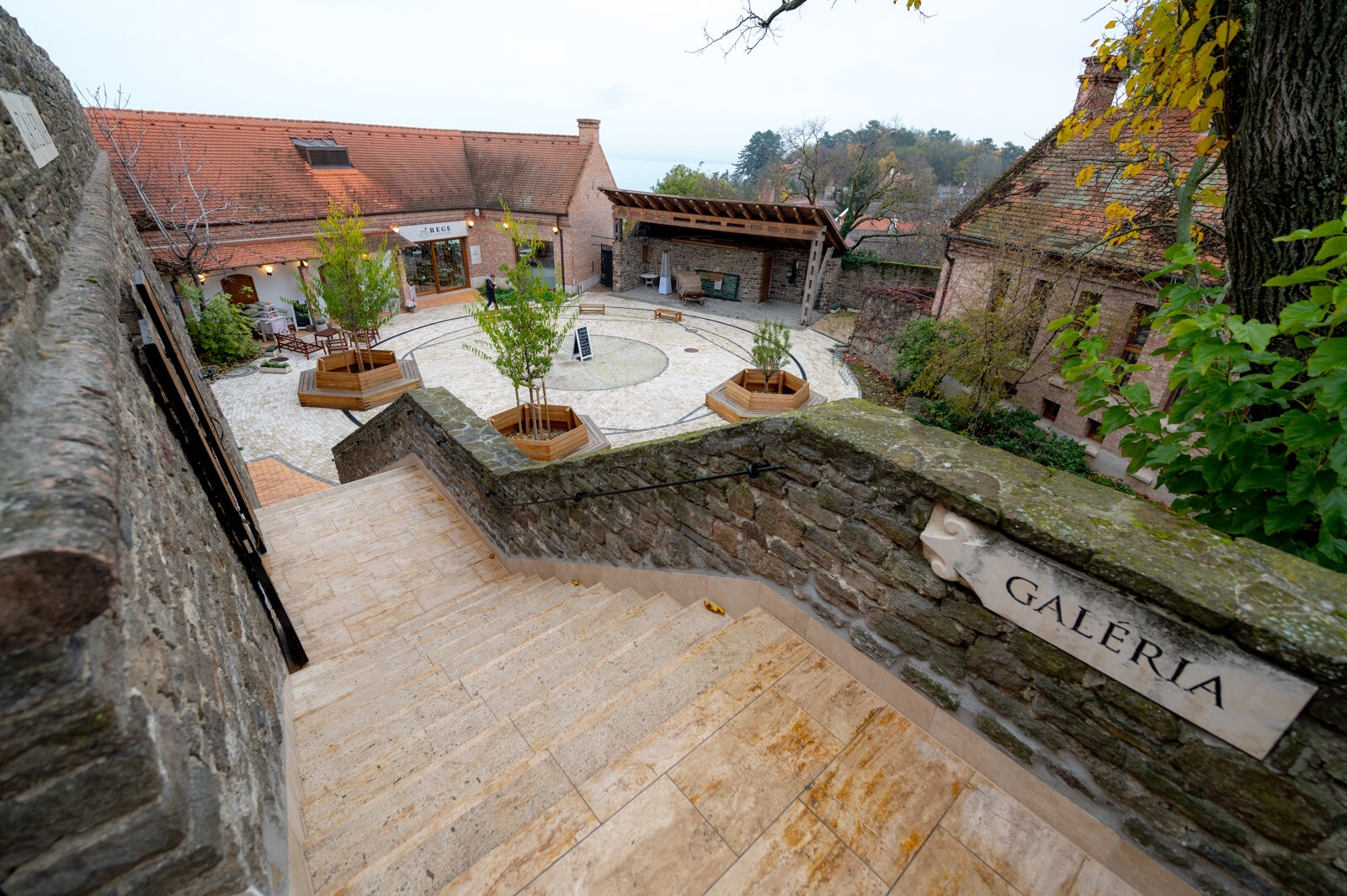 A külső terek megújításával a tervezők és a kivitelezők is szem előtt tartották a meglévő elemek és a táj jellegzetességeinek alkalmazását, ezért a galéria bizonyos külső részein a falburkolat és a déli-teraszkert mellvédfalának burkolása is tihanyi kőből készült.