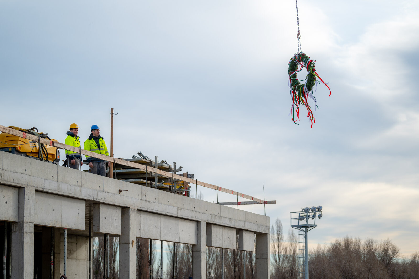 Felkerült a bokréta a Horváth Építőmester Építőipari Zrt. és a Possibuild Építőipari és Szolgáltató Kft. kivitelezésében a IX. kerületben épülő központ tetejére.