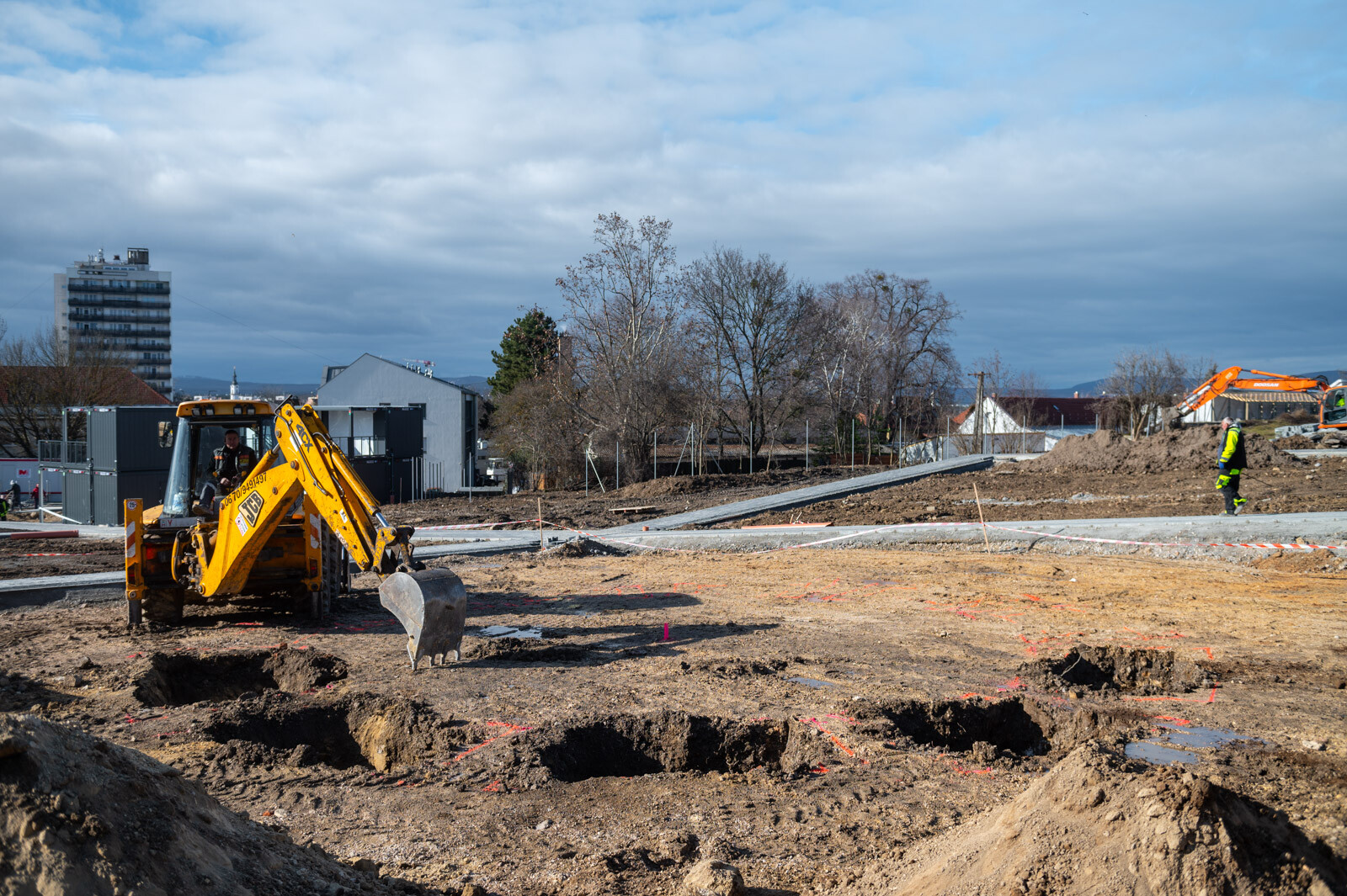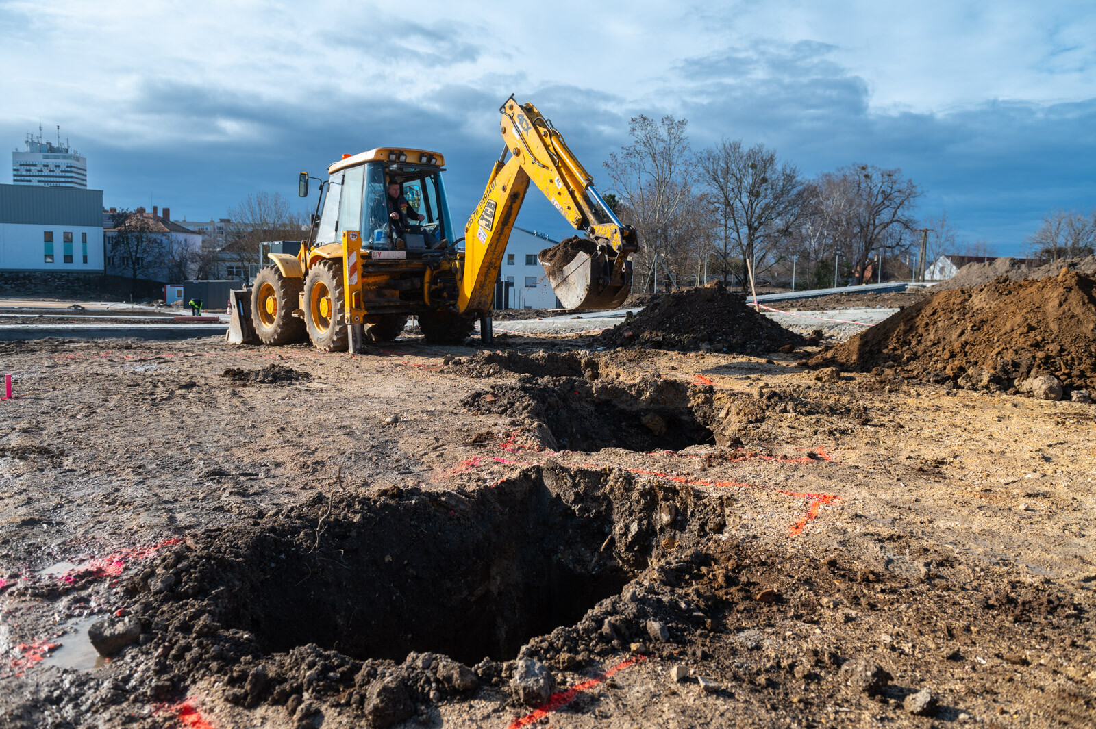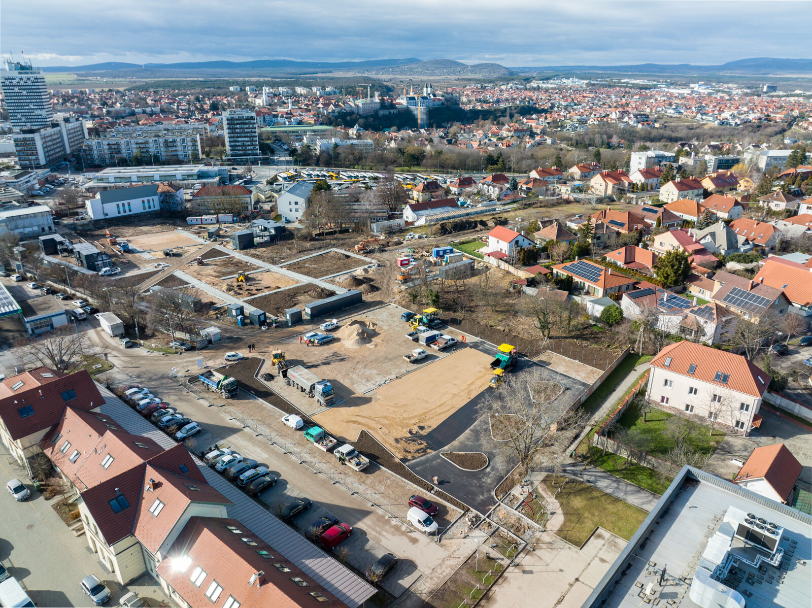 A többhektáros munkaterületen tavaly augusztus óta folyik a munka. A korábbi, részben már elbontott épületeket teljesen el kellett bontani. Kivéve a Jutasi út 3-as szám alatti volt bemutatótermet és a Budapest út felőli bejárat melletti helyi védett épületet. A talaj- és földmunkák megtörténtek, a közművek építése folyamatban van. A kivitelezőknek az érintett ingatlanok környezetrendezését is meg kell valósítaniuk.