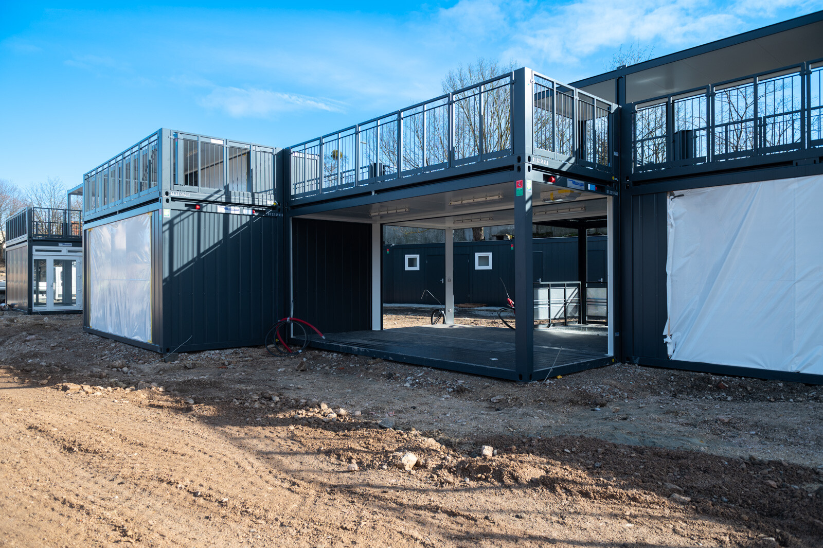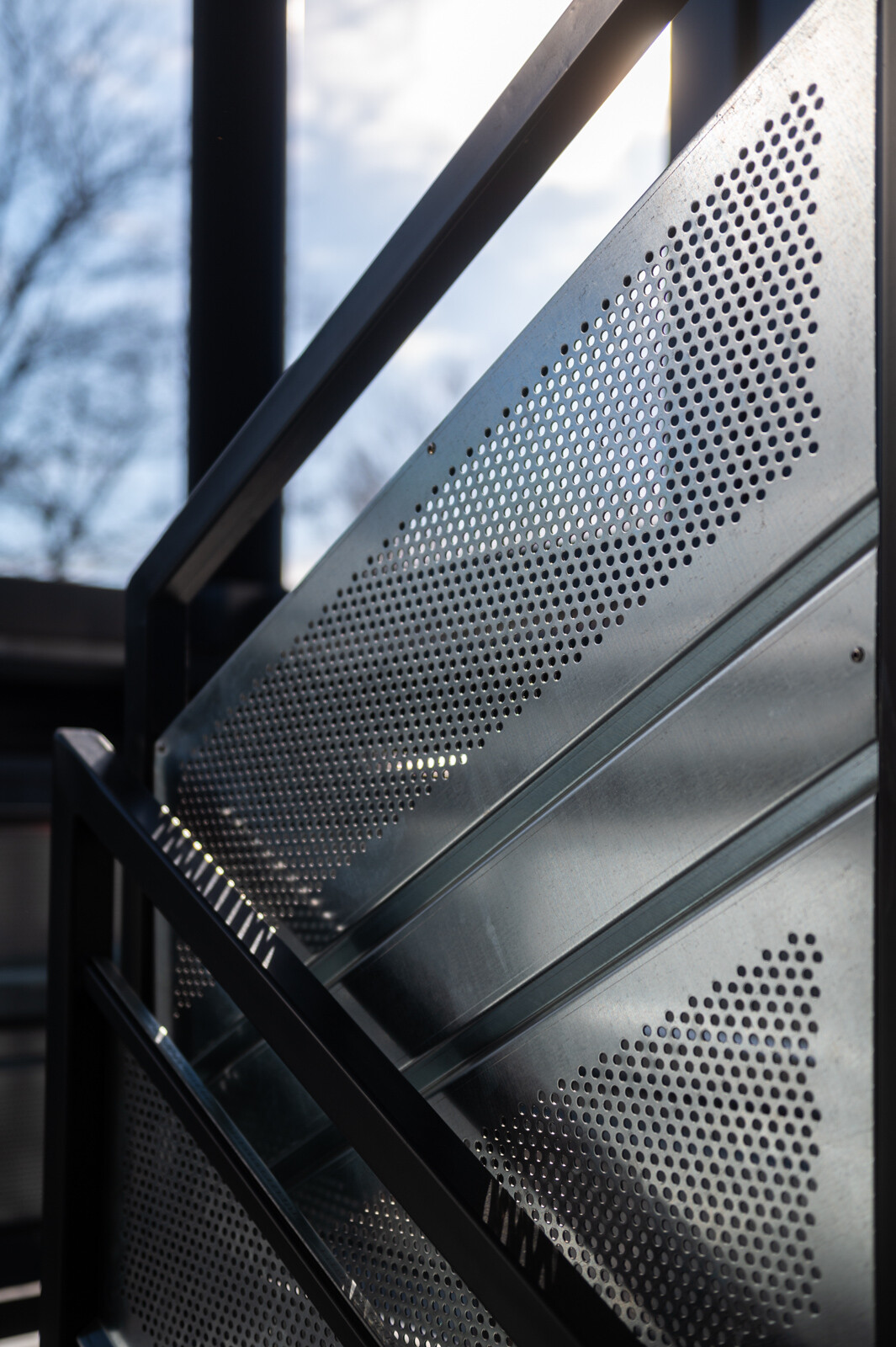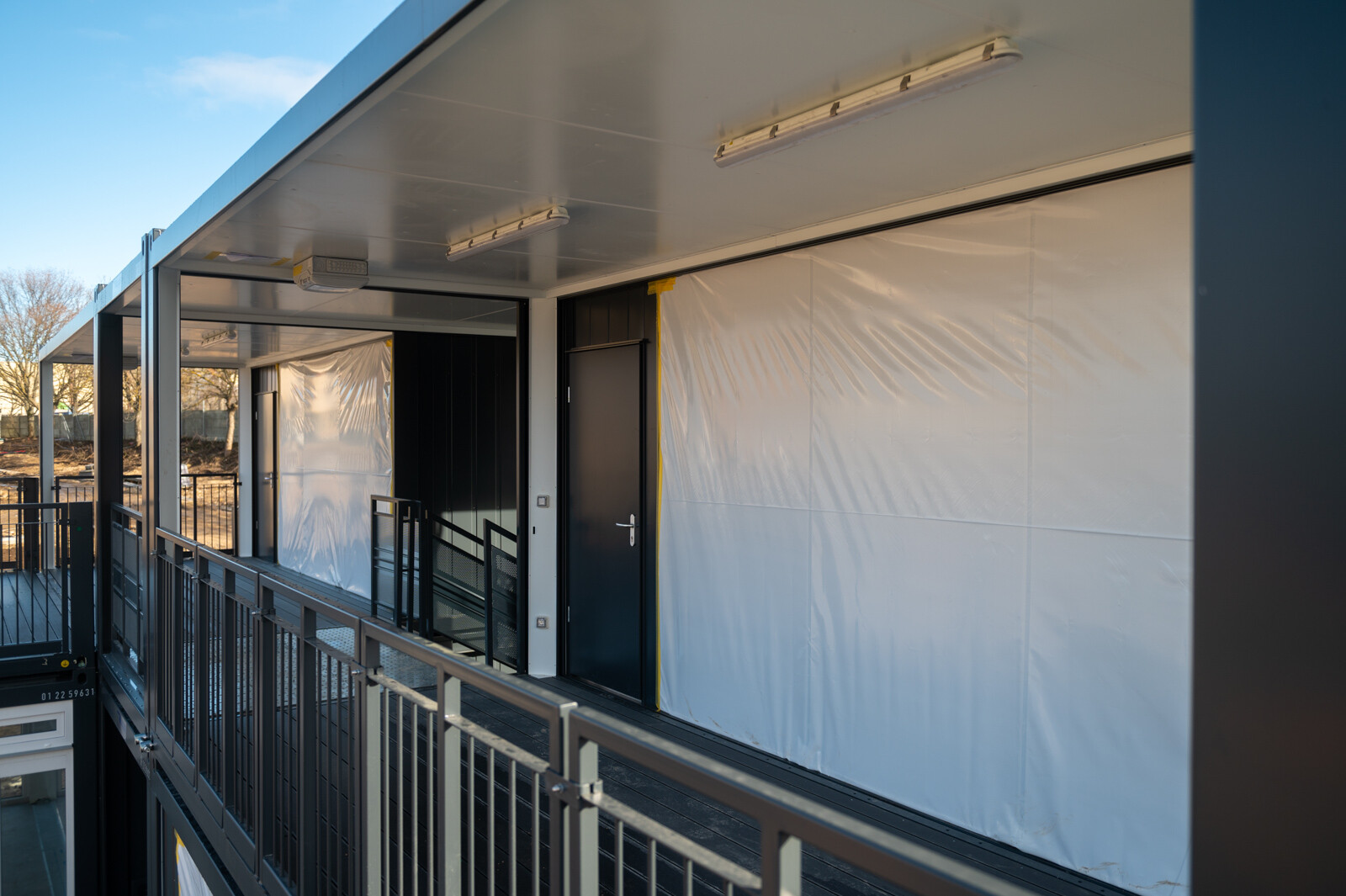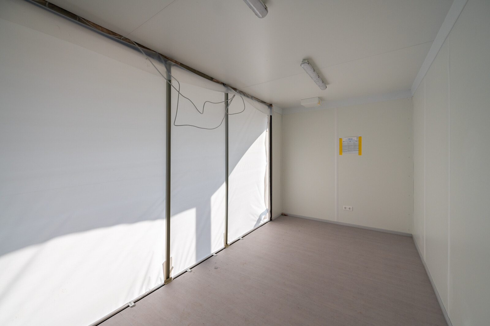 A helyi védelem alatt álló, egykori bútorgyár romos igazgatósági épületét egyedi grafikával díszített homlokzati hálókkal takarják el.