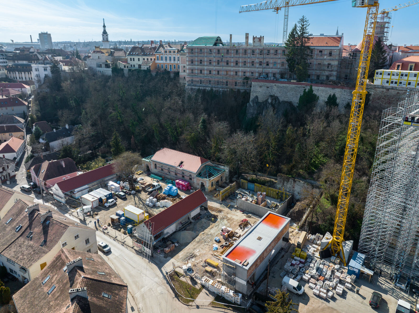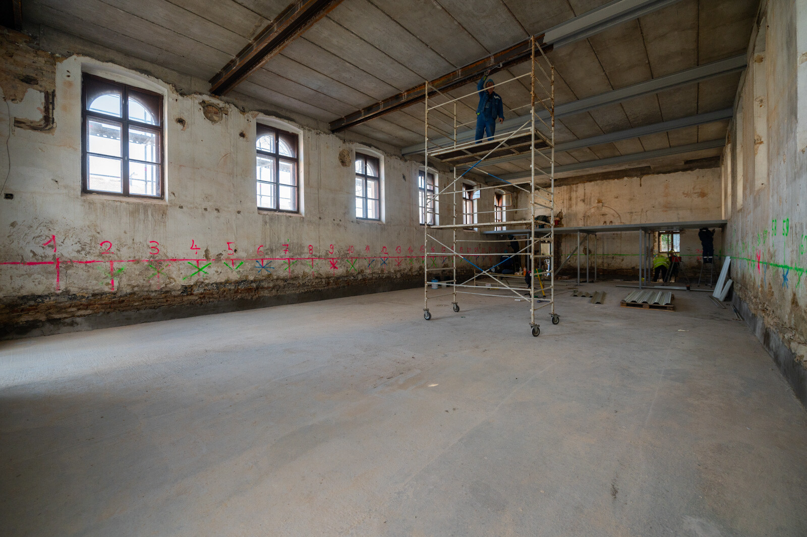 Az új épületek kivitelezésén túl azonban a piarista gimnázium volt tornatermének felújítási munkálataira is részletesebben kitért a projektvezető. A kihasználatlanul álló épület műemléki gondosságú felújítást igényelt, így a munkálatokat egy részletes feltárás előzte meg.