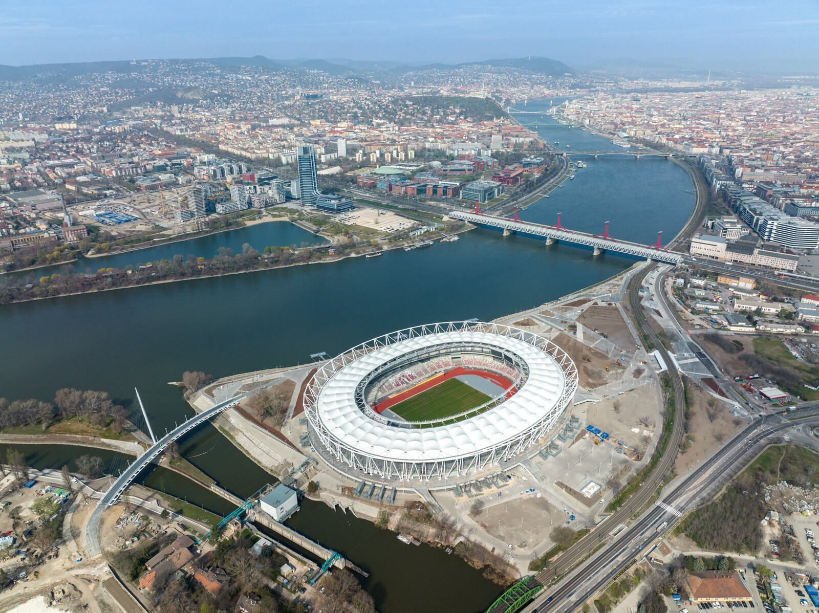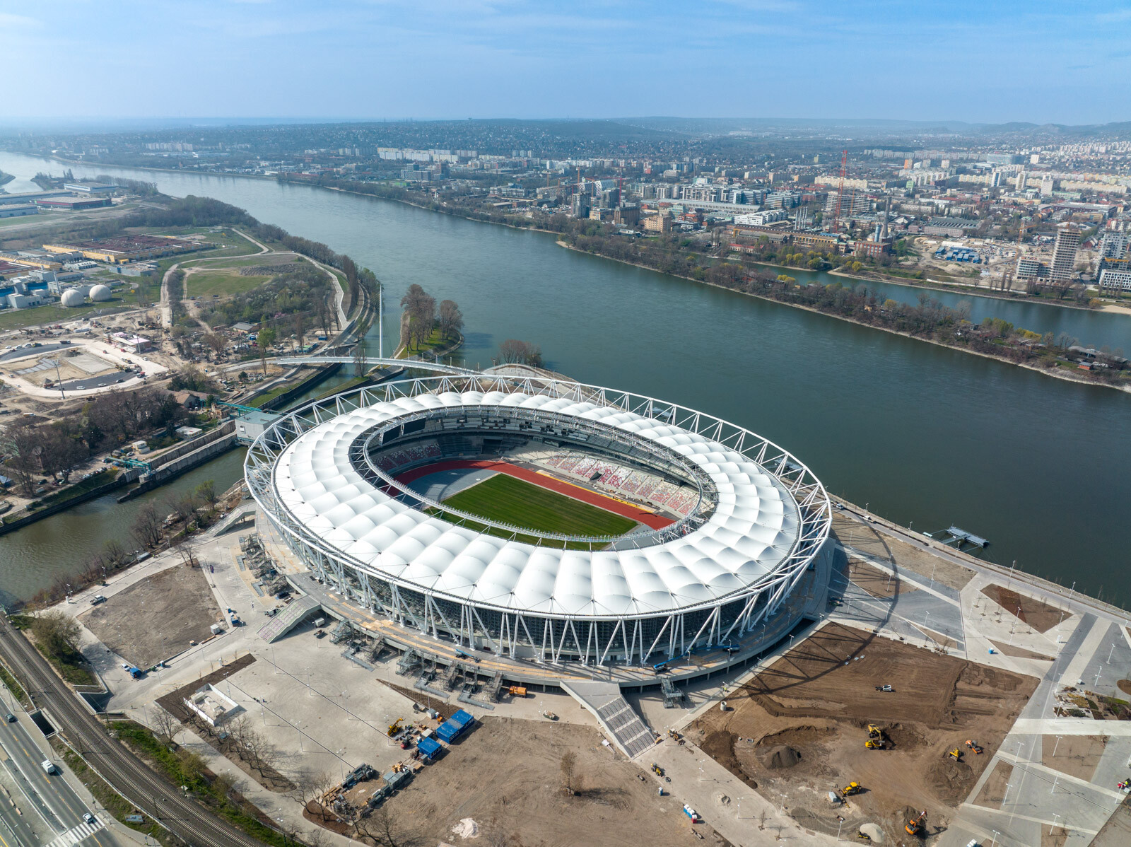 Az aréna épületének kivitelezésével párhuzamosan mindeközben a 168 méter hosszú, egypilonos, ferdekábeles hídszerkezettel bíró, osztószigeti gyalogoshíd - másnéven Robinson híd - munkálatai is zajlottak 2021. február és 2022. októbere között.
