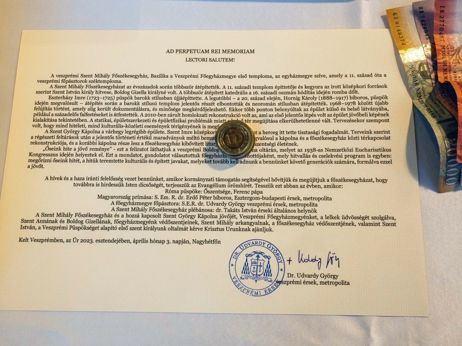 Az új kapszula egyebek mellett az aktuális társadalmi és egyházi helyzet leírását, Ferenc pápa, Erdő Péter bíboros, a Veszprémi Főegyházmegye főpásztorának és a Szent Mihály Főszékesegyház plébánosának nevét tartalmazza. Bekerült a hengerbe egy összefoglaló, amely a székesegyház megújításának mozzanatait tartalmazza és néhány tárgy, amely a mai kor üzenetét hivatott tolmácsolni. Köztük a Veszprém-Balaton Európa Kulturális Fővárosa Program kitűzője és a veszprémi állatkert érméje, illetve egy adathordozóra rögzített videóüzenet.