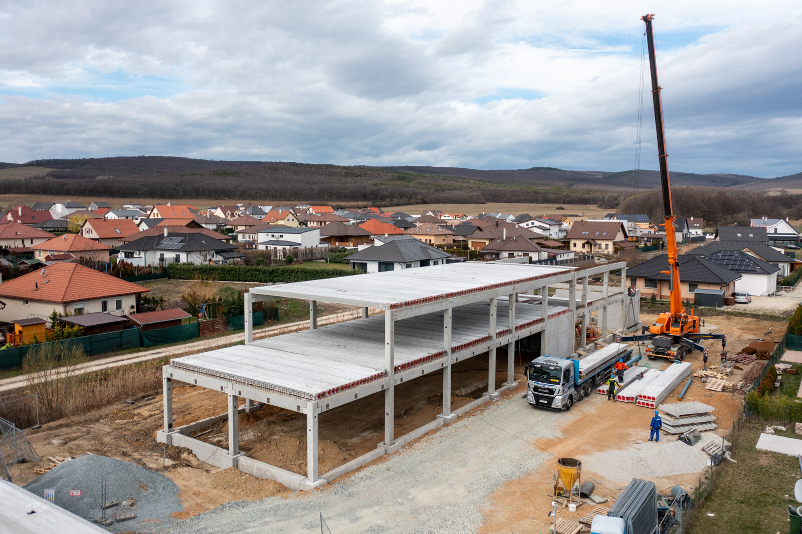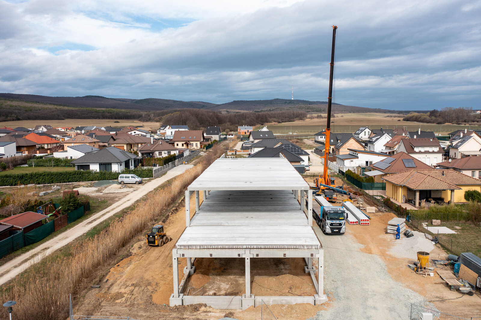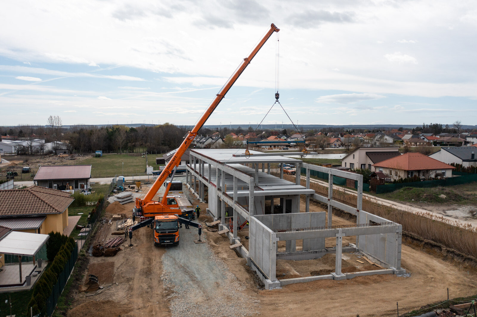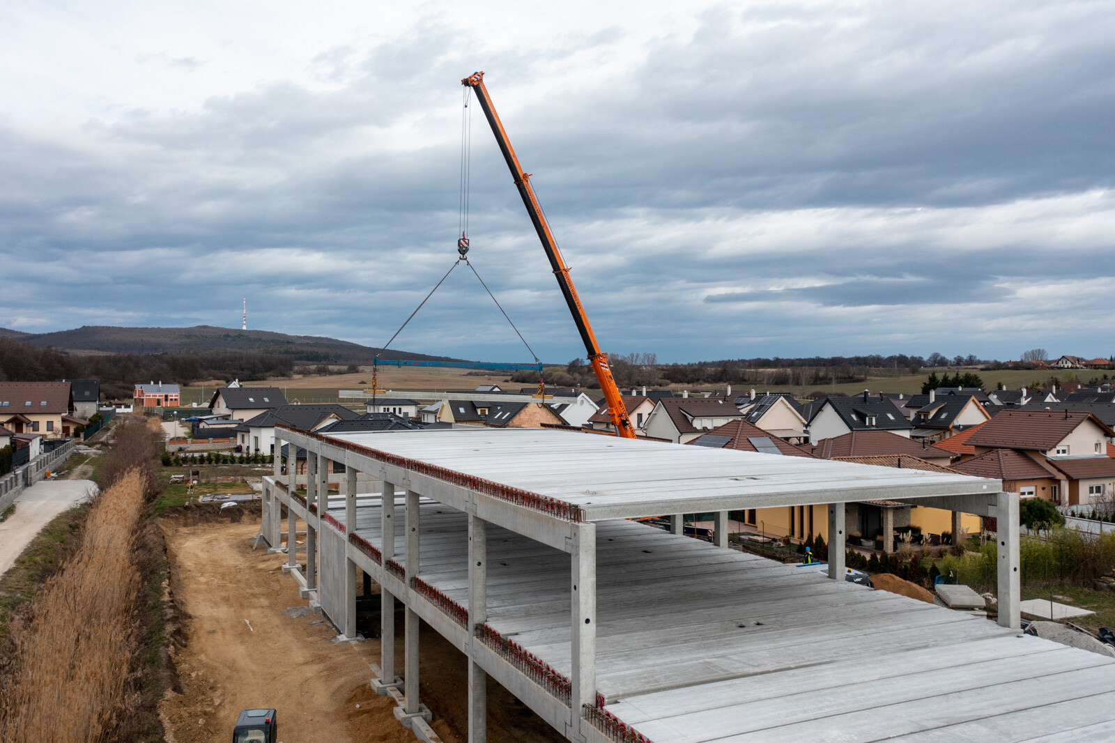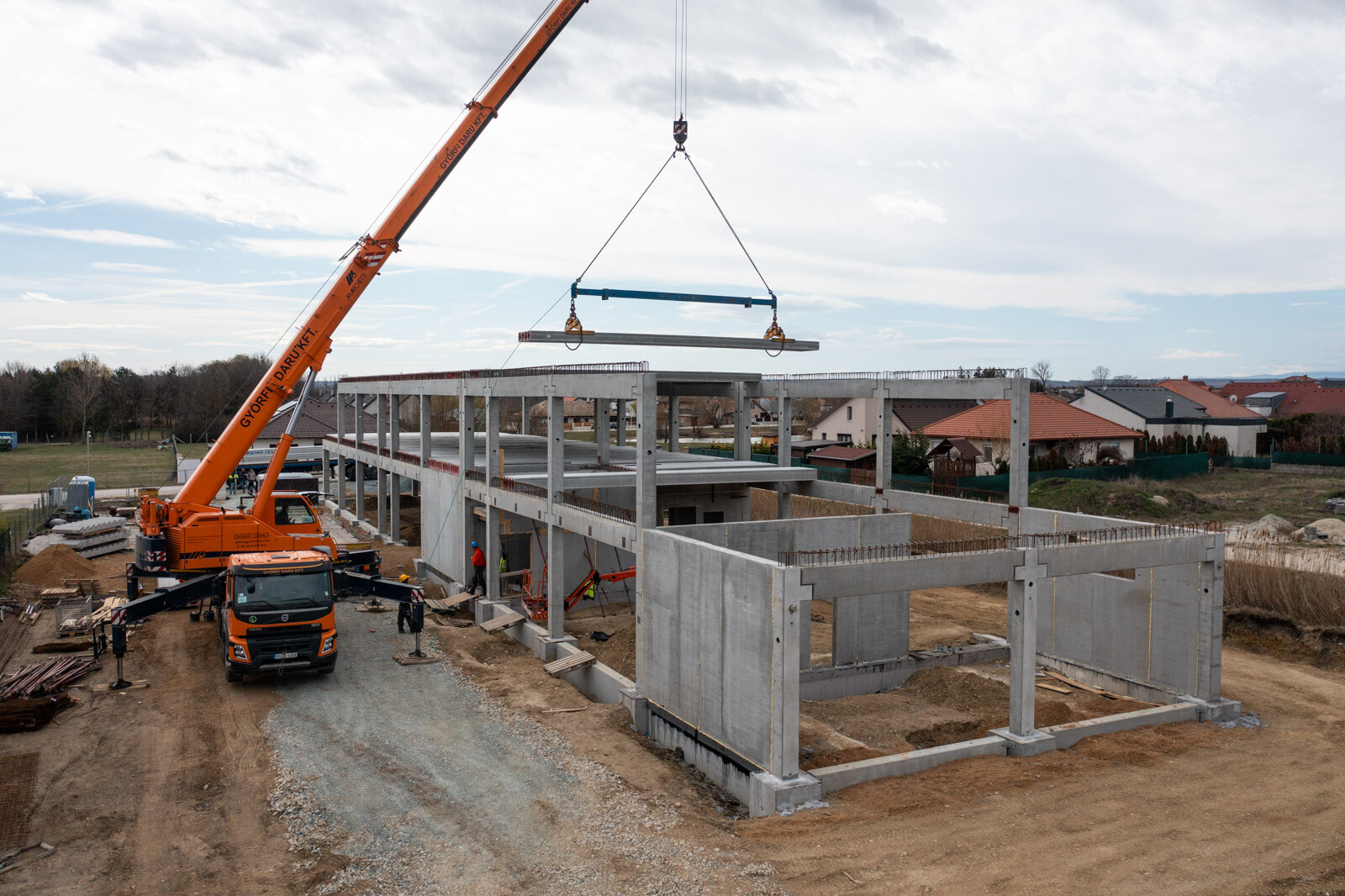 Erről Samu Bence részletesen beszámolt lapunknak: elmondása szerint először a monolit pontalapokra kerültek fel az előregyártott kehelynyakak és talpgerendák, majd ezek után készült el a pillér vázszerkezet. Az épület két szintjén gerendákat és üreges födémeket, kéregfalakat és kéregfödémelemeket építettek be, a szintek között pedig előregyártott lépcsőkarokat helyeztek el.
