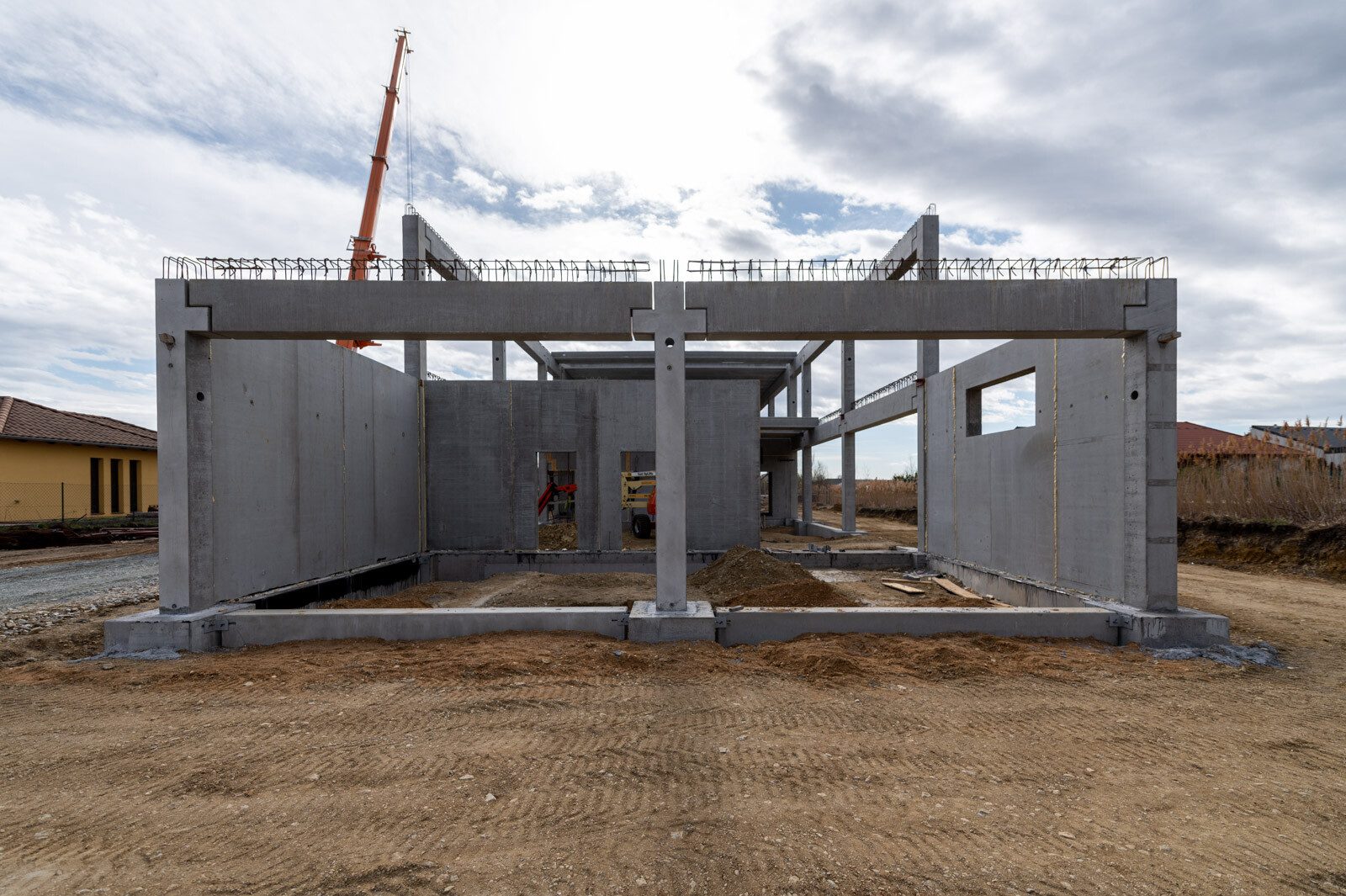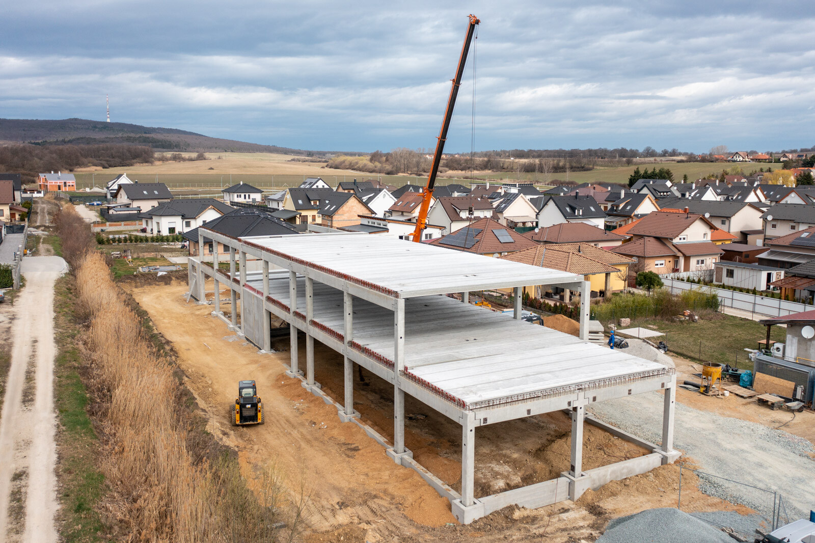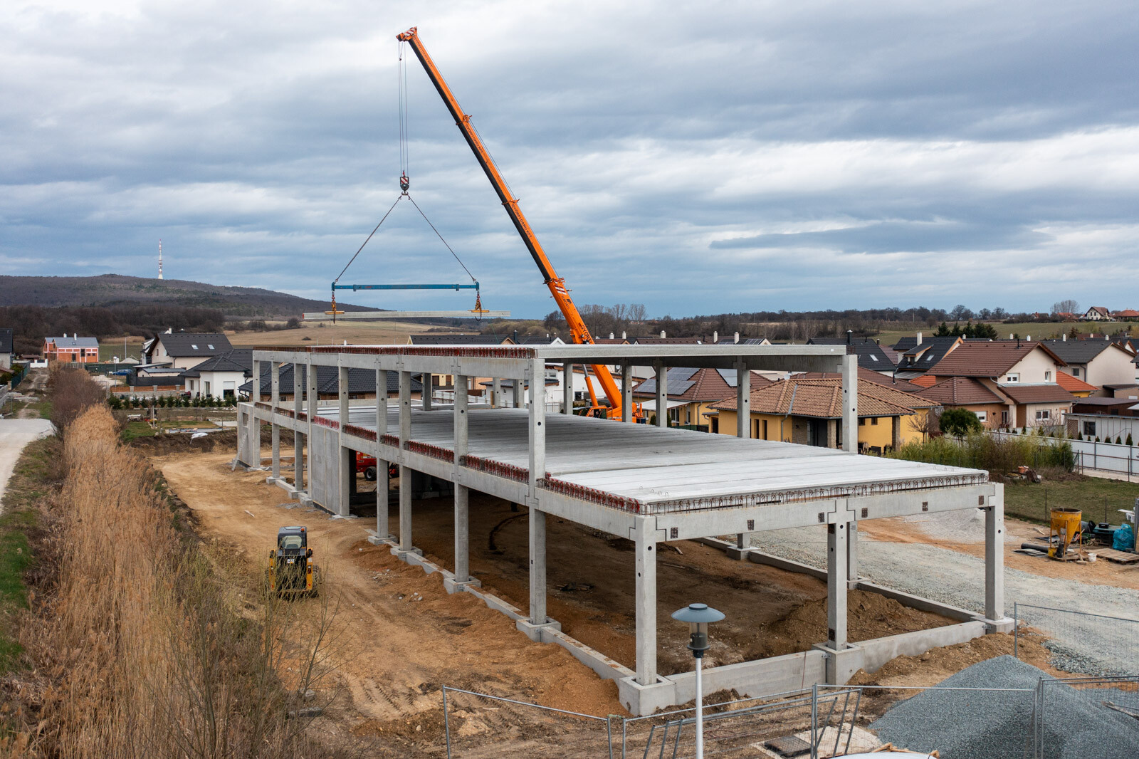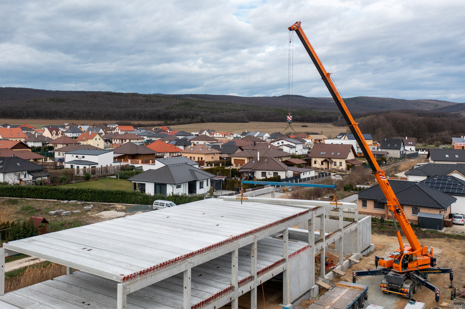 Erről Samu Bence részletesen beszámolt lapunknak: elmondása szerint először a monolit pontalapokra kerültek fel az előregyártott kehelynyakak és talpgerendák, majd ezek után készült el a pillér vázszerkezet. Az épület két szintjén gerendákat és üreges födémeket, kéregfalakat és kéregfödémelemeket építettek be, a szintek között pedig előregyártott lépcsőkarokat helyeztek el.