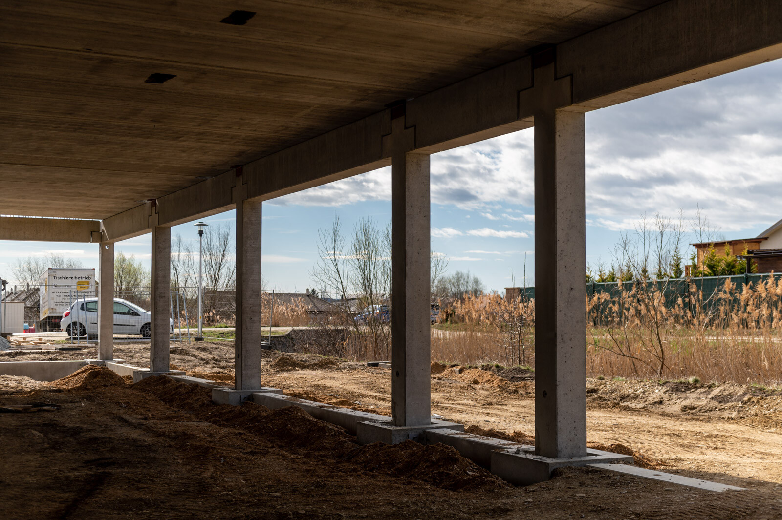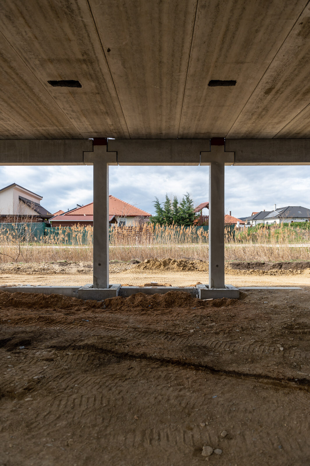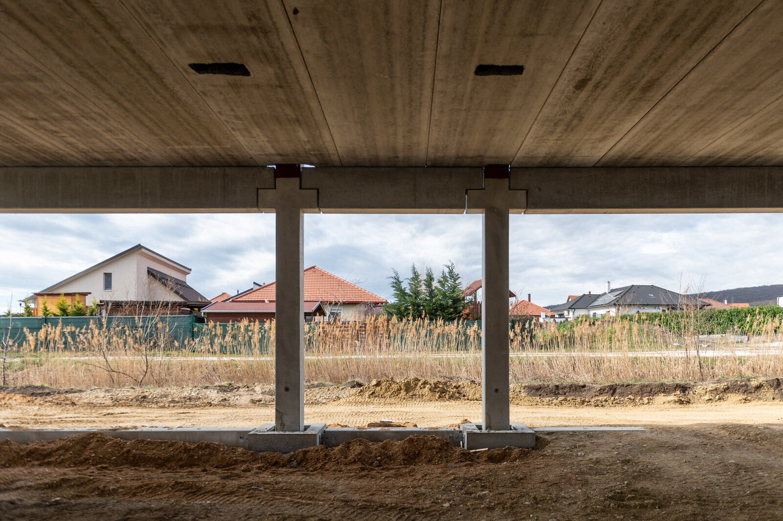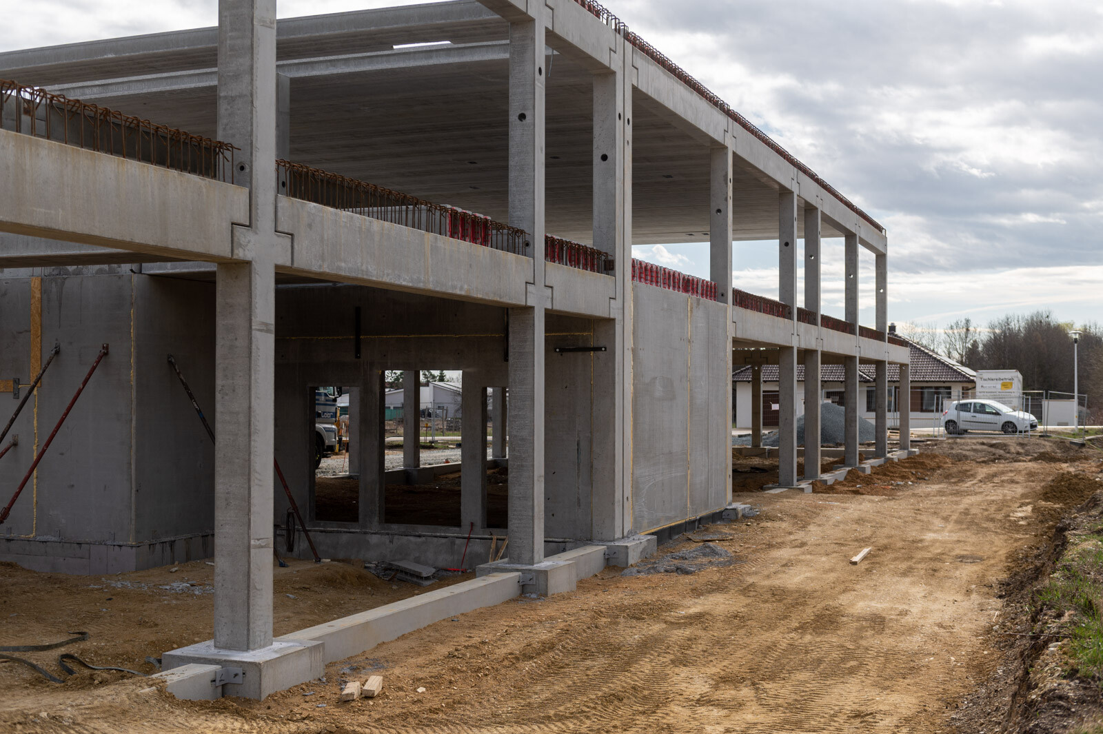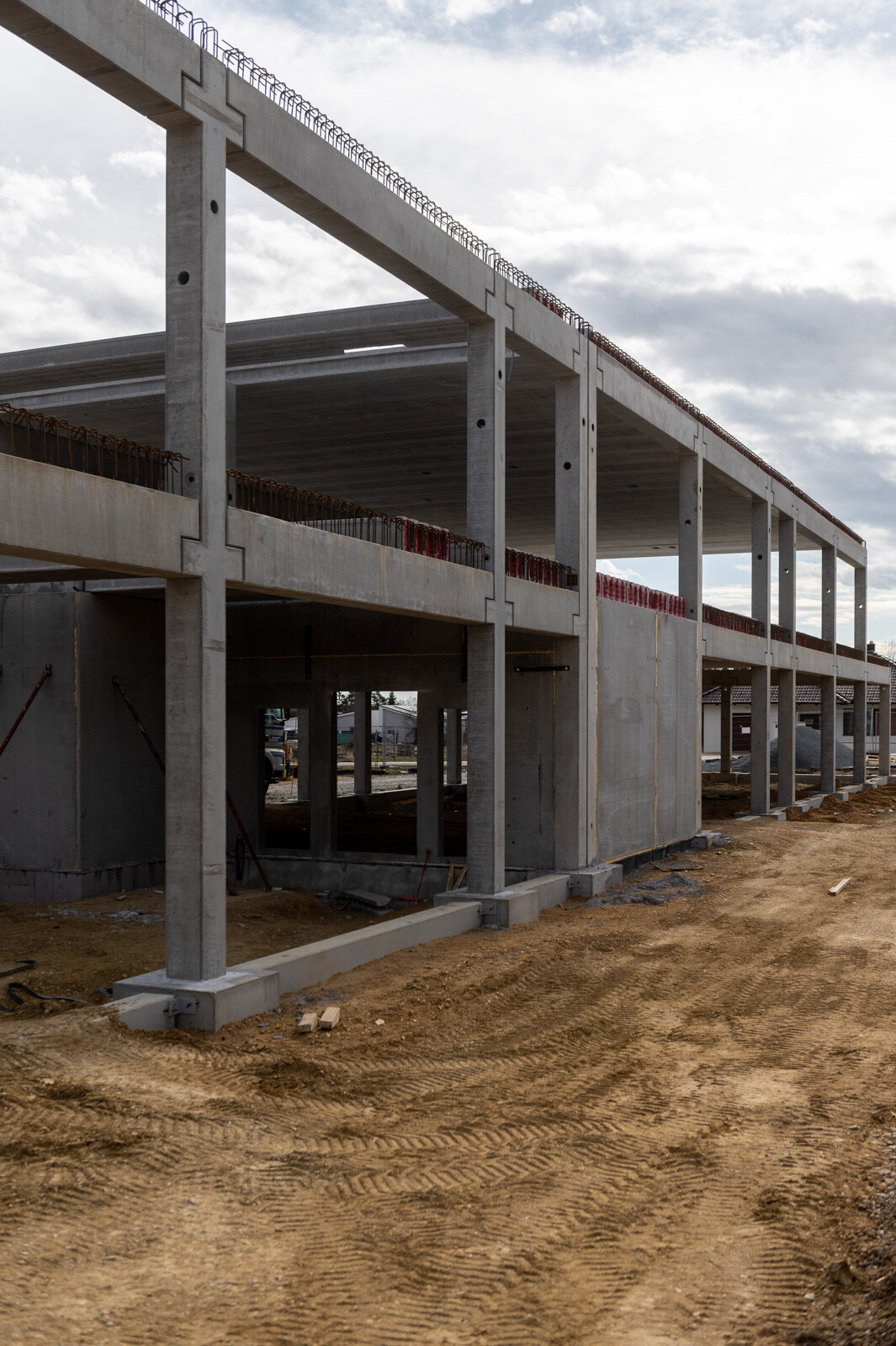 Erről Samu Bence részletesen beszámolt lapunknak: elmondása szerint először a monolit pontalapokra kerültek fel az előregyártott kehelynyakak és talpgerendák, majd ezek után készült el a pillér vázszerkezet. Az épület két szintjén gerendákat és üreges födémeket, kéregfalakat és kéregfödémelemeket építettek be, a szintek között pedig előregyártott lépcsőkarokat helyeztek el.