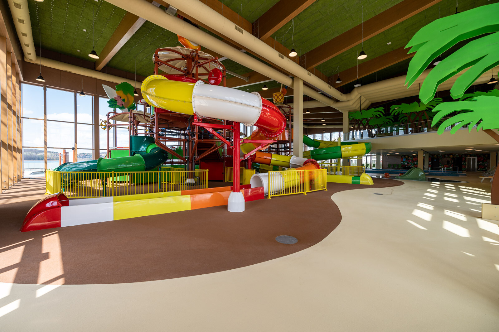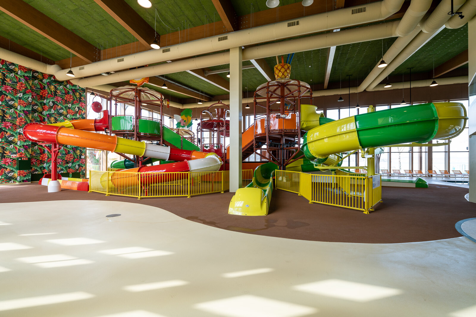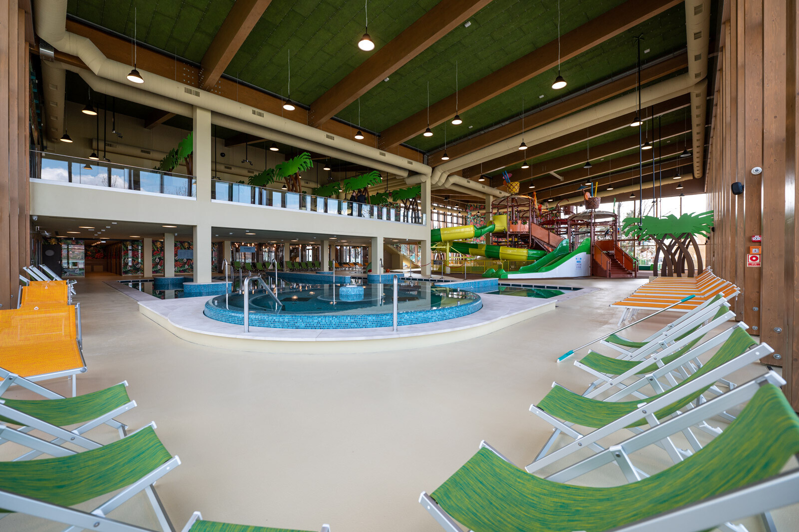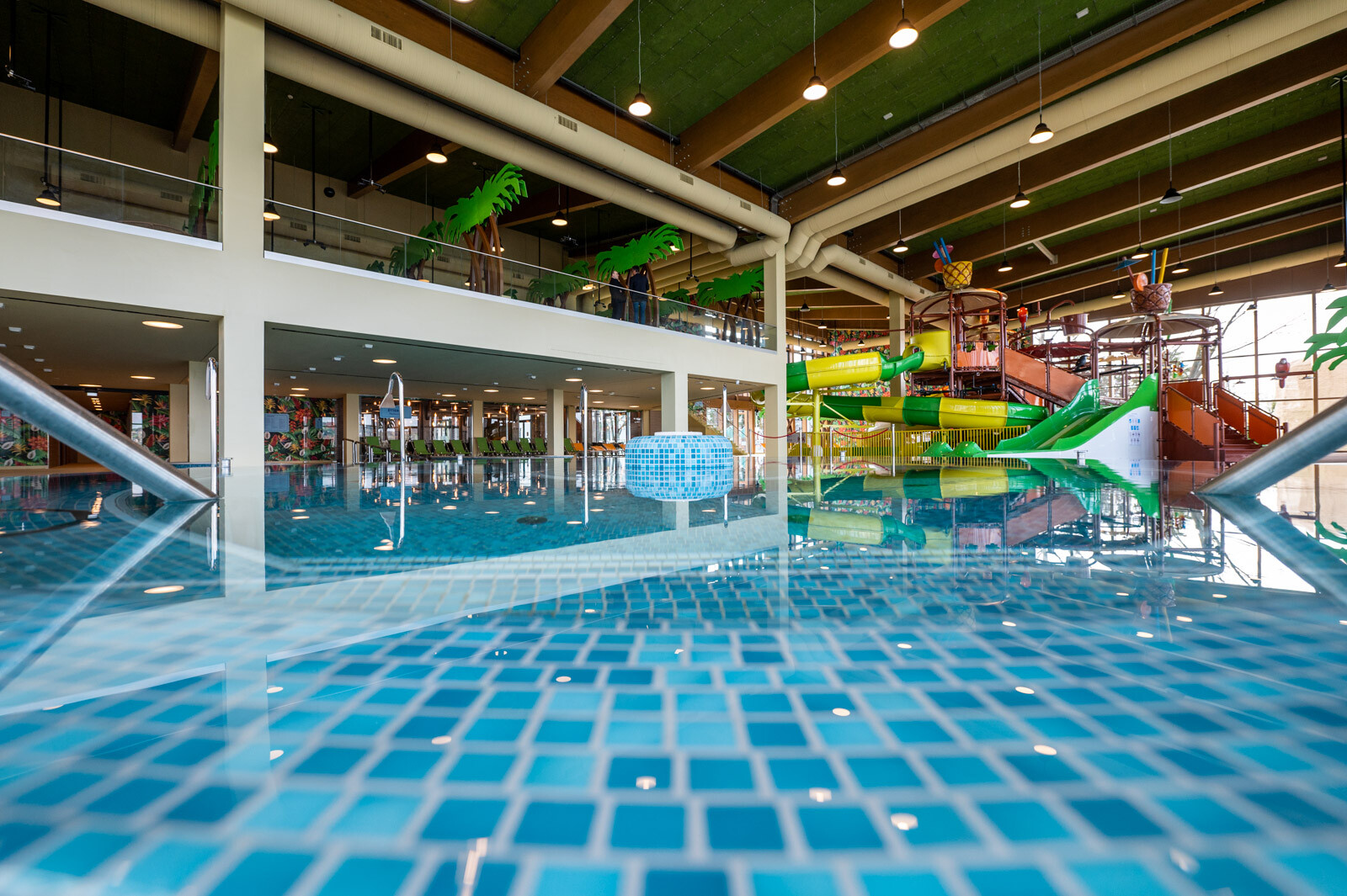 A kivitelezés részét képezte egy mennyezetre függesztve futó kisvasút, valamint a wellness részleg kialakítása, továbbá a külső területeken lefúrt geotermikus szondák és az épületek tetején kialakított extenzív zöldtetők megvalósítása. A Family Park földszint vizes játékterében kaptak helyet különböző kialakítású és méretű gyermekmedencék csúszdákkal, míg a szintén a földszinten található száraz játéktérben számos olyan tematikus játékelem került elhelyezésre, mint a függesztett sínpályán haladó monorail, VR szoba, 3D tematikájú mászófal vagy lézer labirintus. A galéria szinten kialakított pihenőtérben sószoba, masszázs helyiség, szauna és gőzkabin is kialakításra került. A két épület körül pedig pálmafákkal és szökőkúttal kialakított zöldövezeti terület varázsolja tengerpartivá a kilátást.