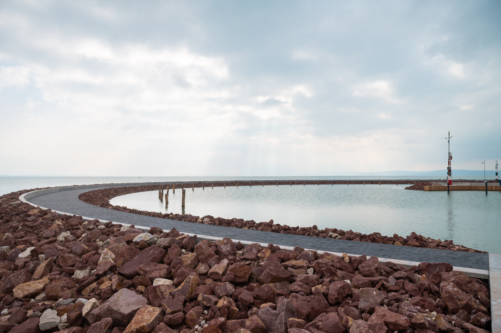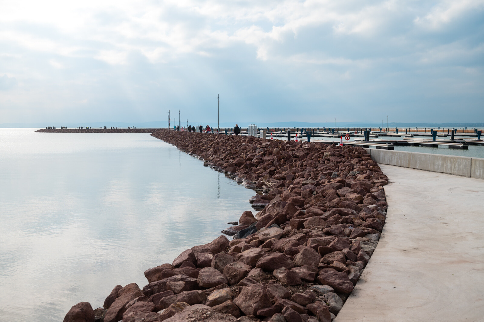 Az eredeti hullámvédő móló 178 méteren átépítésre került, mely funkciójában kettős. Az egyik, hogy az úszó kikötői mólókat a hajótulajdonosok ezen tudják megközelíteni, azaz a kikötői funkciója továbbra is megmarad, a másik, hogy közcéllal sétányként is hasznosul. Ezen kettős funkciónak megfelelően került kiépítésre. A vb. előregyártott 4,3 m széles járópanel-sor adja a 4,0 m széles járófelületet és sétányt, valamint a vb. hullámtörő gerenda alapját.