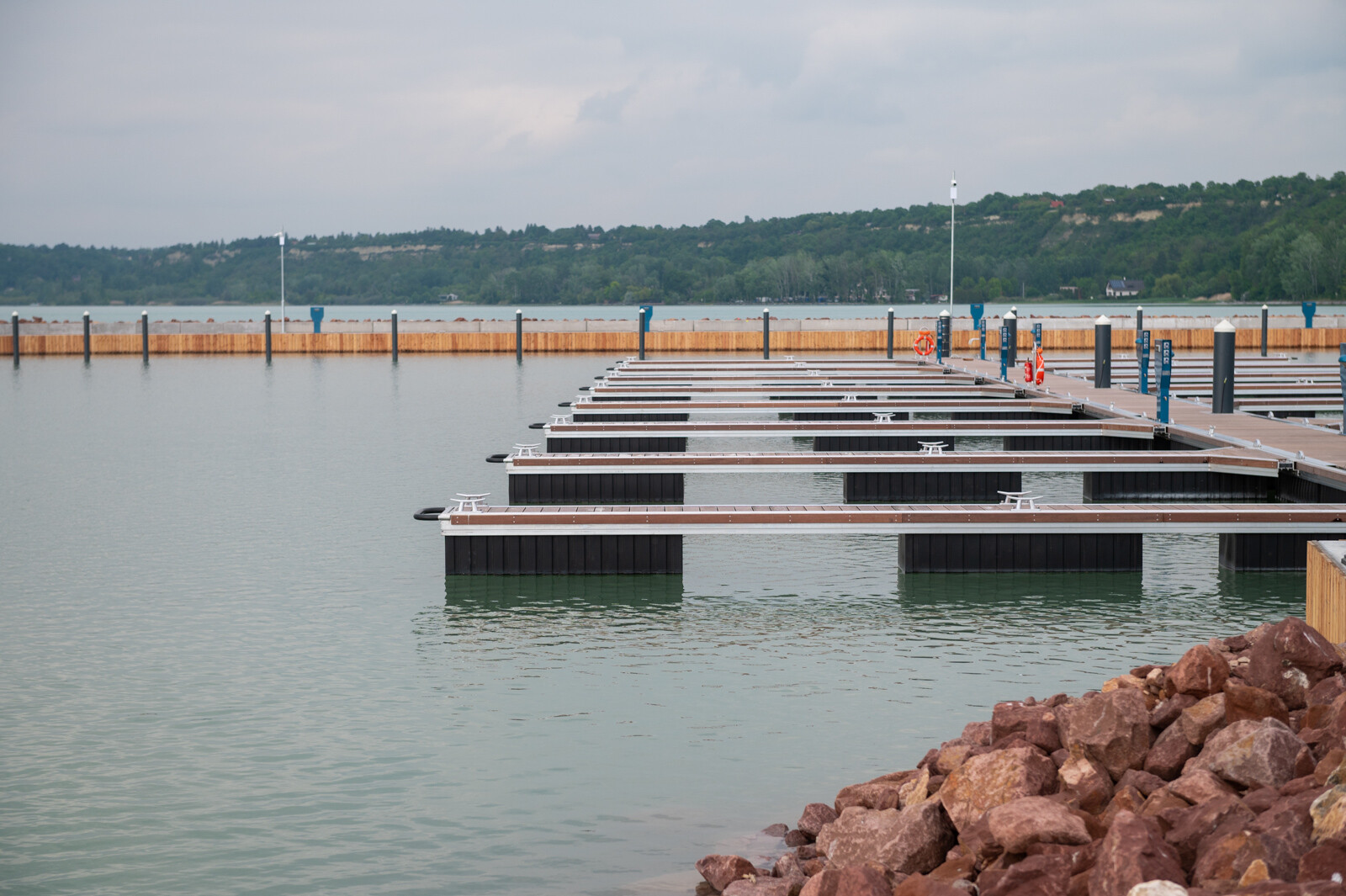 A hátsó függőleges partfal és az északi hullámvédő móló nyugati szakaszával paralel, azaz a déli mólóra merőlegesen négy úszó kikötőstég rendszert helyeztek el. A pontonokból álló egy-egy rendszer a Fa Hajó gyártmánya. A négy darab úszómóló összesen 136 hajó kikötésére szolgál, melynek előnye, hogy nincs rögzítve a tó fenekéhez, hanem a vízen fekve követni tudja a szintváltozást, ez nagyban megkönnyíti a hajókba történő be- és kiszállást, vagyis nem szükséges korrigáló lépcső. További előnye, hogy nemcsak a hajók orránál, hanem a teljes hosszán be lehet szállni, ebben segítenek az úgynevezett fingerek.
