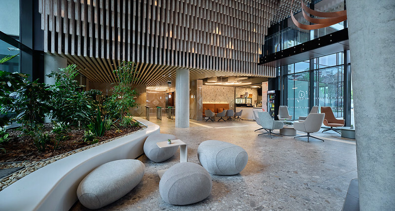 A Psota Irén emlékparkkal egyidőben a Corvin Innovation Campus közelmúltban átadott első üteme is egy légies, lendületes hatású installációval bővült. A bejáratánál található tágas lobbyt és az irodaház belső kertjét egy különleges, a mennyezeten végighullámzó alkotás kapcsolja össze.
