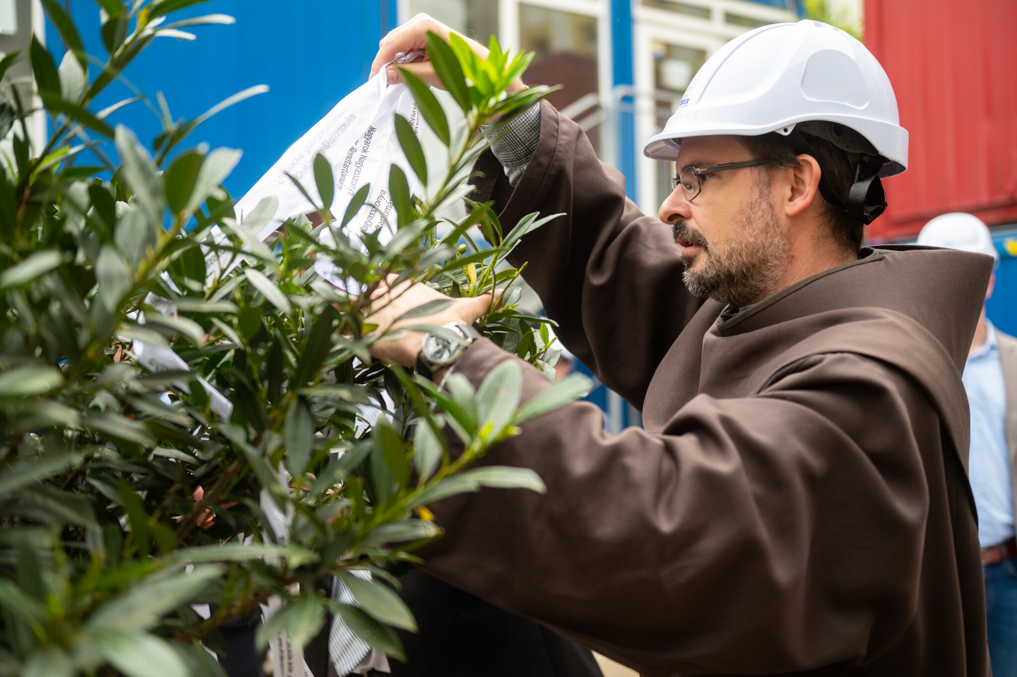 Dr. Varga Imre Kapisztrán, ferences szerzetes, a Temesvári Pelbárt Ferences Gimnázium és Kollégium lelki igazgatóhelyettese beszédében megemlékezett Hársligeti Miklós atya korábbi tartományfőnökről, aki megálmodta ezt az iskolát és Nagy Arisztid atyát, aki megvalósította és a Kossuth téri front beépítésére is – amely ebben a beruházásban valósul meg – voltak tervei már 1946 körül.