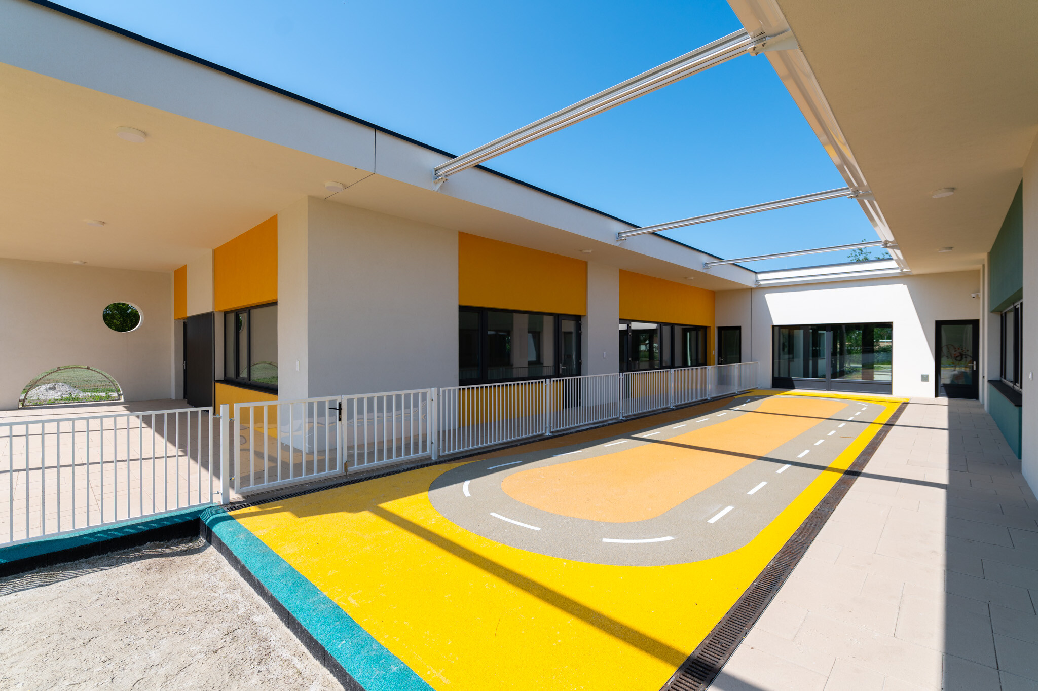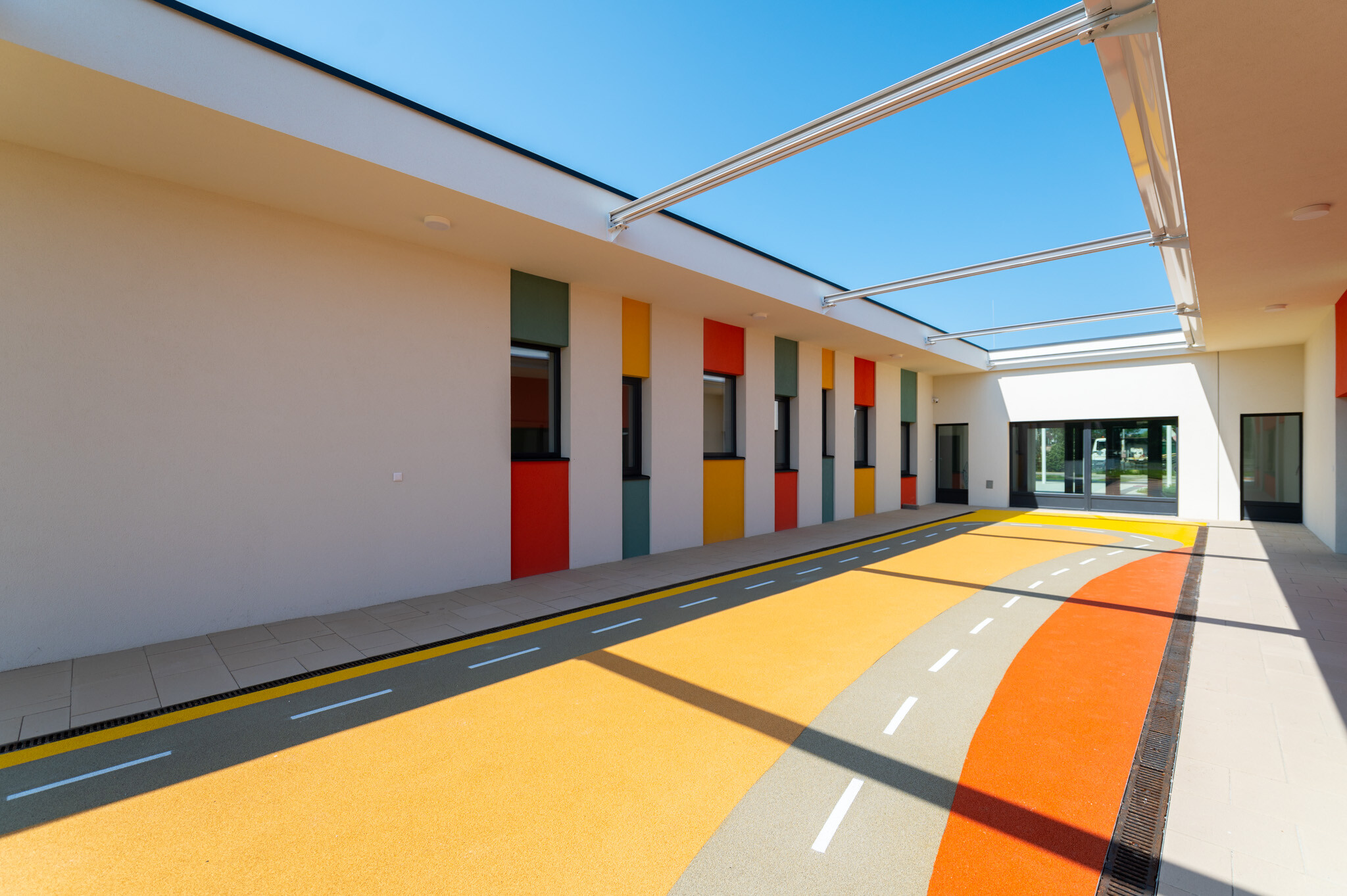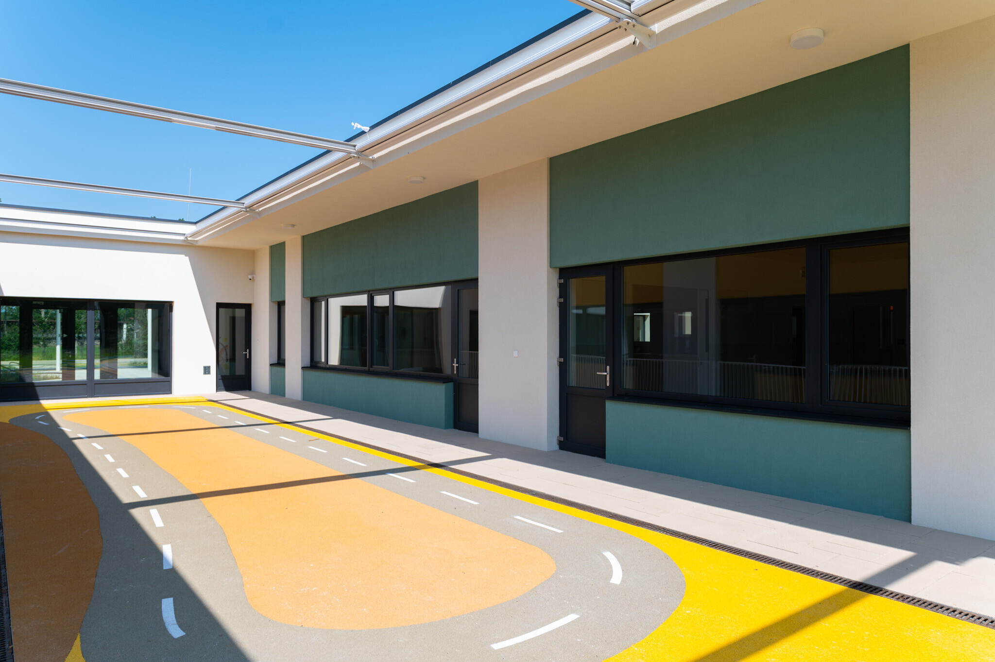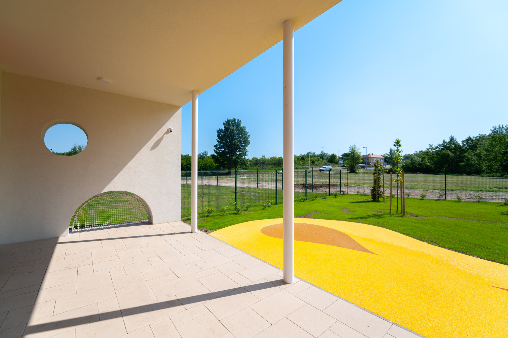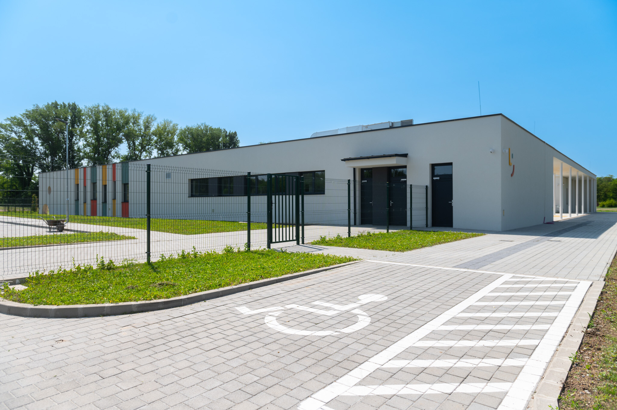 A létesítményhez tartozik egy előtetőkkel ellátott, 230 négyzetméteres fedett terasz, valamint egy oldalkert és egy különleges elemekkel kialakított vidám játszókert. A 22 férőhelyes parkoló akadálymentesített, ezen túl 15 kerékpár elhelyezésére alkalmas tárolót is létrehoztak.