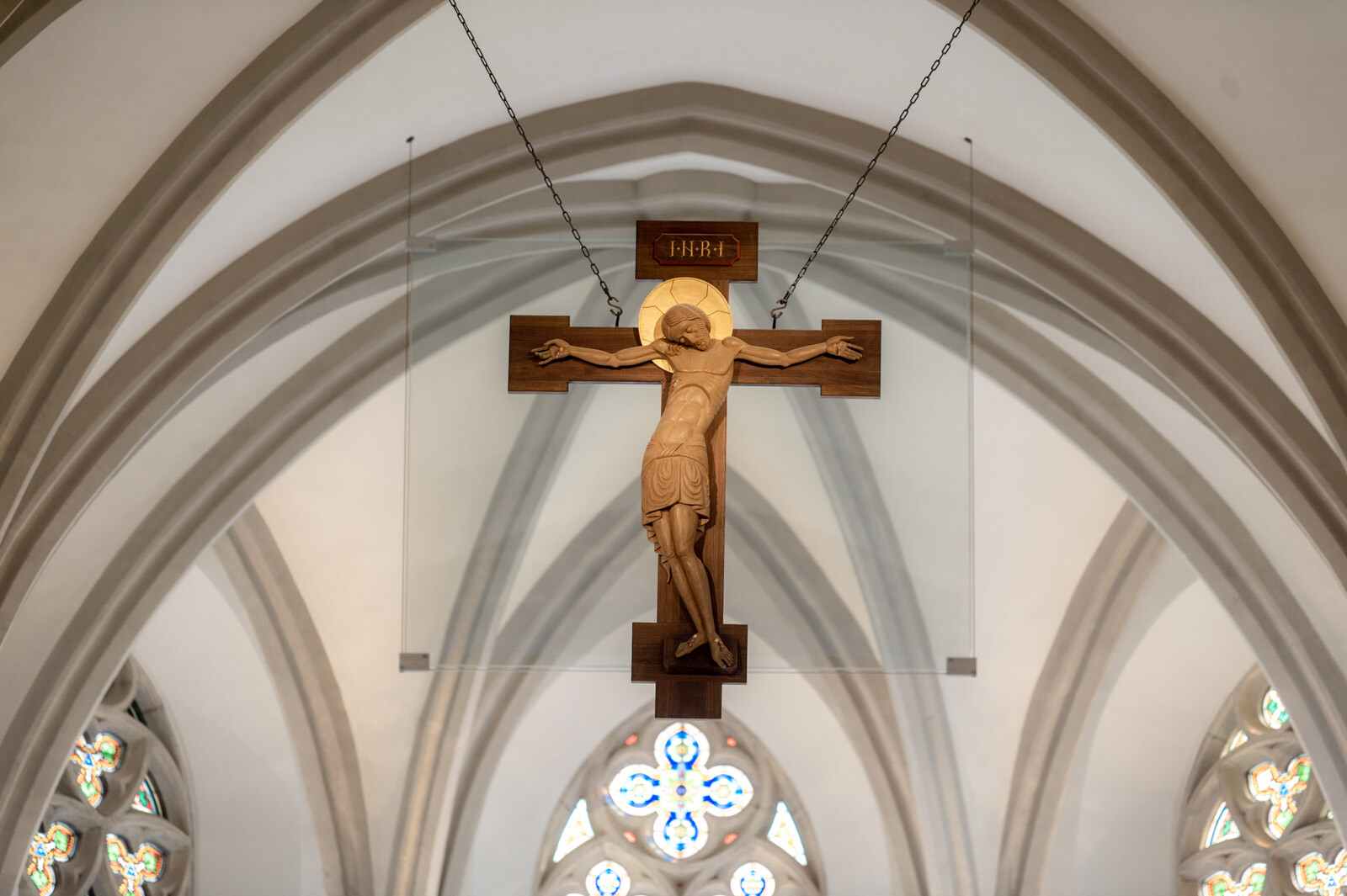 „A liturgikus események sokrétűsége miatt a közel 1,2 tonna tömegű faragott oltárt mozgathatóvá kellett tenni: a hétköznapokon tartott általános misék, az ünnepi misék, illetve az egyéb szertartások (esküvő, keresztelő, egyházi ünnepek) különböző térbeli elrendezéseket igényelnek. Ezen mozgatható tömeg terhelésének felvételére az altemplom gótikus keresztbordás kőboltozata nem volt alkalmas.