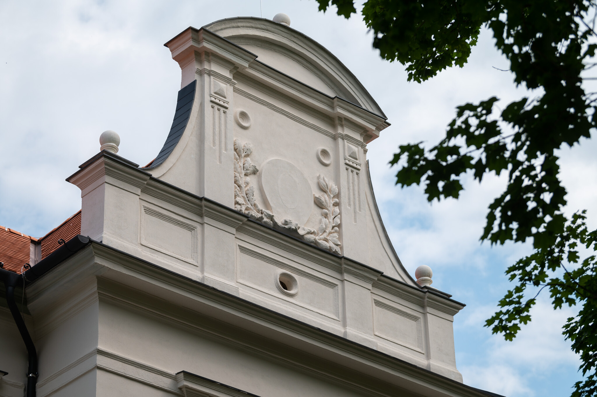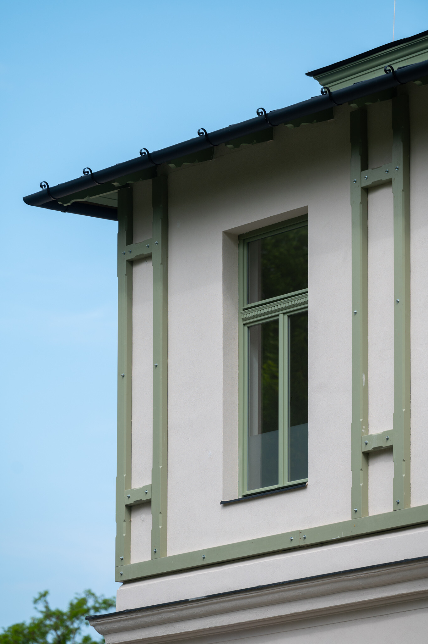 Fontosnak tartotta megemlíteni, hogy mind a tetőn, mind a tető alatti részen párkányok díszítik az épületet, melyek jelentős részét újra kellett készíteni. „Itt a kvádervakolat nevű termékünket használták, amely az egy rétegben nagyobb vakolatvastagságot megkívánó felületeknél jó választás. Itt a szokottnál nagyobb vastagságot kell egyszerre felvinni, amit aztán az úgynevezett kihúzókocsival gyalulják vissza friss állapotában.”