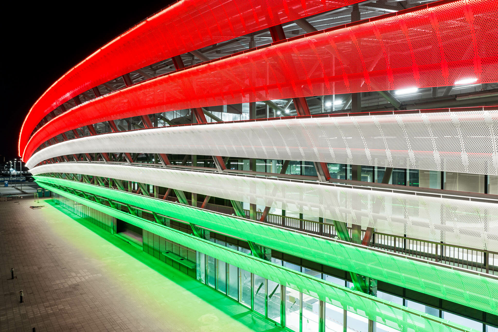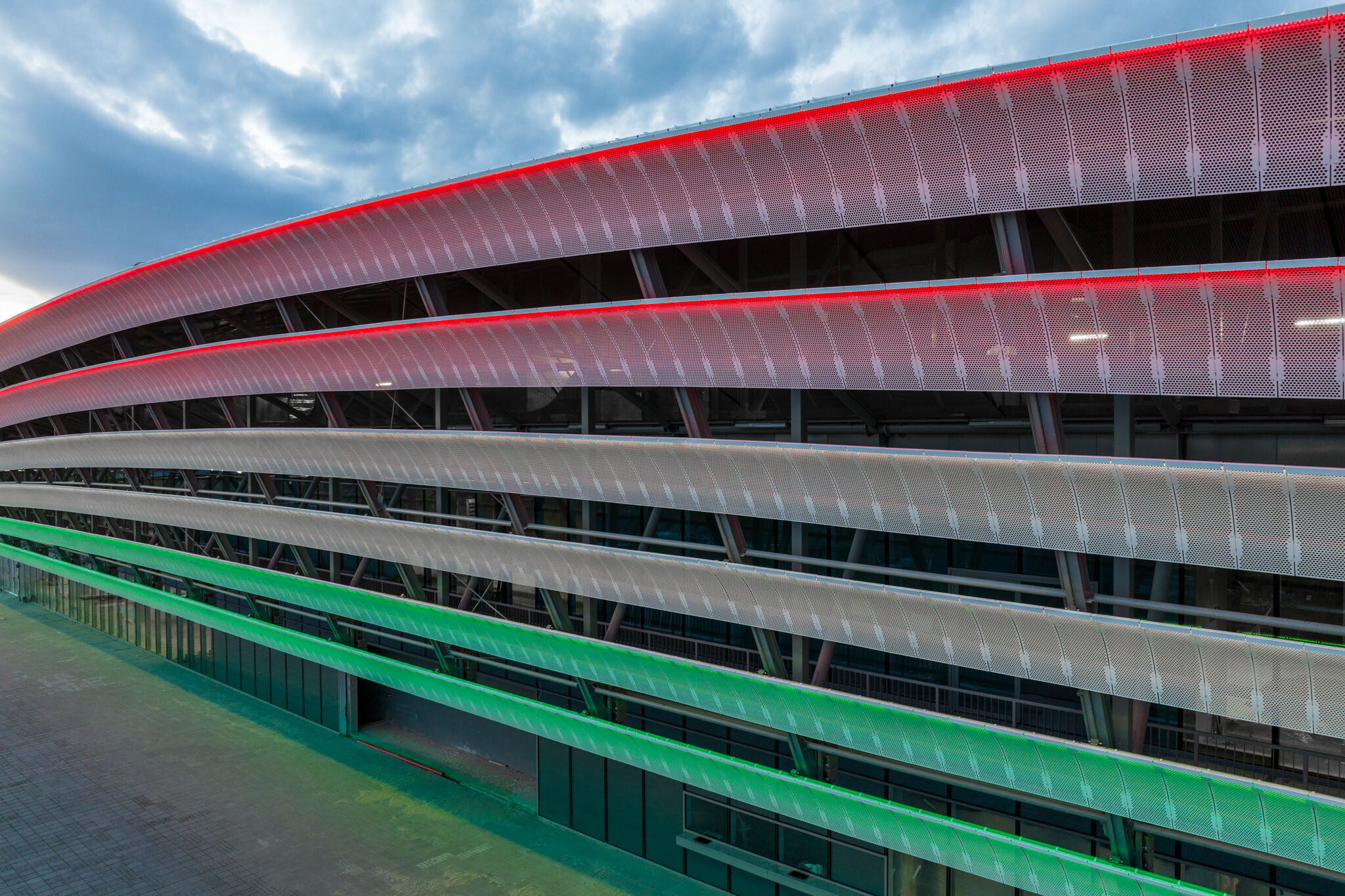 Eredménye egy 2595 méteres, egybefüggő hatást keltő, szabadon változtatható és variálható színű LED fényjáték. A lamellákat megfelelő szögben és fényerővel megfestő LED-pálcák 1204 darab egyedi méretben gyártott elemből állnak össze egy egységgé.