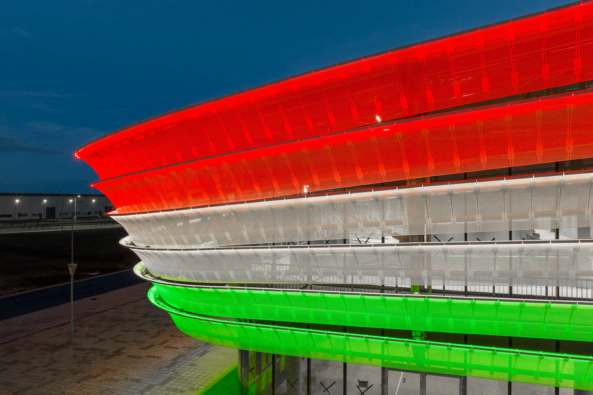 Az íves homlokzati sávok egyesével, egyedi méretekben gyártott lamellákból állnak össze; összesen 5.272 darab egyedi lamellát helyeztek el, hat sorban – tudtuk meg a kivitelező cégtől. Ezt a technológiai megoldást kellett lekövetni a díszvilágítási lámpatestekkel is, mely egy közel fél éven át tartó folyamatos, minden apró részletre kiterjedő egyeztetés-sorozatot jelentett a homlokzatot építő vállalkozó és a díszvilágítás gyártója/kivitelezője között.