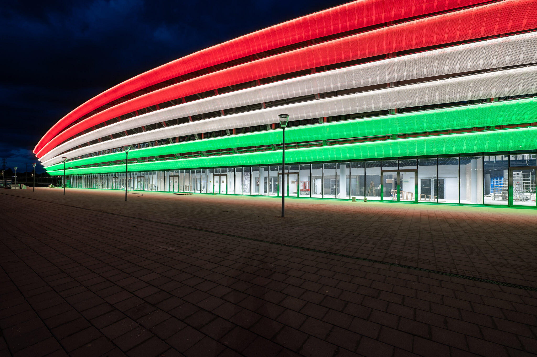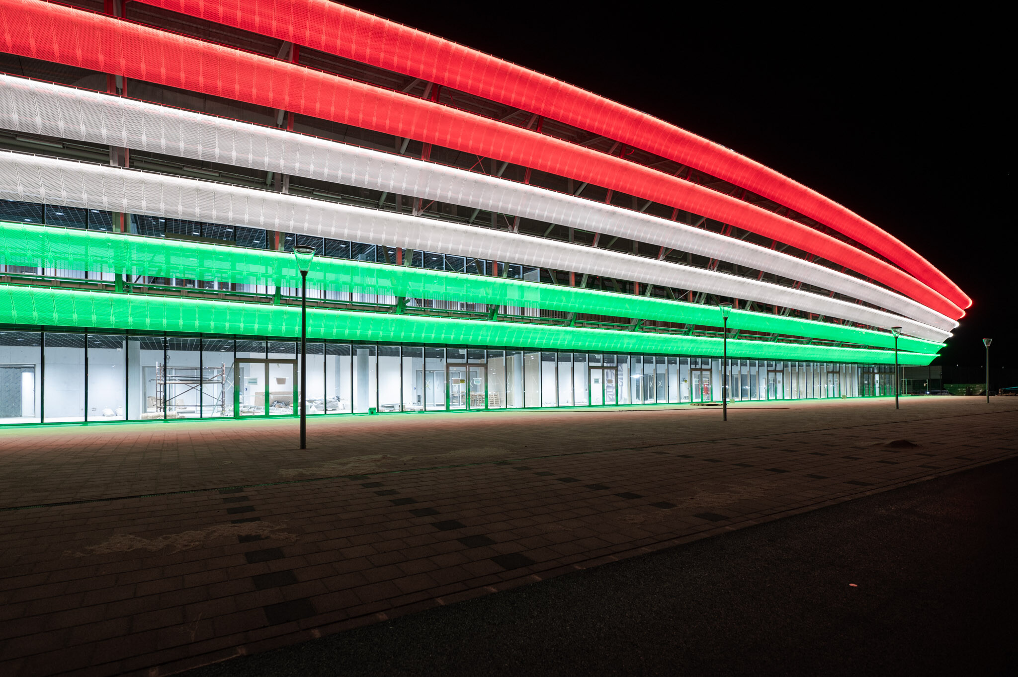Megtartották a fénypróbát Székesfehérvár új multifunkcionális rendezvény- és sportcsarnokánál. Az épület kívülről már elnyerte végleges formáját, így roppant látványos jelenség volt a homlokzatvilágítás teljeskörű tesztelése. A homlokzat lágy, harmonikus ívein megjelenő díszvilágítás, melynek szerelését a Market Építő Zrt. leányvállalata, a Vilati Szerelő Zrt. végezte, határozott karaktert kölcsönöz az aréna megjelenésének.