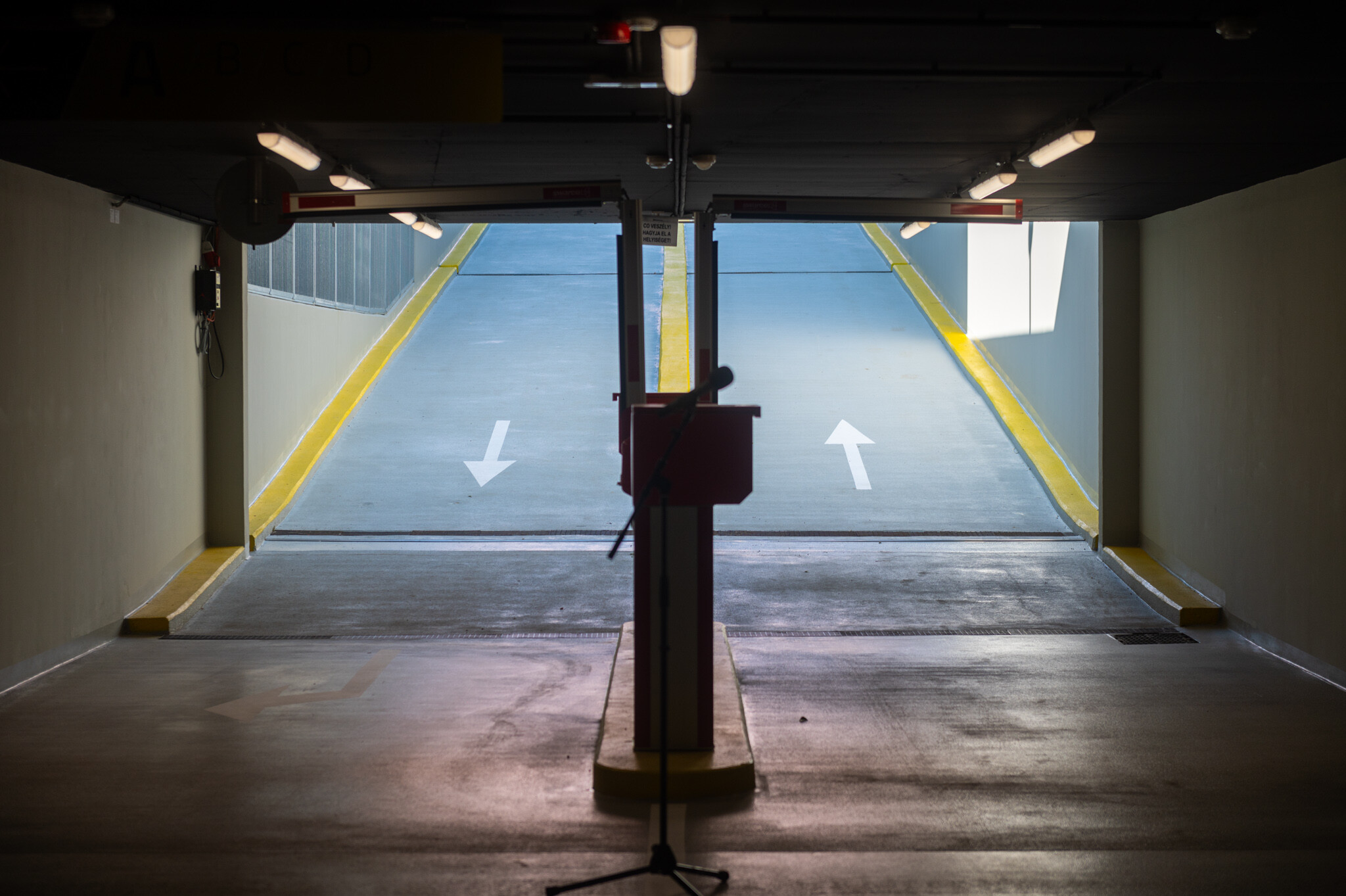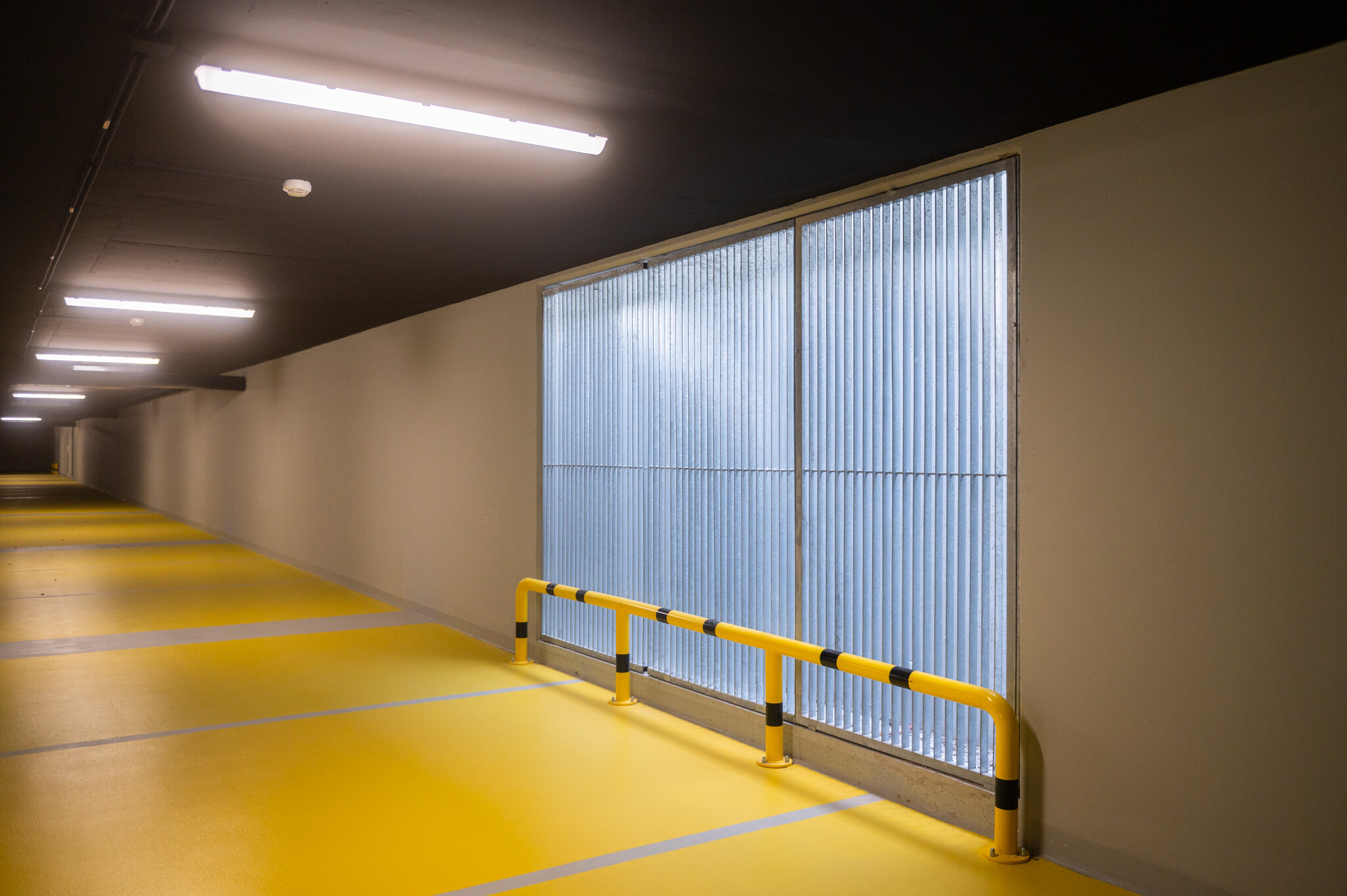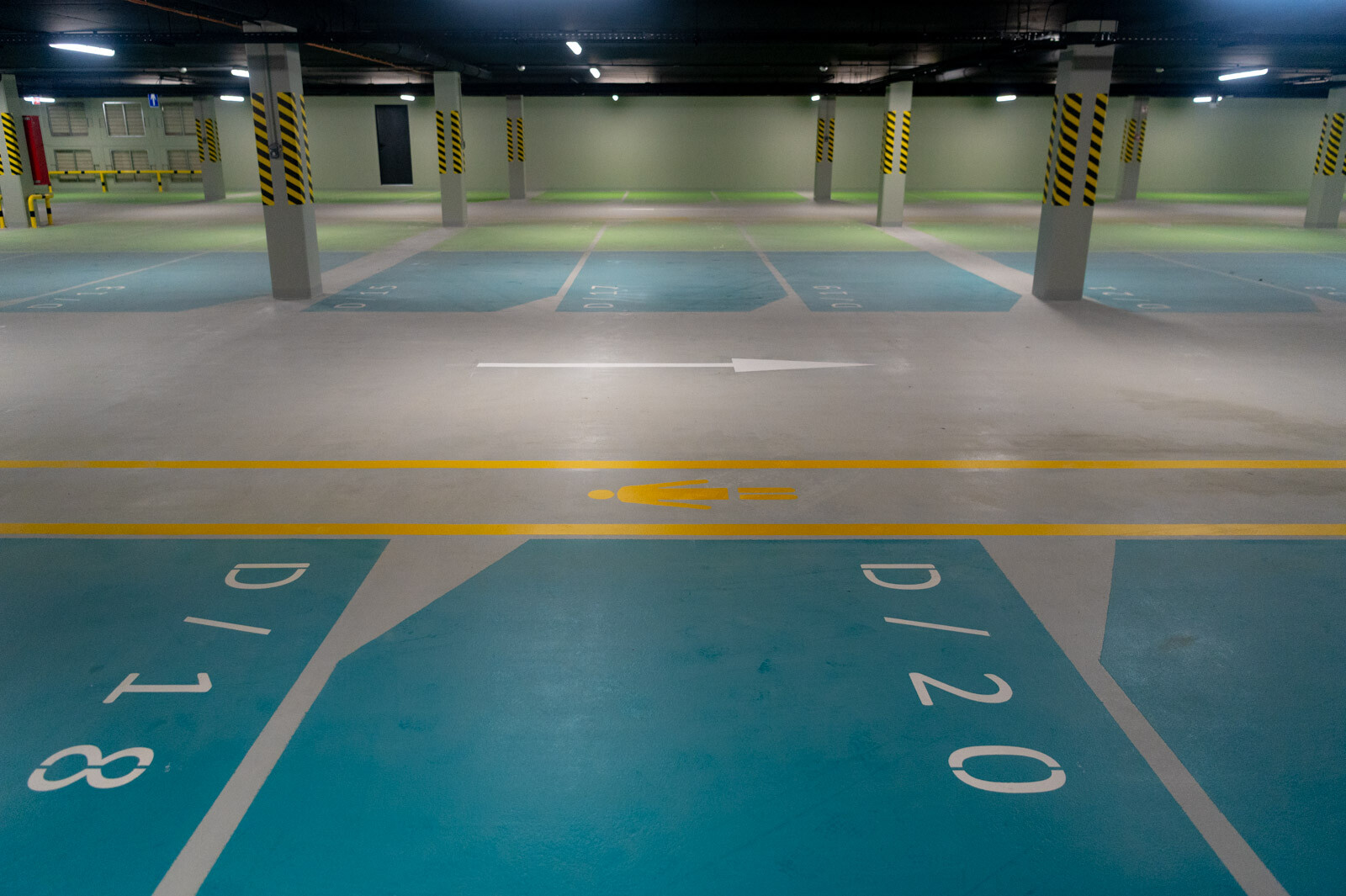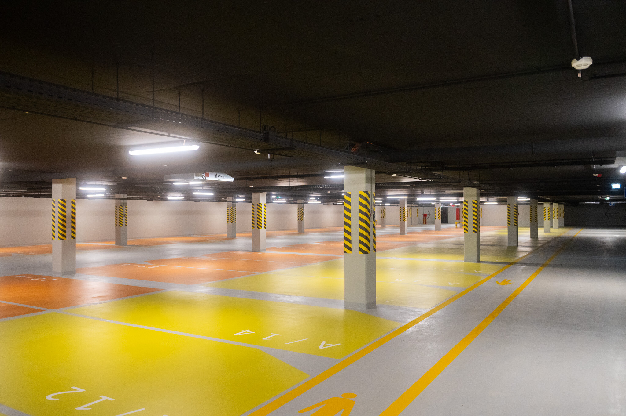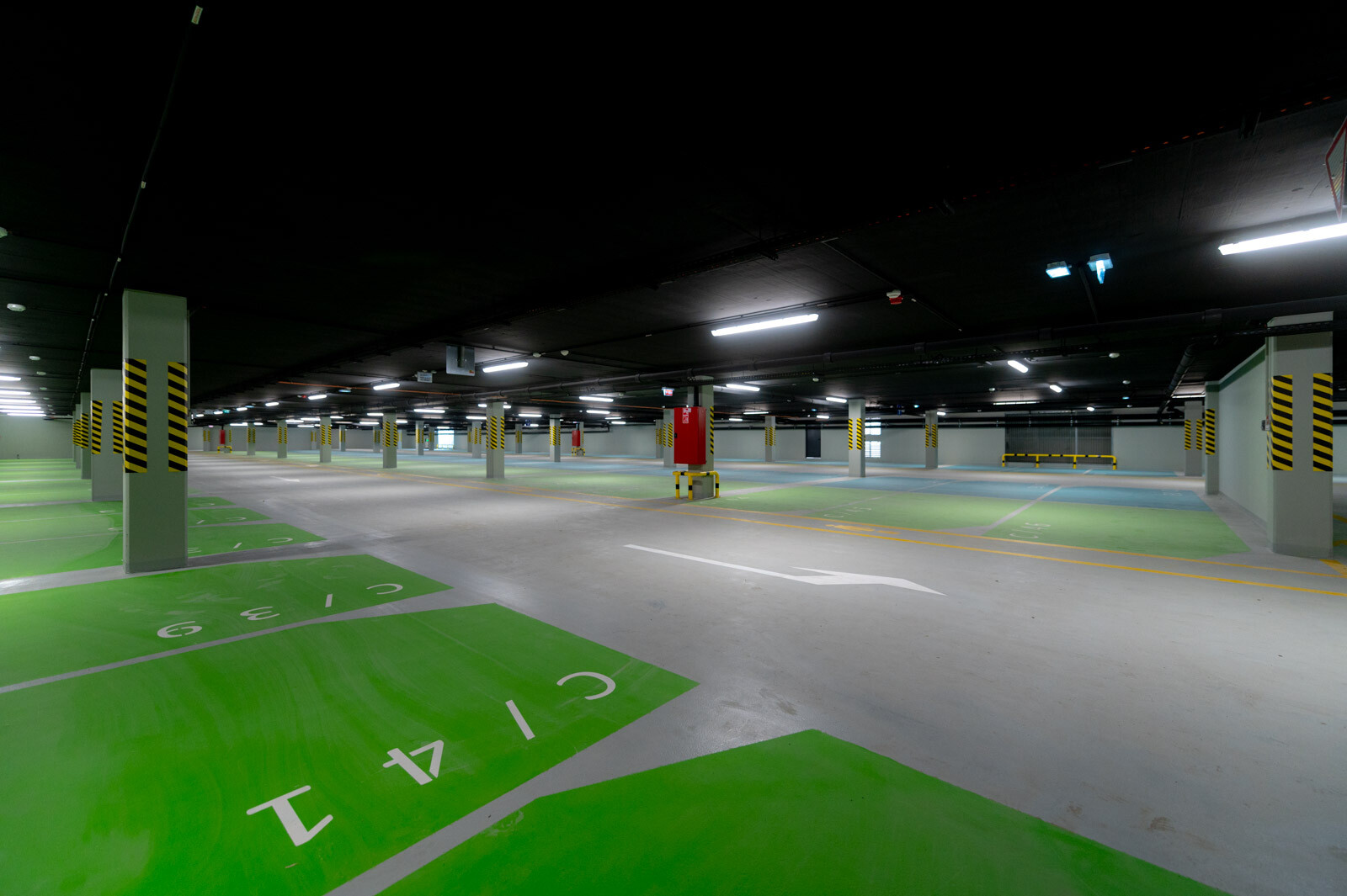 A 200 férőhelyes mélygarázsban 100 egyetemi és 100 üzleti hasznosítású parkolóhelyet alakítottak ki, ami a terület északkeleti részén, a rekreációs közösségi és sporttér alatt kapott helyet. Az egyetemi campus gépjármű közlekedési főbejáratát áthelyezték, ahonnan rámpán keresztül lehet lejutni a felszín alatti parkolókhoz.