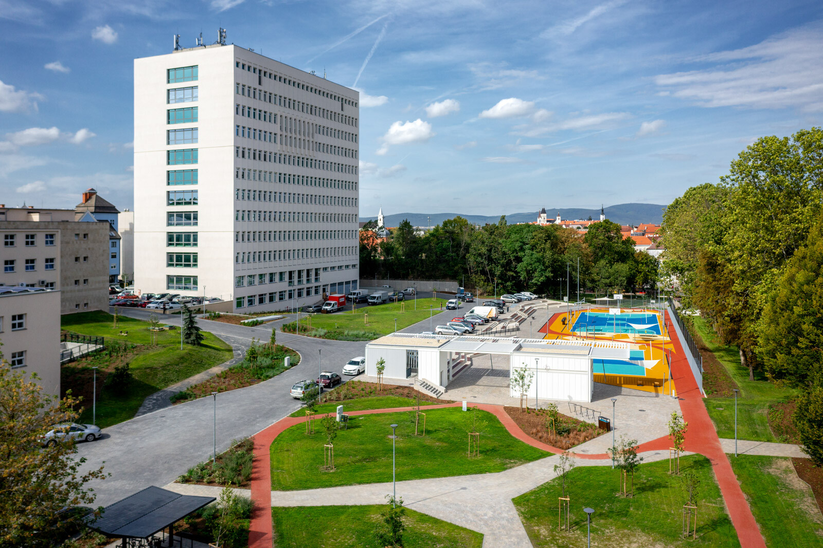 A WEST HUNGÁRIA BAU Kft. és a VEMÉV-SZER Kft. konzorciumának kivitelezésében elkészült az egyetem tereit a gyalogosfogalom számára megnyitó „zöld campus” projekt, illetve a kétszáz férőhelyes mélygarázs is.