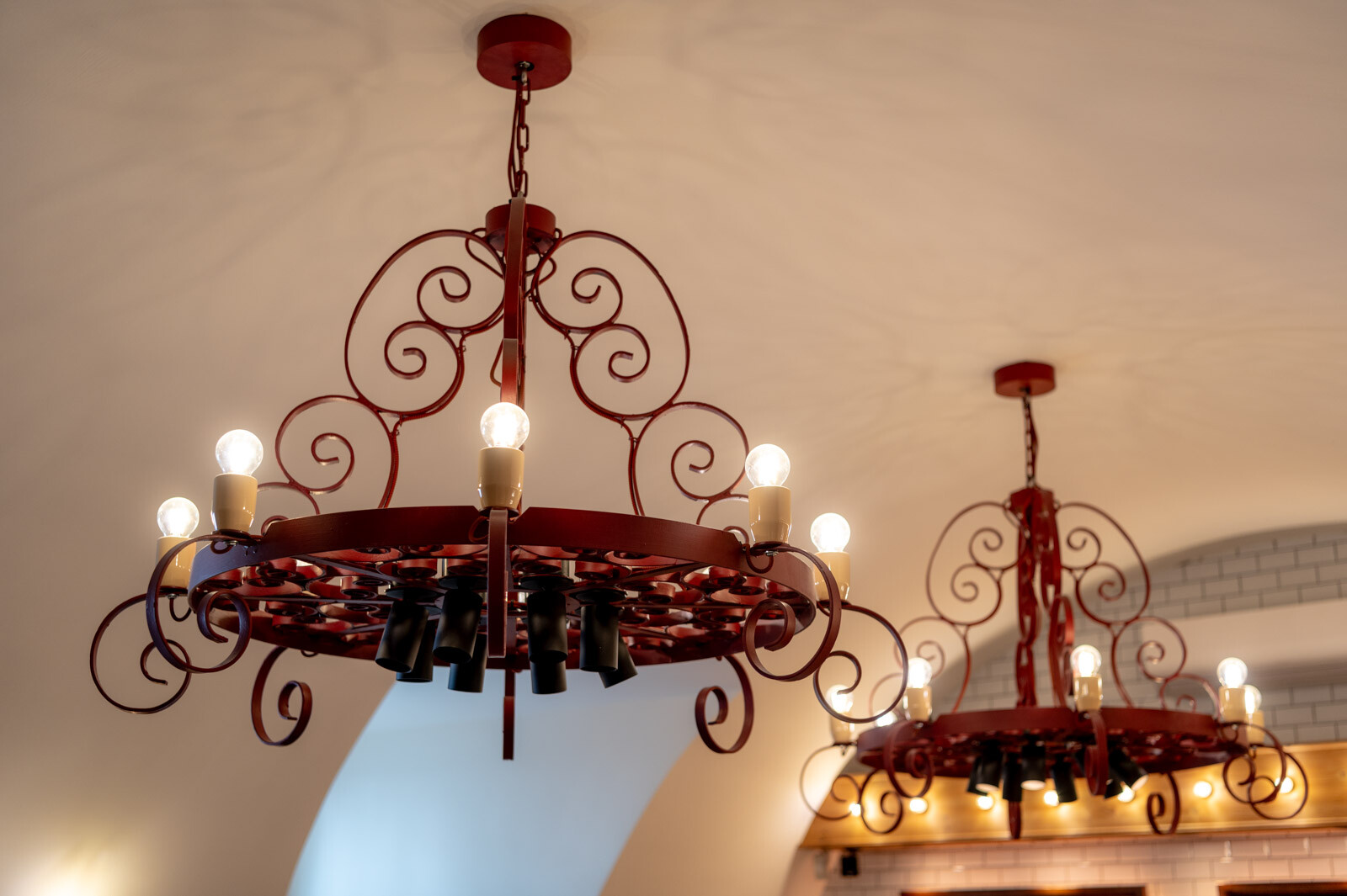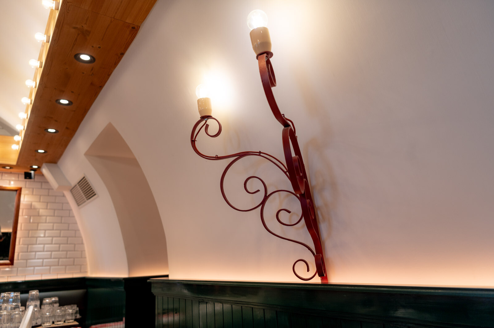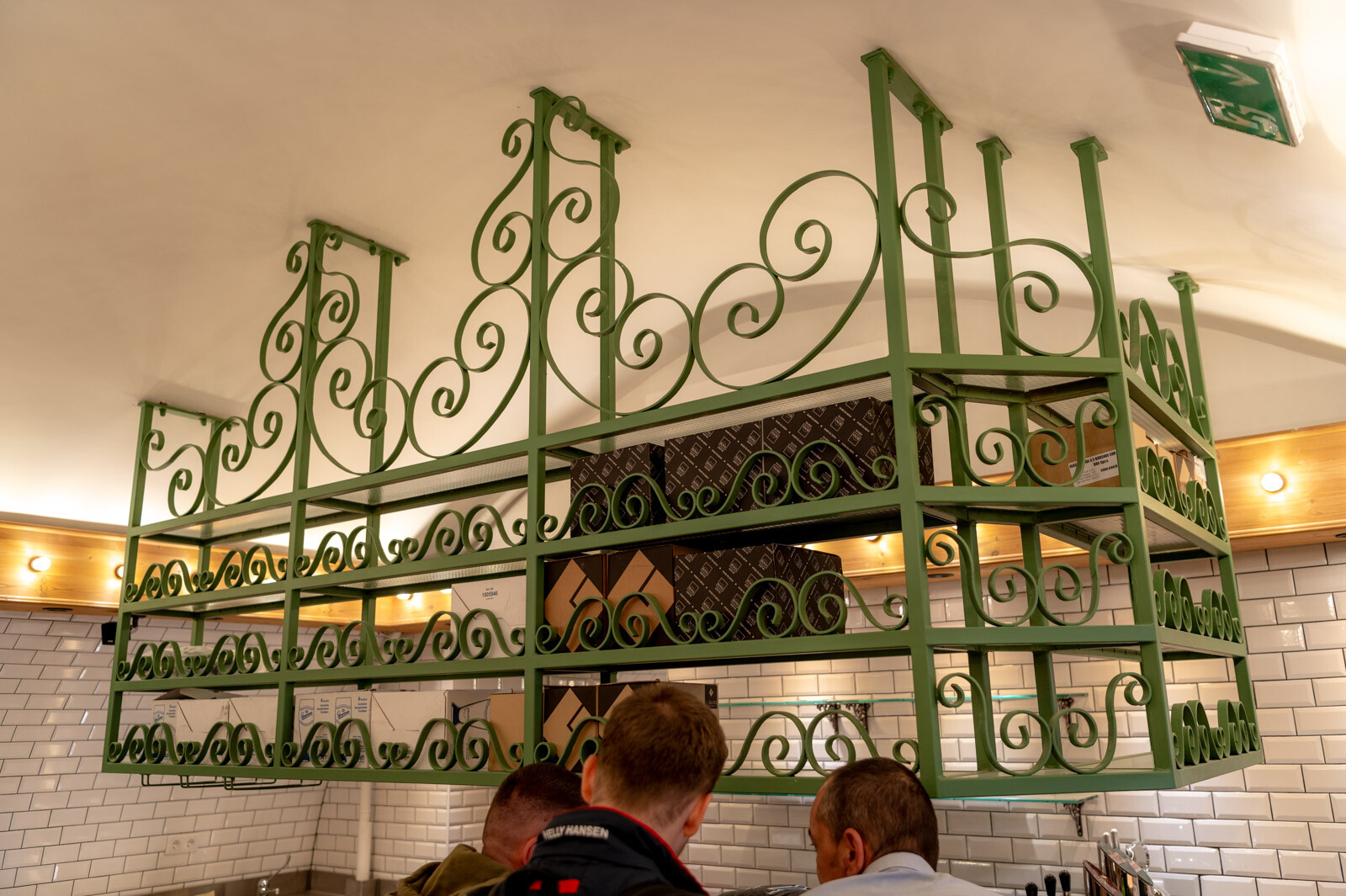 A bárpultnál egy nagy, szintén egyedi lakatos szerkezetből készült polcrendszert telepítettek. A csillárok és a bárpult feletti polc gépi és kézi erővel készült, így egy nagyon látványos, félig kovácsolt szerkezet jött létre.