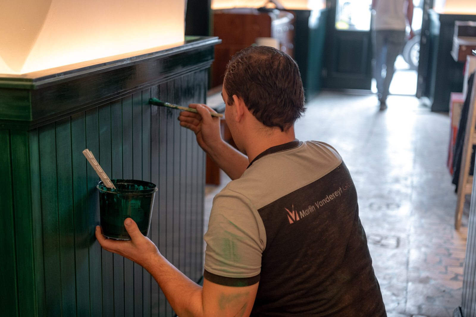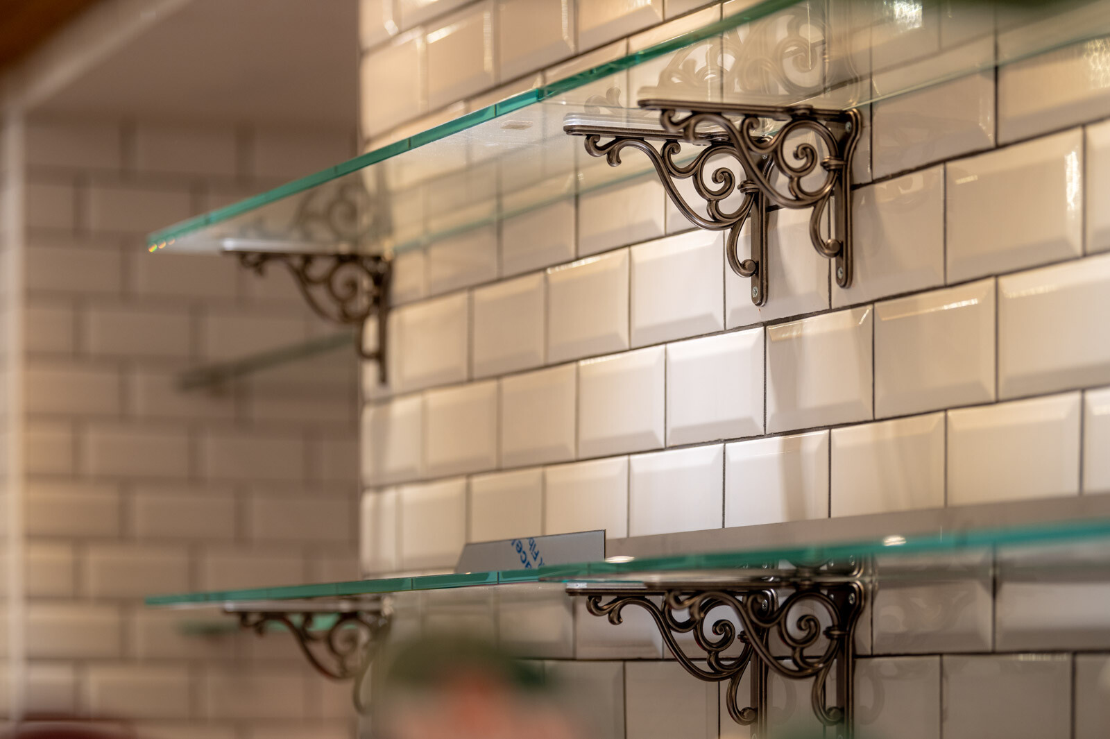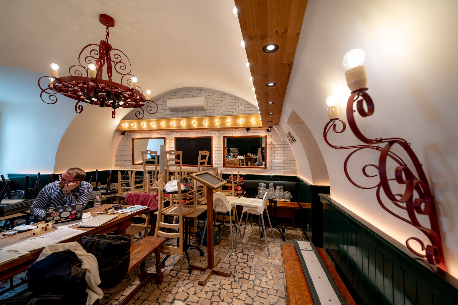 A bárpultnál egy nagy, szintén egyedi lakatos szerkezetből készült polcrendszert telepítettek. A csillárok és a bárpult feletti polc gépi és kézi erővel készült, így egy nagyon látványos, félig kovácsolt szerkezet jött létre.