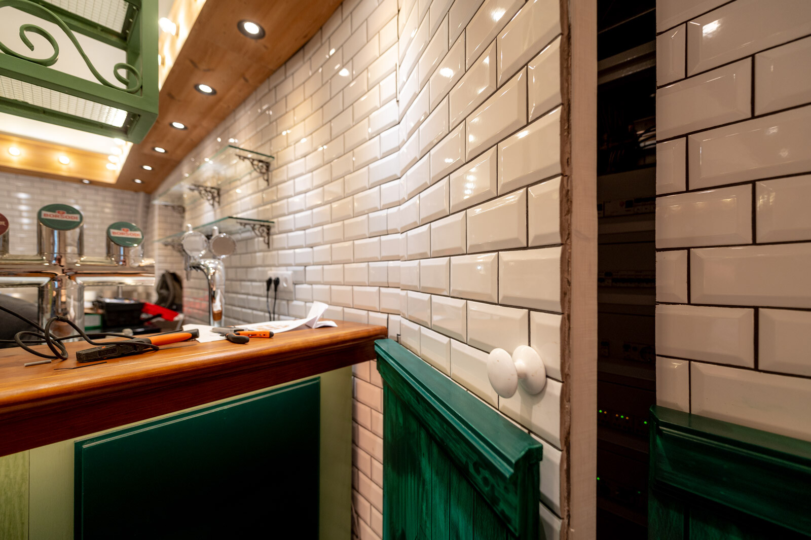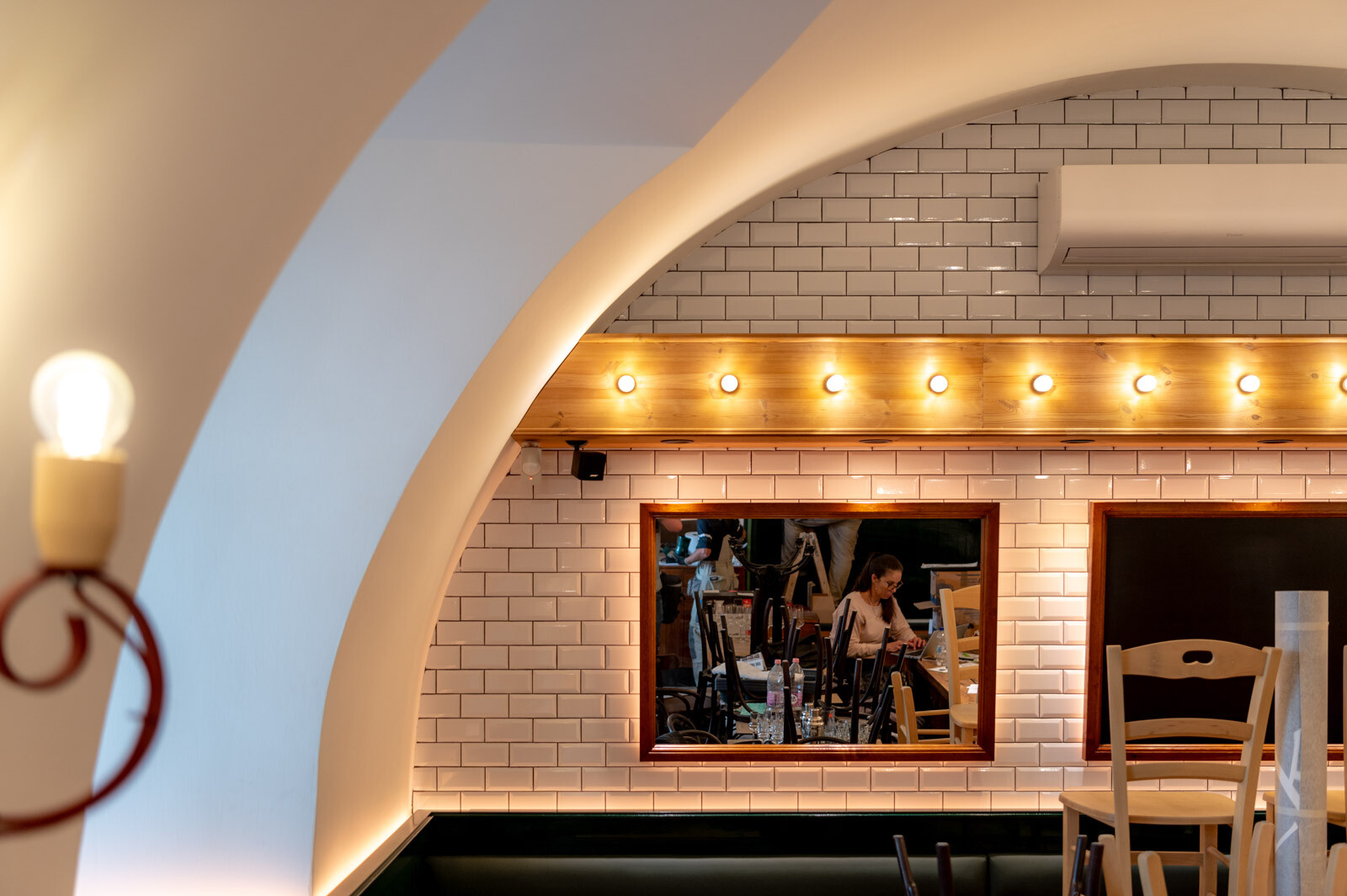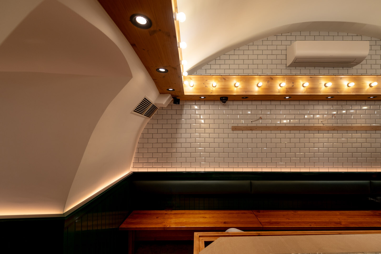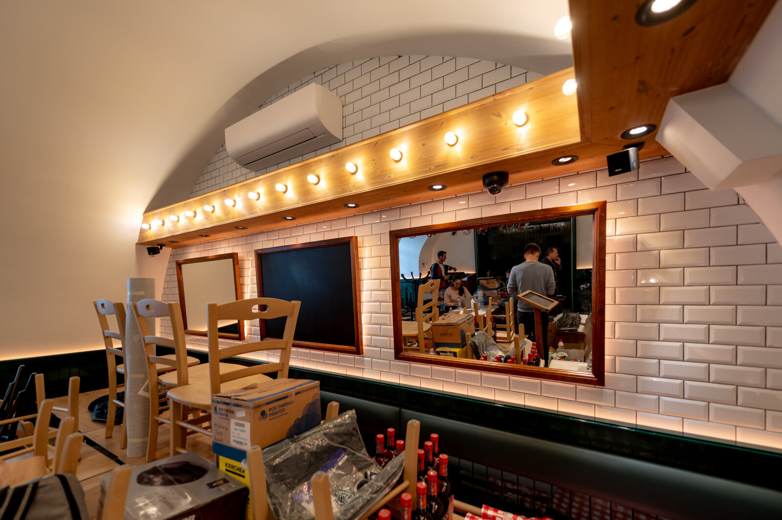 Külön kihívás volt a főző terület feletti légtechnikai vezetékek és gépészeti berendezések elvezetése a szabványoknak megfelelően, mivel új álmennyezetet is építettek.