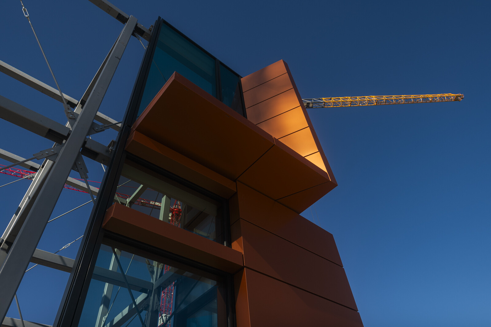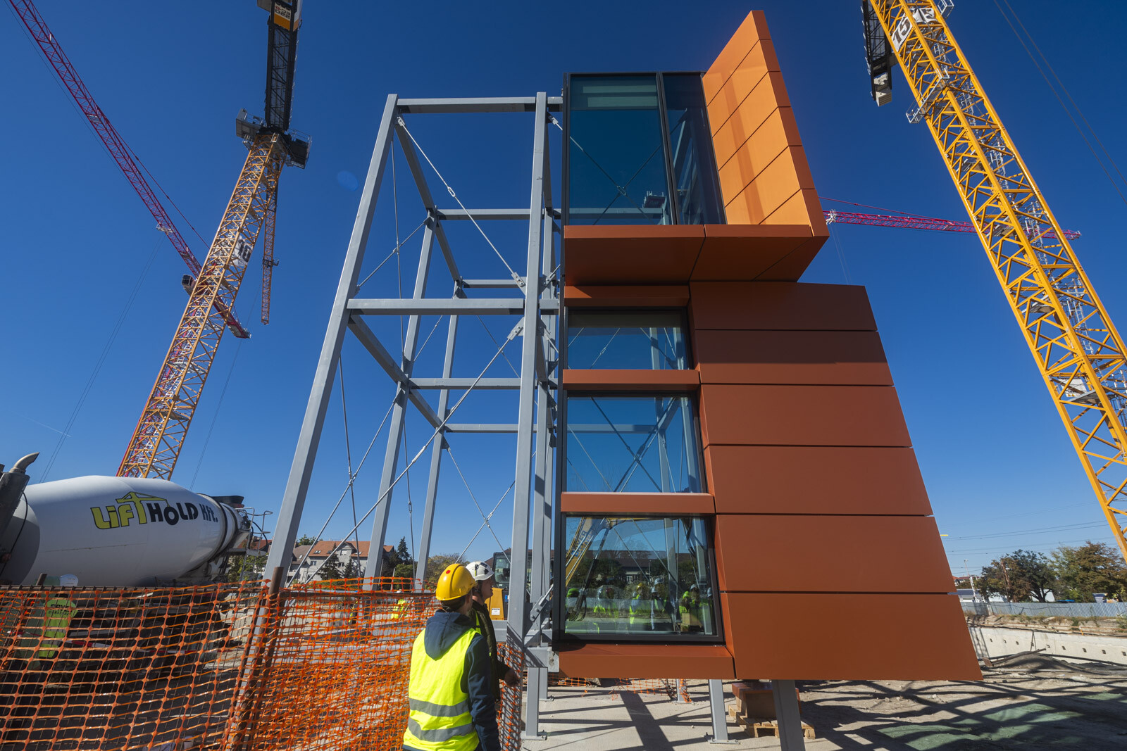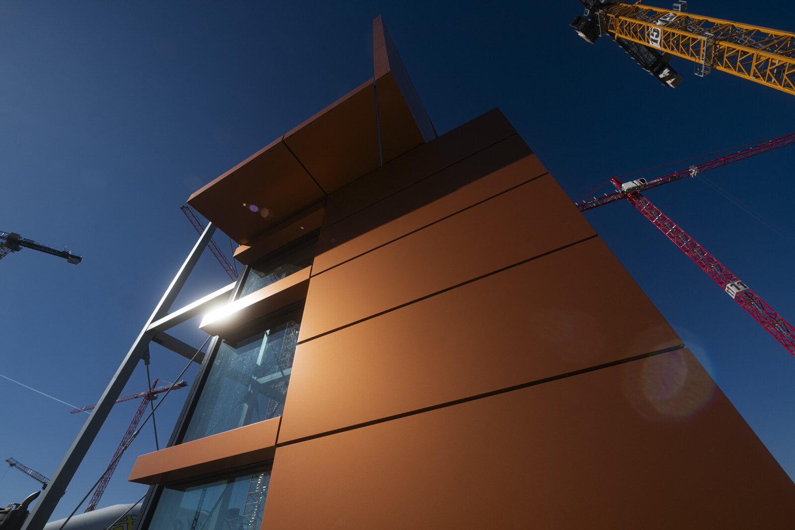 A ráeső fény hatására változatos színben mutatkoznak meg a ZVK projekt épülő irodaházai. A kivitelezést előre gyártott kompozit lemezekből álló homlokzatokkal gyorsítják fel.