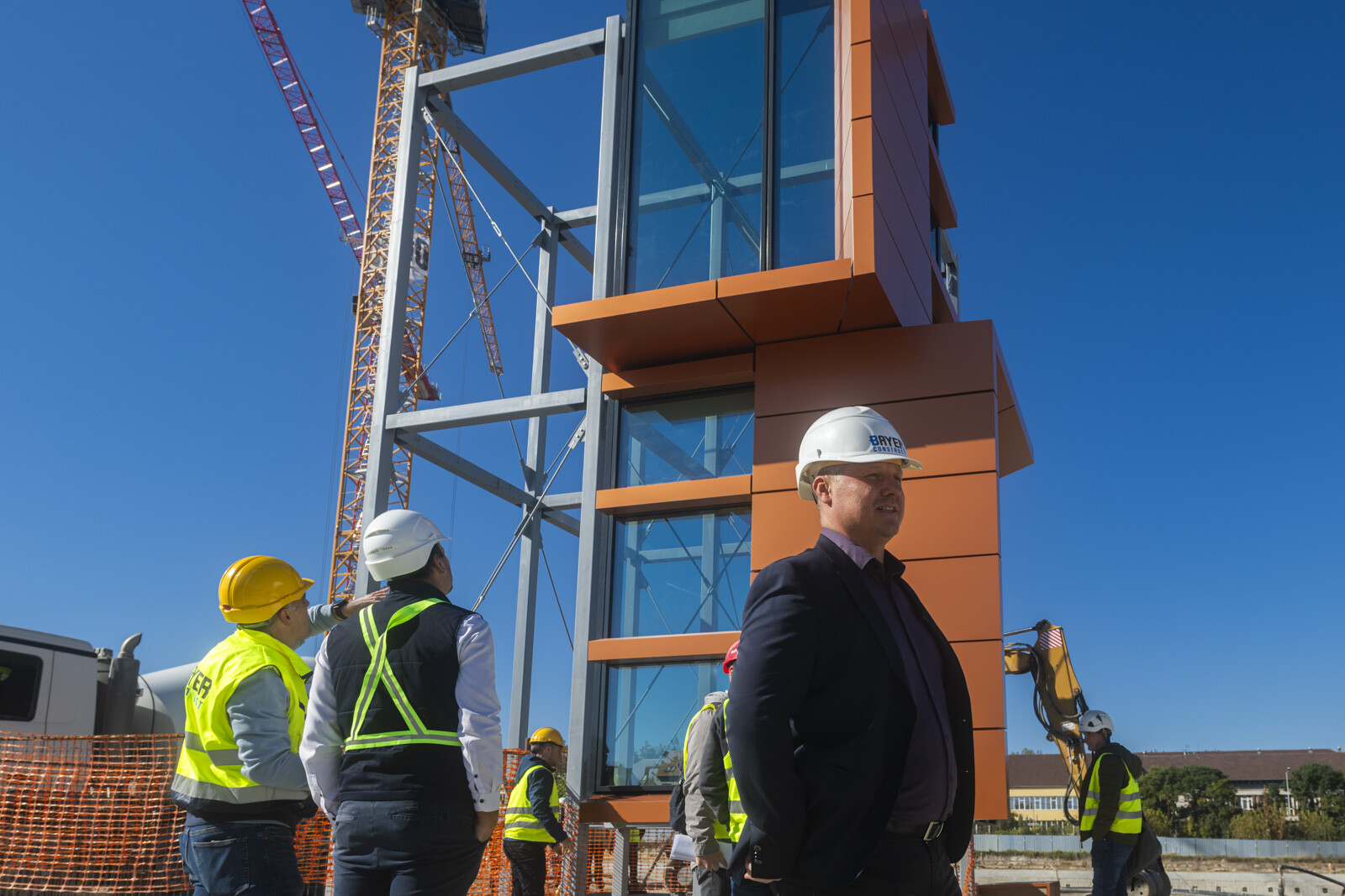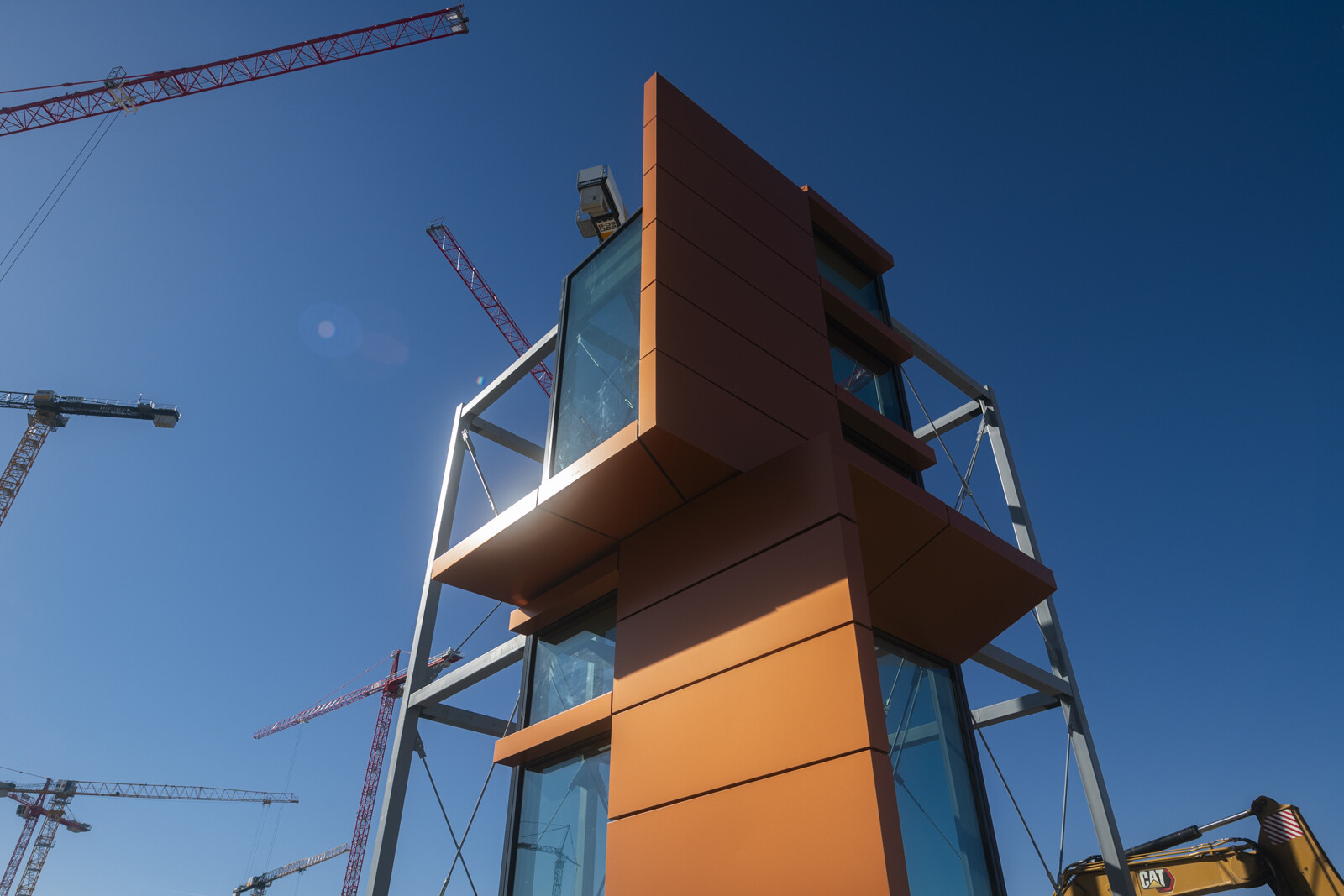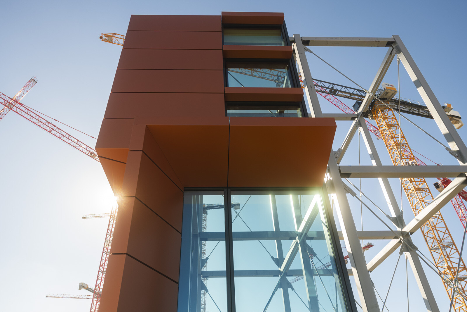 A ráeső fény hatására változatos színben mutatkoznak meg a ZVK projekt épülő irodaházai. A kivitelezést előre gyártott kompozit lemezekből álló homlokzatokkal gyorsítják fel.